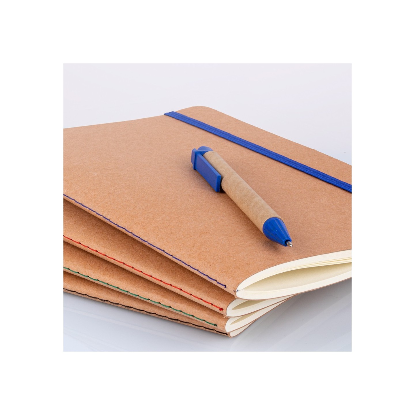 La Libreta A5 Loft va más allá al incluir un bolígrafo fabricado en fibra de trigo y pp, con un cuerpo en cartón kraft que complementa la estética sostenible. La tinta azul añade un toque de color, mientras que el cosido en el lomo en un tono a juego completa la armonía visual de este conjunto único.