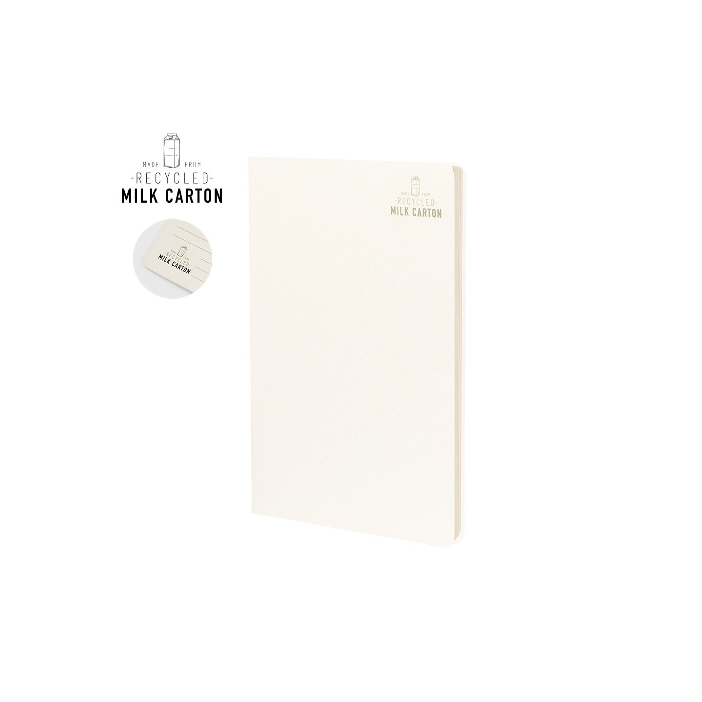 Libreta ecológica de cartones de leche reciclados, tapas blandas y 60 hojas. Ideal para empresas comprometidas con la sostenibilidad.