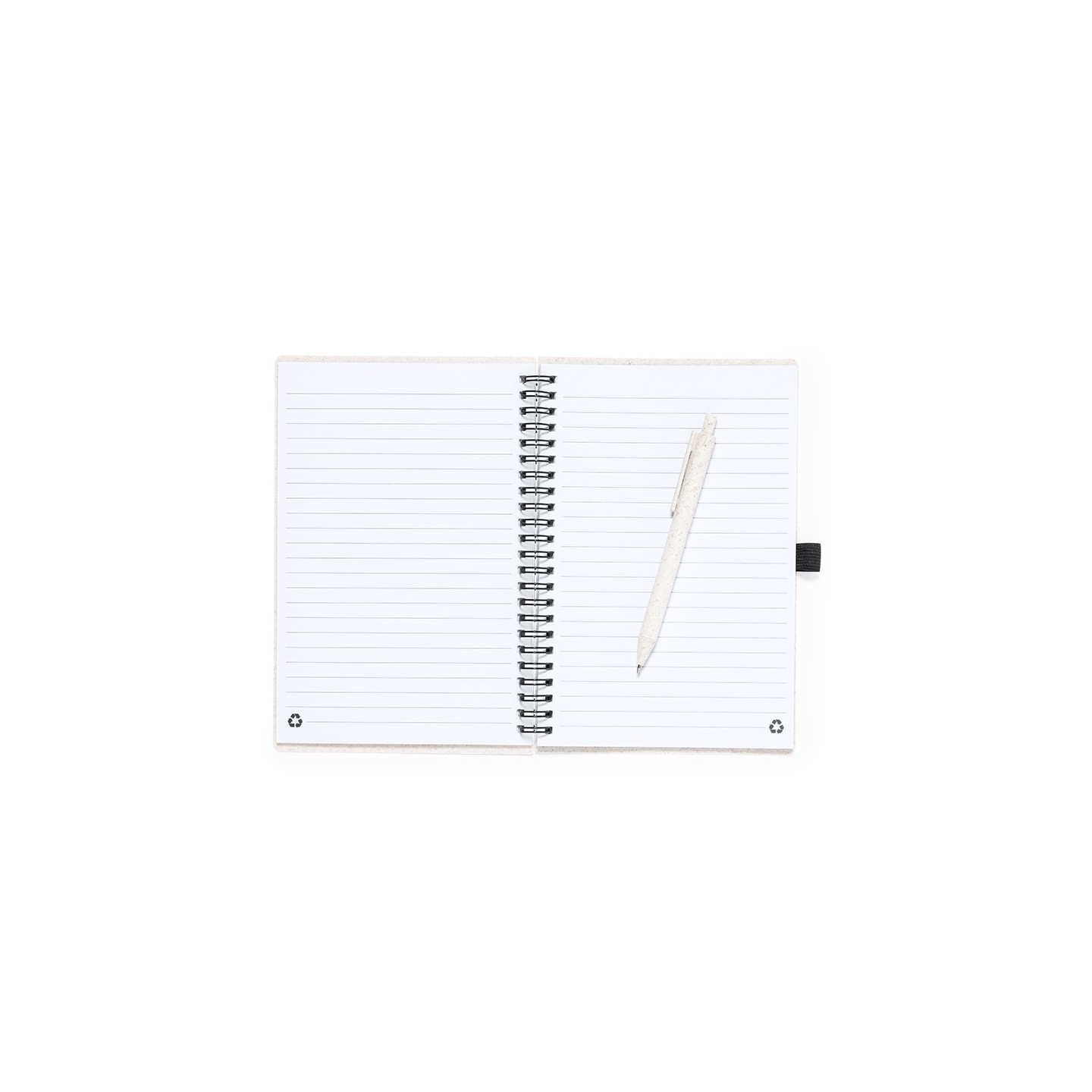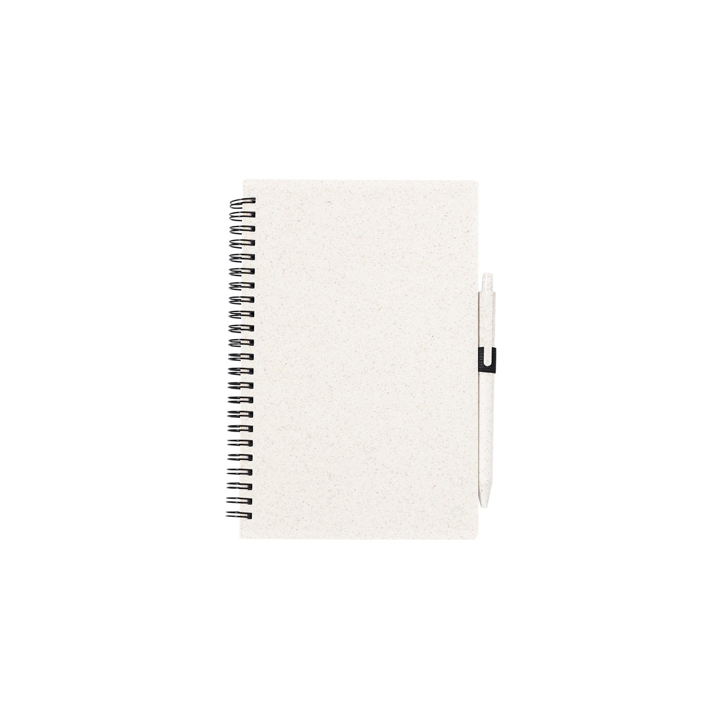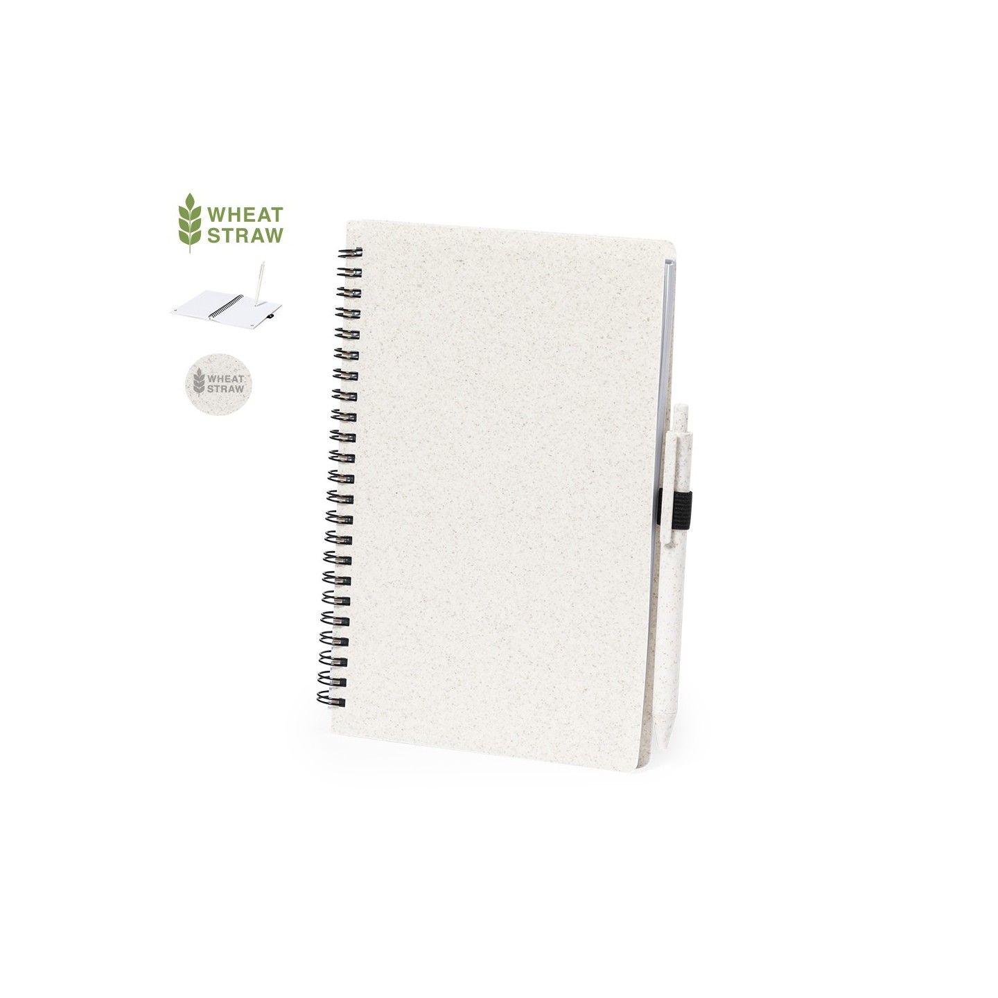 Con 80 hojas de diseño eco y disposición a una raya, la libreta promueve un estilo de vida sostenible. Además, el bolígrafo de mecanismo pulsador está fabricado con cuerpo en caña de trigo y tinta azul, resaltando el distintivo Wheat Straw tanto en la libreta como en el bolígrafo.
