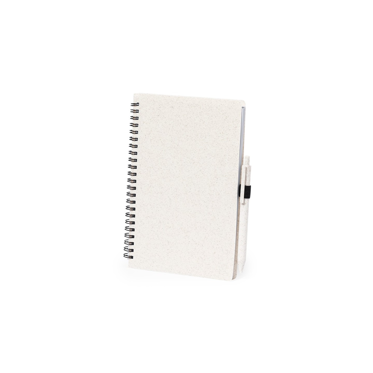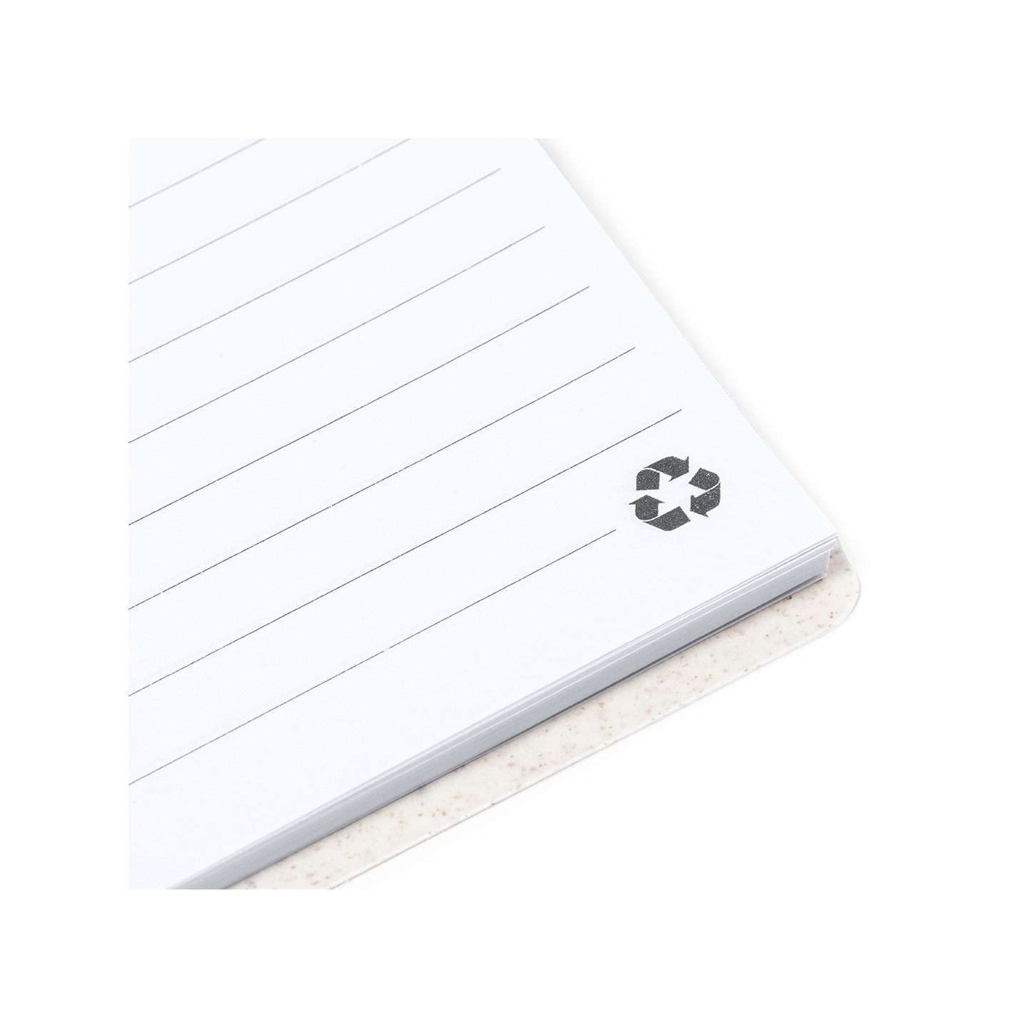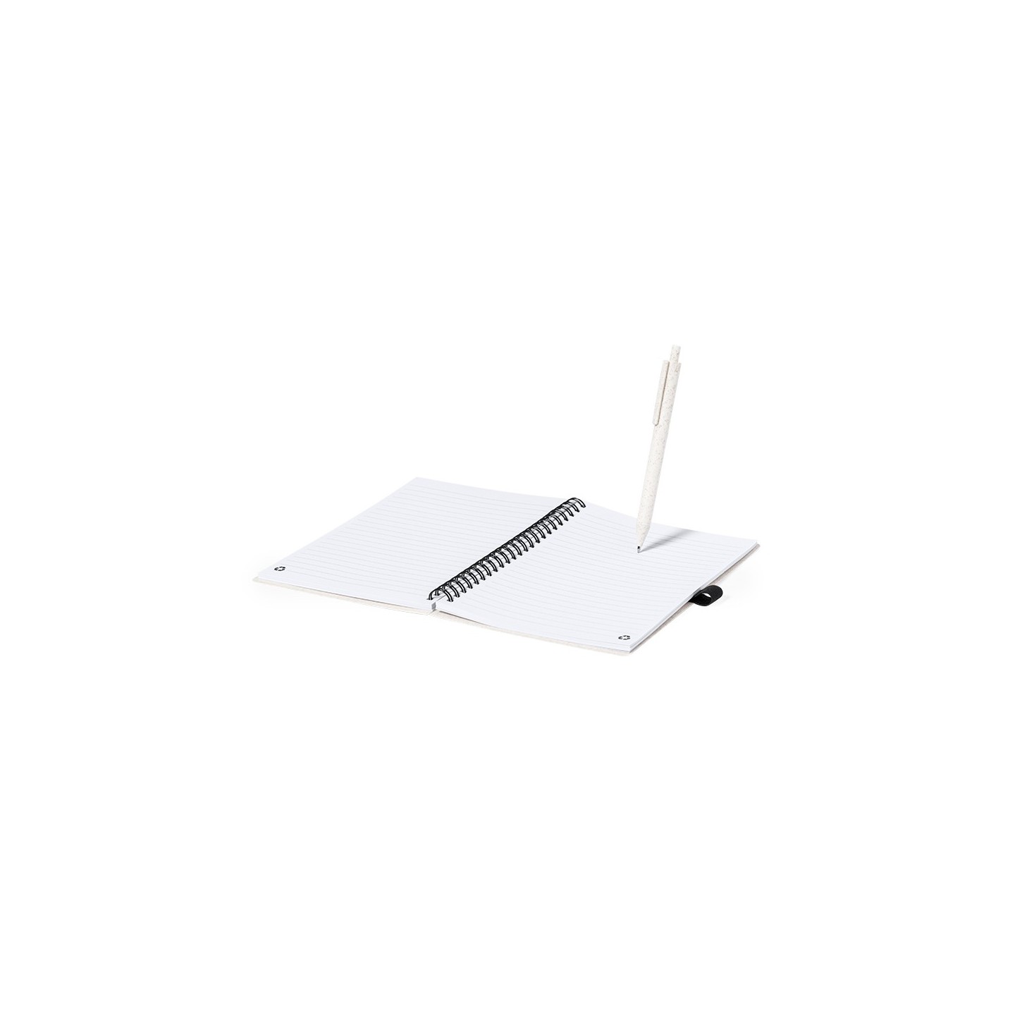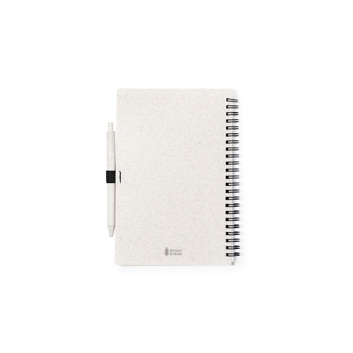 Con 80 hojas de diseño eco y disposición a una raya, la libreta promueve un estilo de vida sostenible. Además, el bolígrafo de mecanismo pulsador está fabricado con cuerpo en caña de trigo y tinta azul, resaltando el distintivo Wheat Straw tanto en la libreta como en el bolígrafo.