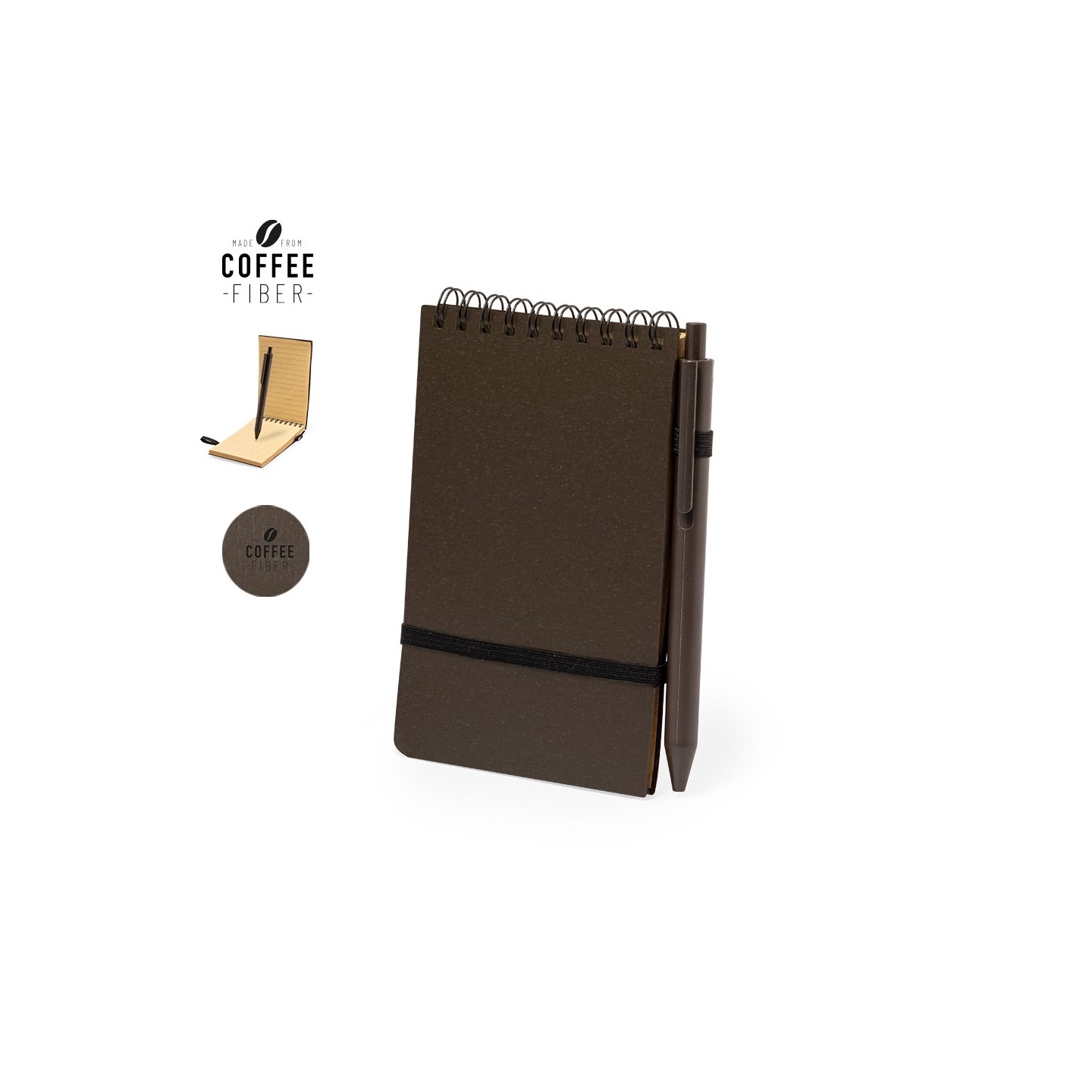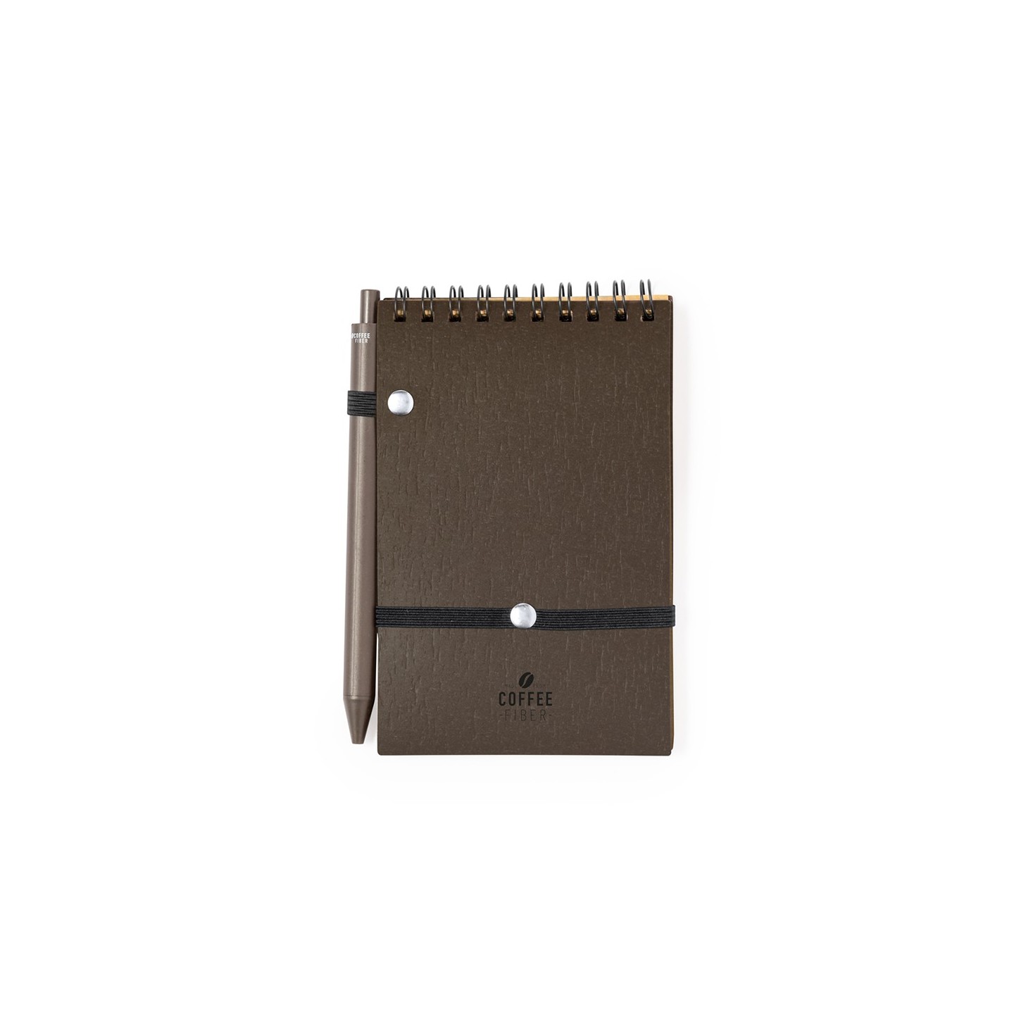 Pero lo más destacado de este set es el logotipo de fibra de café, impreso tanto en la libreta como en el bolígrafo. Este detalle no solo añade un toque de personalización, sino que también demuestra tu compromiso con la sostenibilidad y el cuidado del medio ambiente.