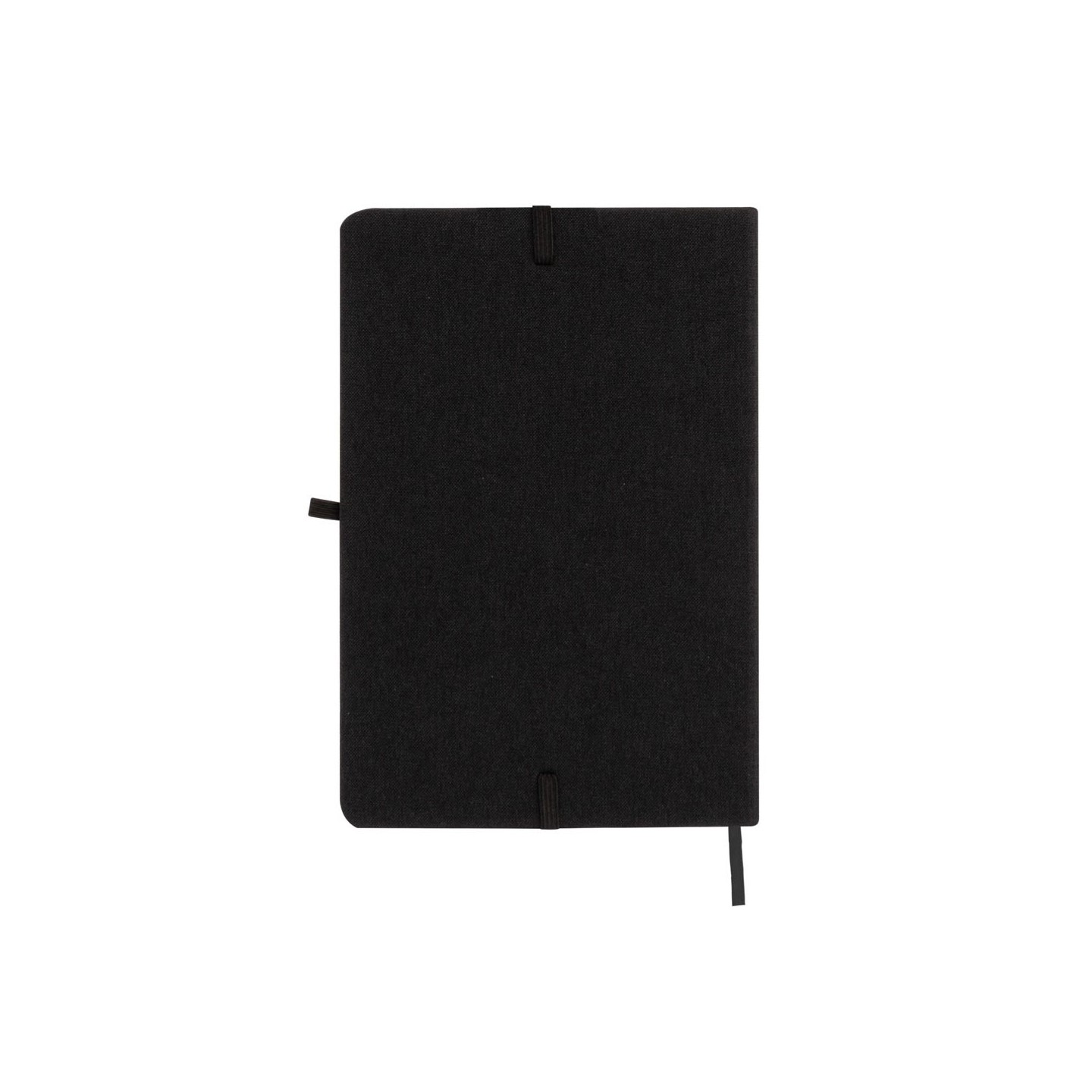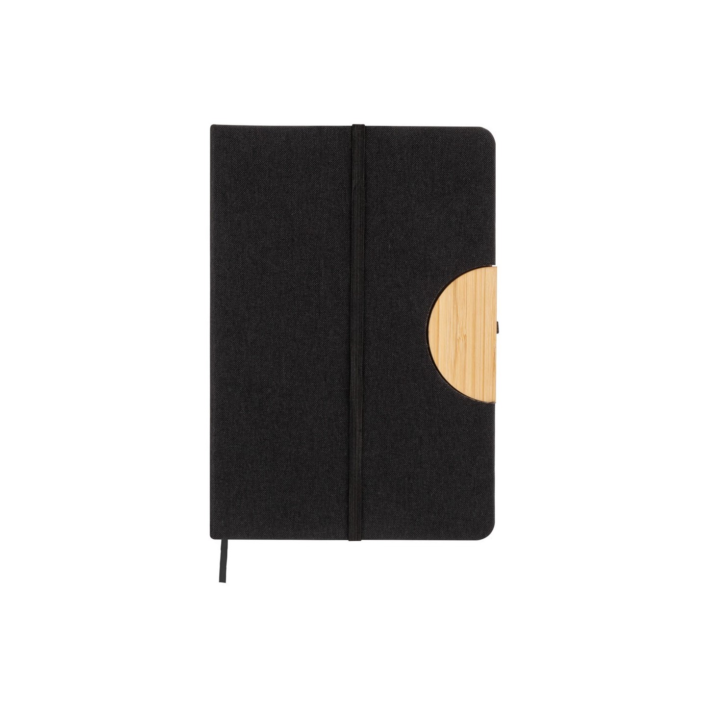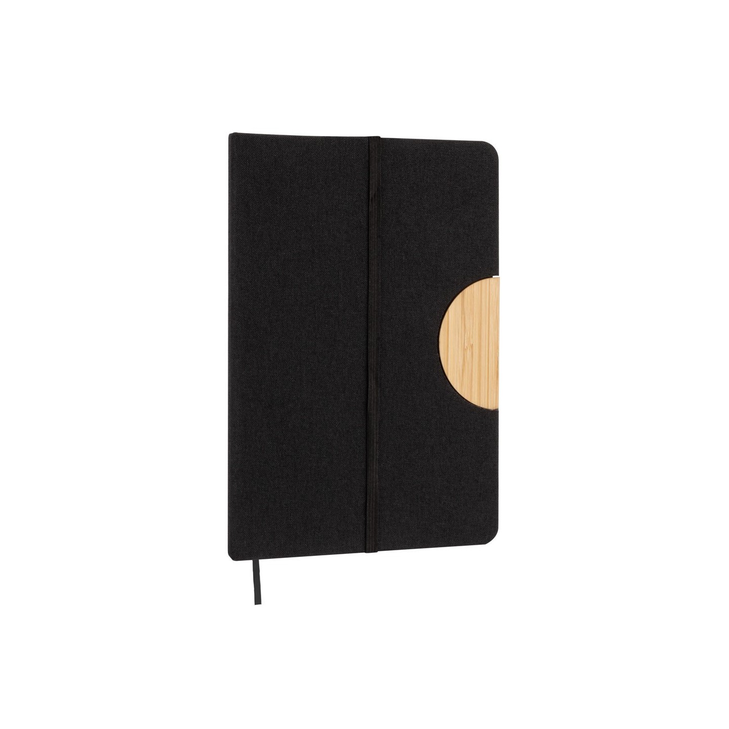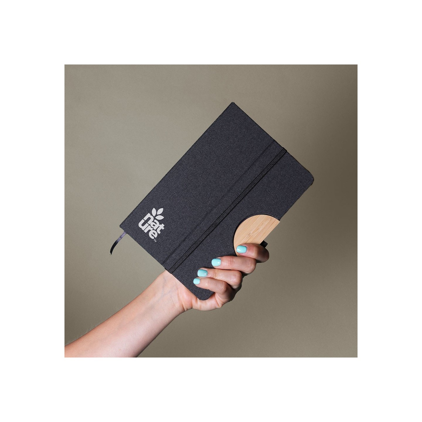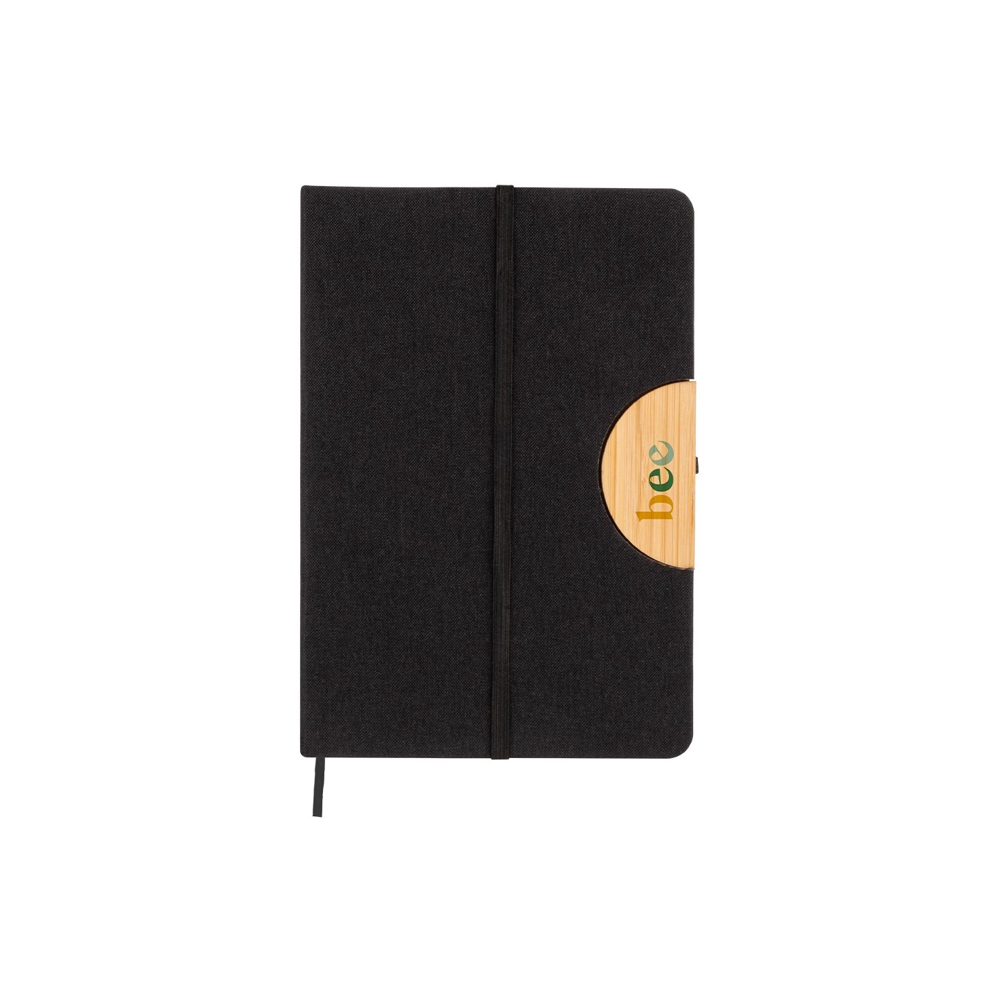 Libreta A5 de RPET reciclado con tapa de bambú, 80 hojas lisas, marcapáginas, soporte para smartphone y bolígrafo. Personalizable con tu logo.