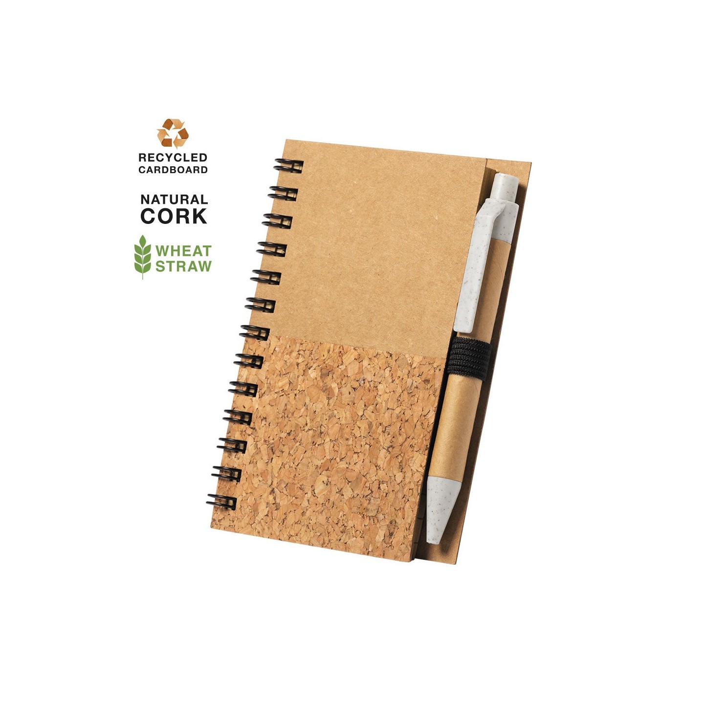 El Set Libreta Sulax es de diseño nature con tapas de corcho y cartón reciclado, bolígrafo eco-friendly. Estilo y sostenibilidad en uno.