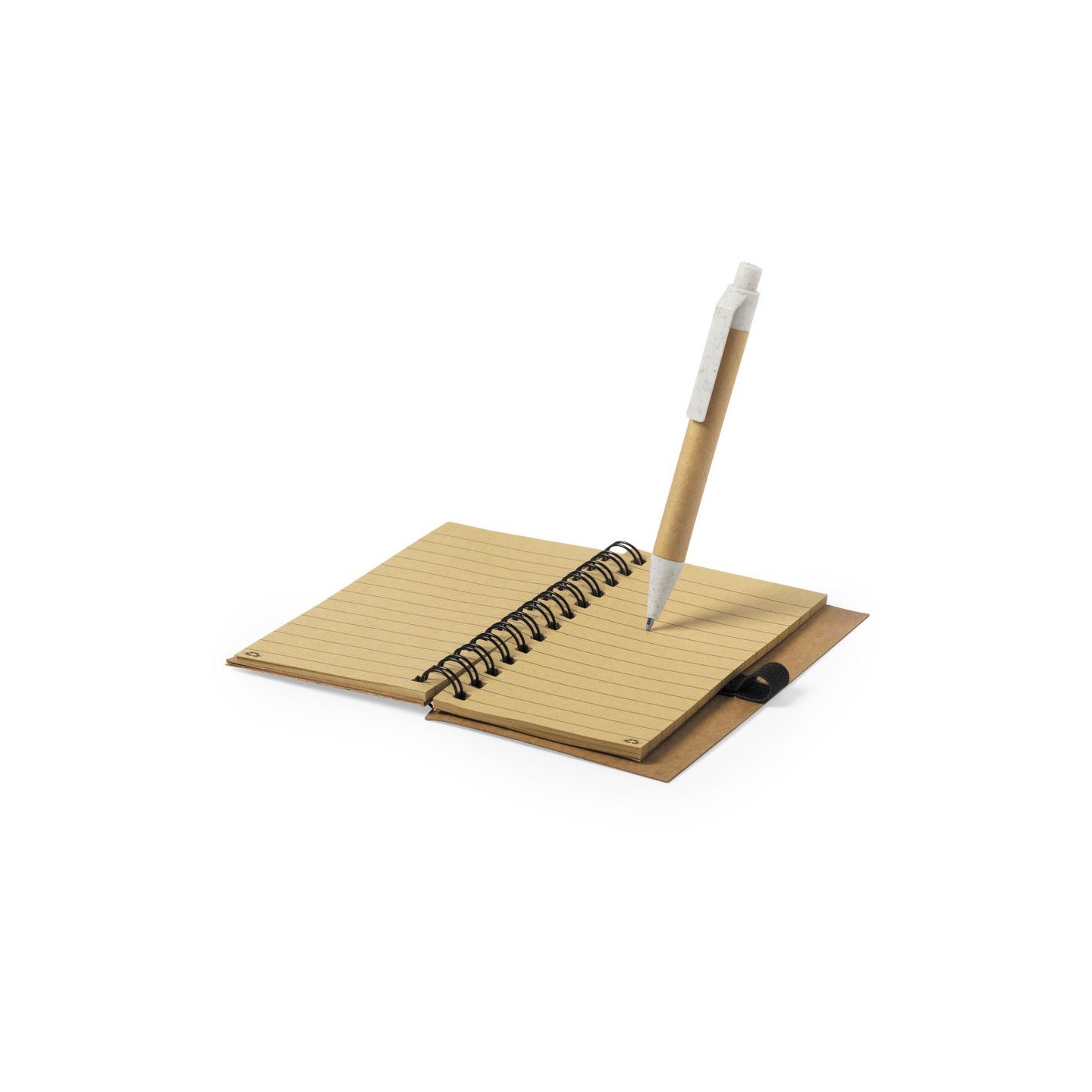 El corcho natural utilizado en las tapas de la libreta es un material versátil y eco-friendly, que se extrae de forma sostenible sin dañar los árboles. Por otro lado, el cartón reciclado utilizado en las tapas y el cuerpo del bolígrafo proviene de materiales reciclados, reduciendo la necesidad de recursos naturales y evitando la generación de residuos innecesarios.