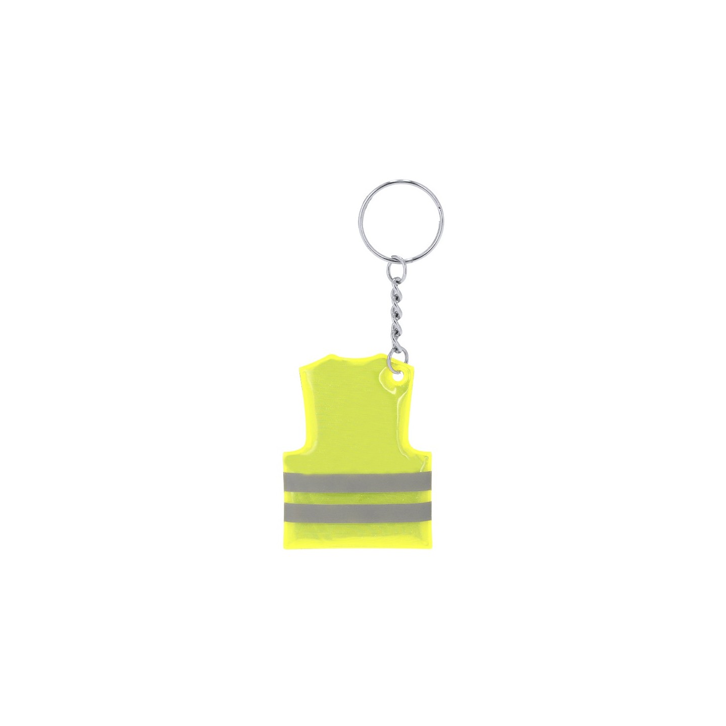 Llavero chaleco de obra reflectante en PVC, ideal para empresas de construcción. Personalizable con tu logotipo. Compacto y práctico.