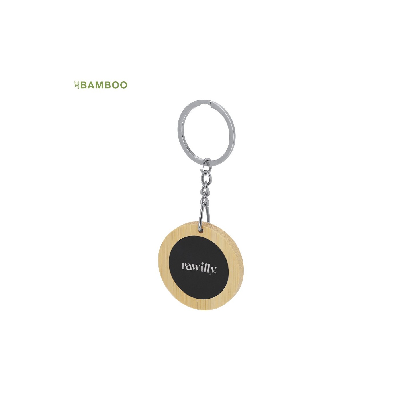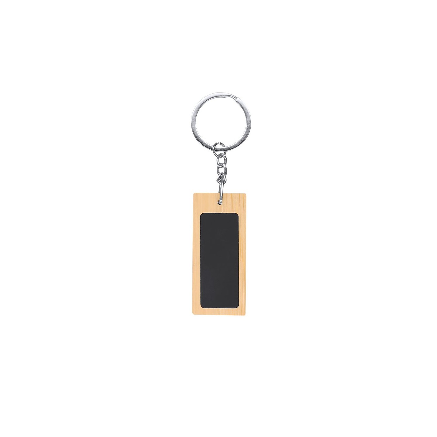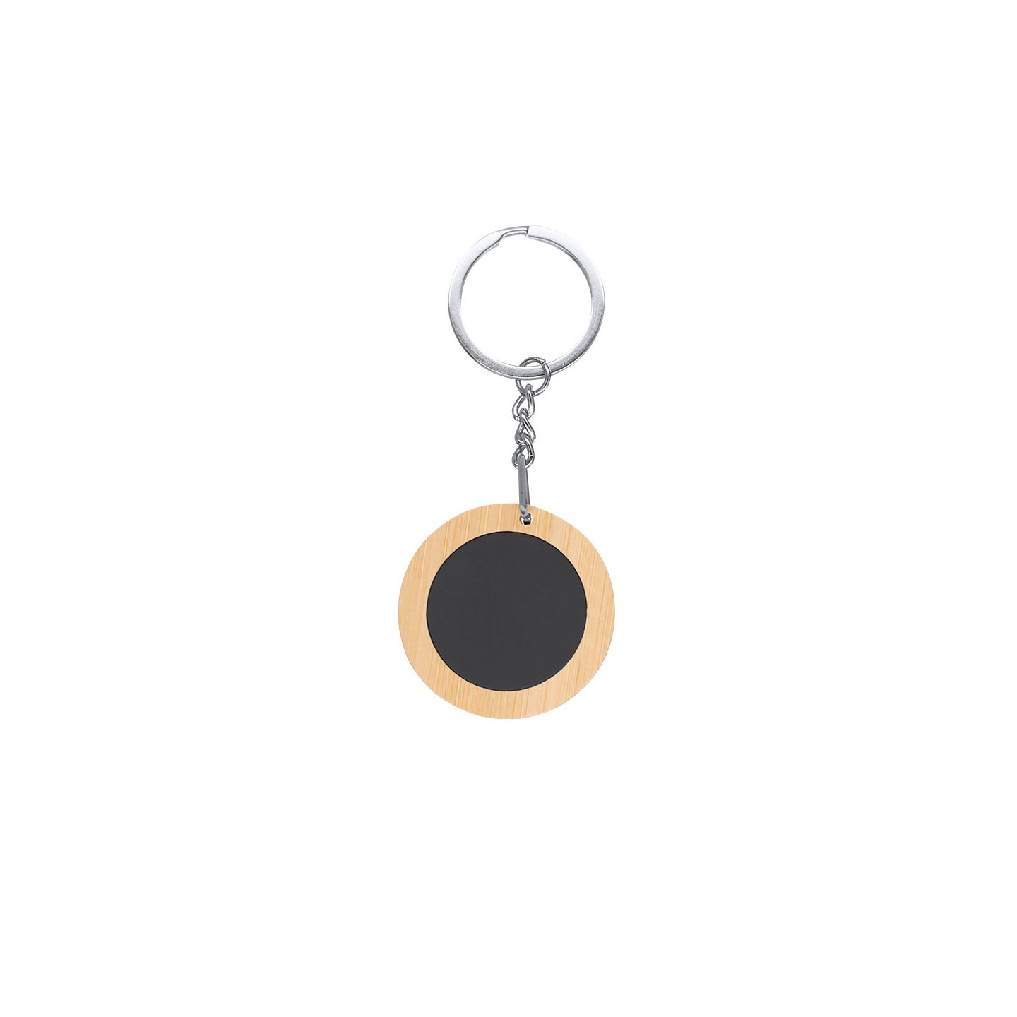 Llavero KHOZAX en bambú y metal, disponible en formas circular y rectangular. Con área en acabado gomoso para grabado láser. Personalizable con tu logotipo.