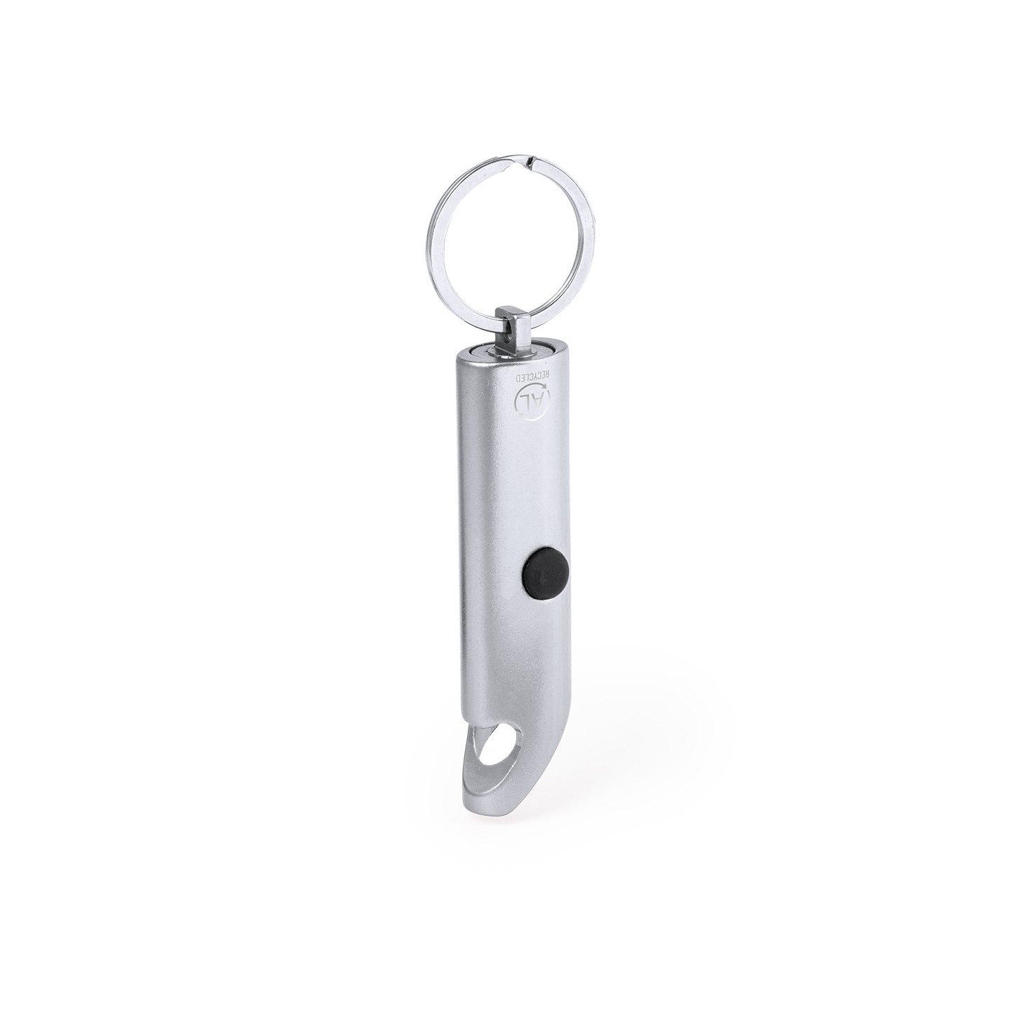 Llavero abridor con linterna de Aluminio Reciclado, personalizable con tu logo. 3 luces LED y práctico diseño en caja kraft