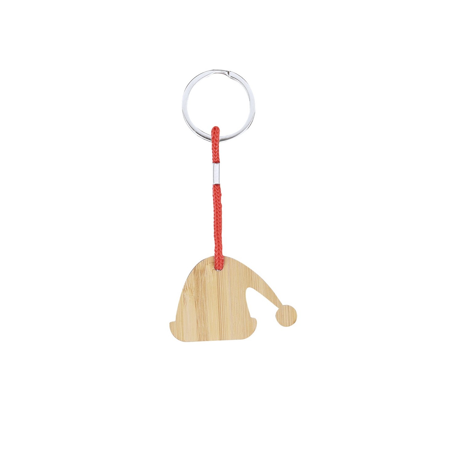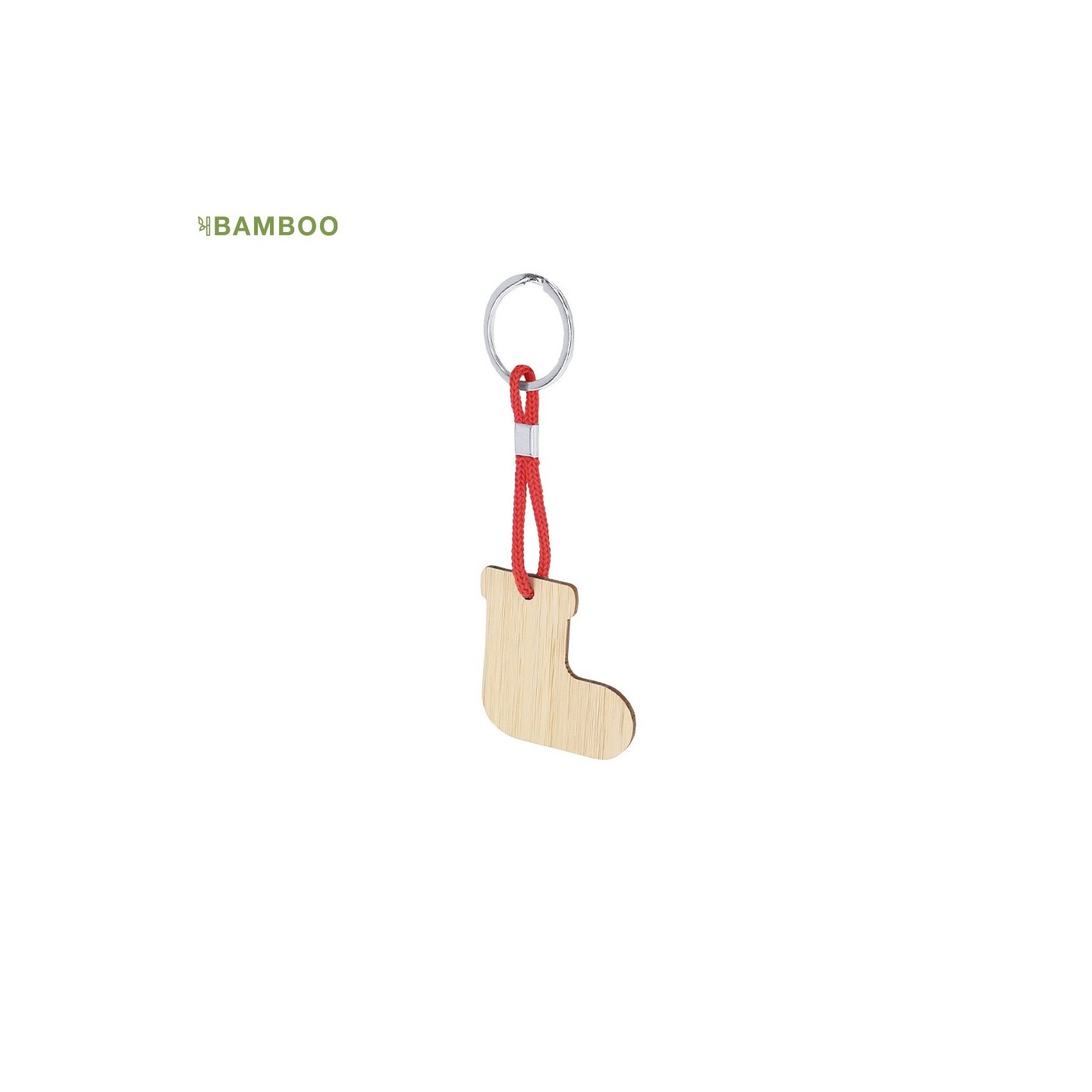 Llavero navideño fabricado en bambú, disponible en 4 diseños: Reno, Gorro Papá Noel, Árbol y Calcetín. Personalizable con el logotipo de tu empresa. Sostenible y elegante, perfecto para regalos corporativos.