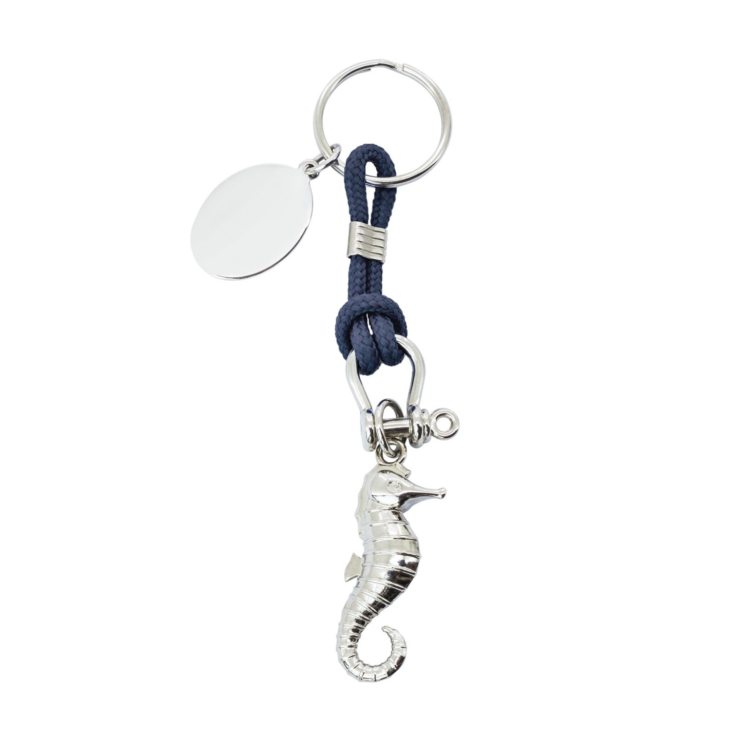Llavero caballito de mar plateado con cuerda azul, fabricado en metal. Ideal para los amantes del mar. Incluye chapa para marcar a láser.