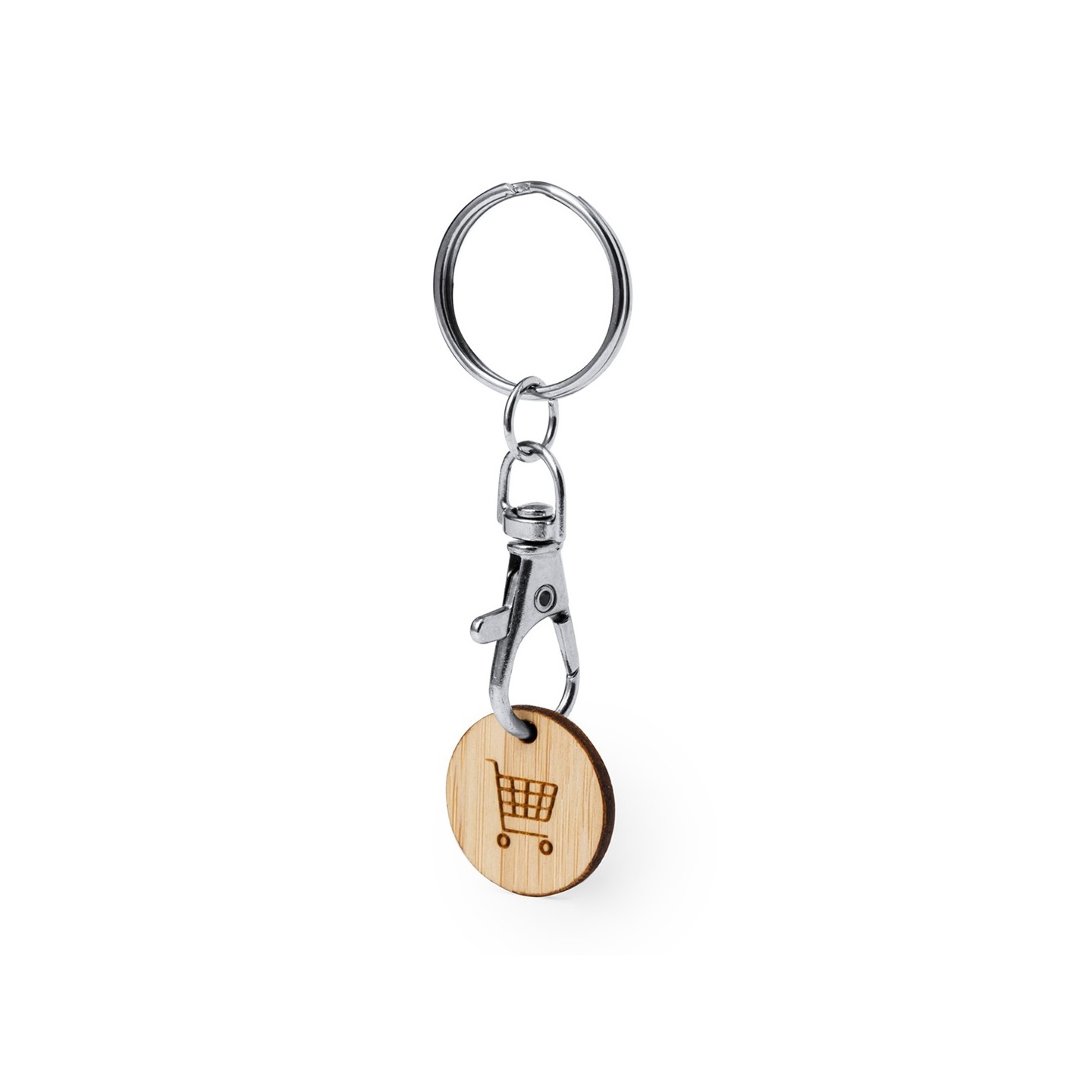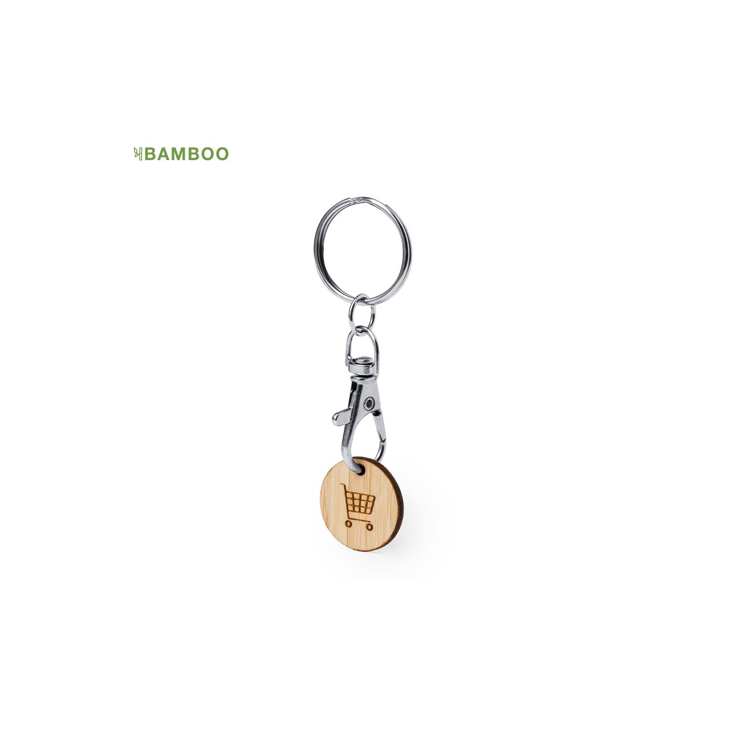 Con un cierre de mosquetón giratorio y una anilla para llaves, este llavero ofrece comodidad y seguridad en un diseño compacto. Pero lo que realmente lo distingue es la moneda fabricada en bambú que incluye, con un grabado en forma del carro de la compra.