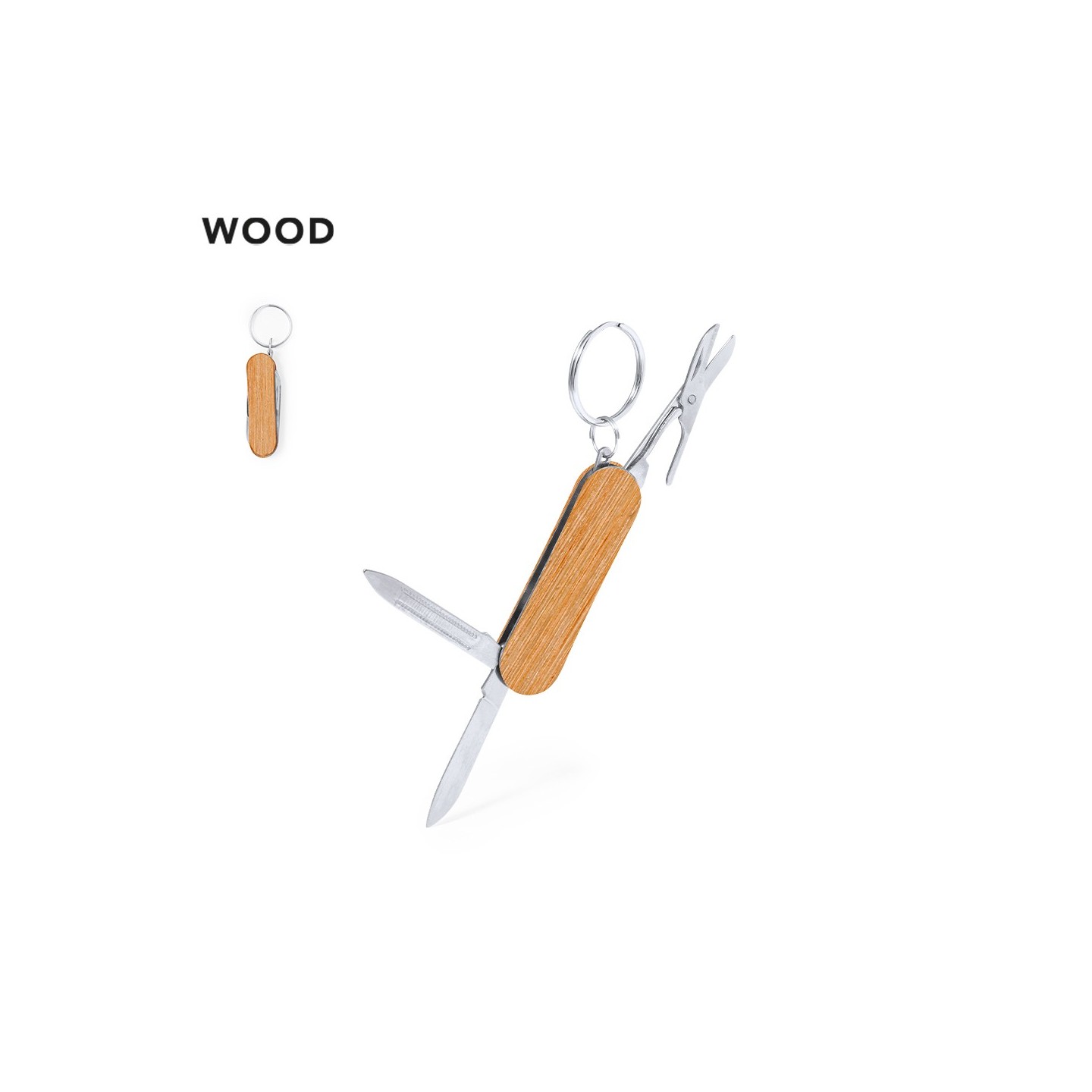 El Llavero Multiherramienta Famke es compacto y versátil, con tijeras, cuchillo y lima. Carcasa de madera natural. Ideal para regalos corporativos. Personalizable