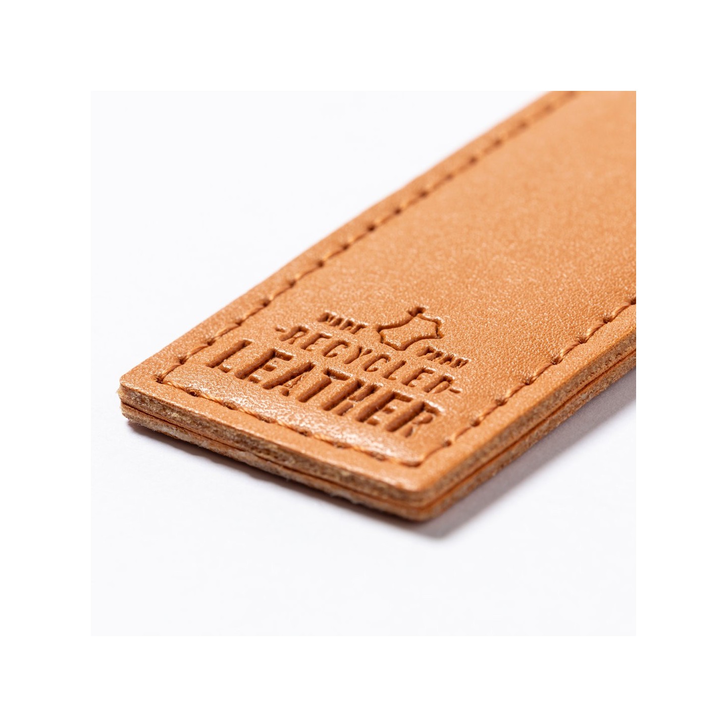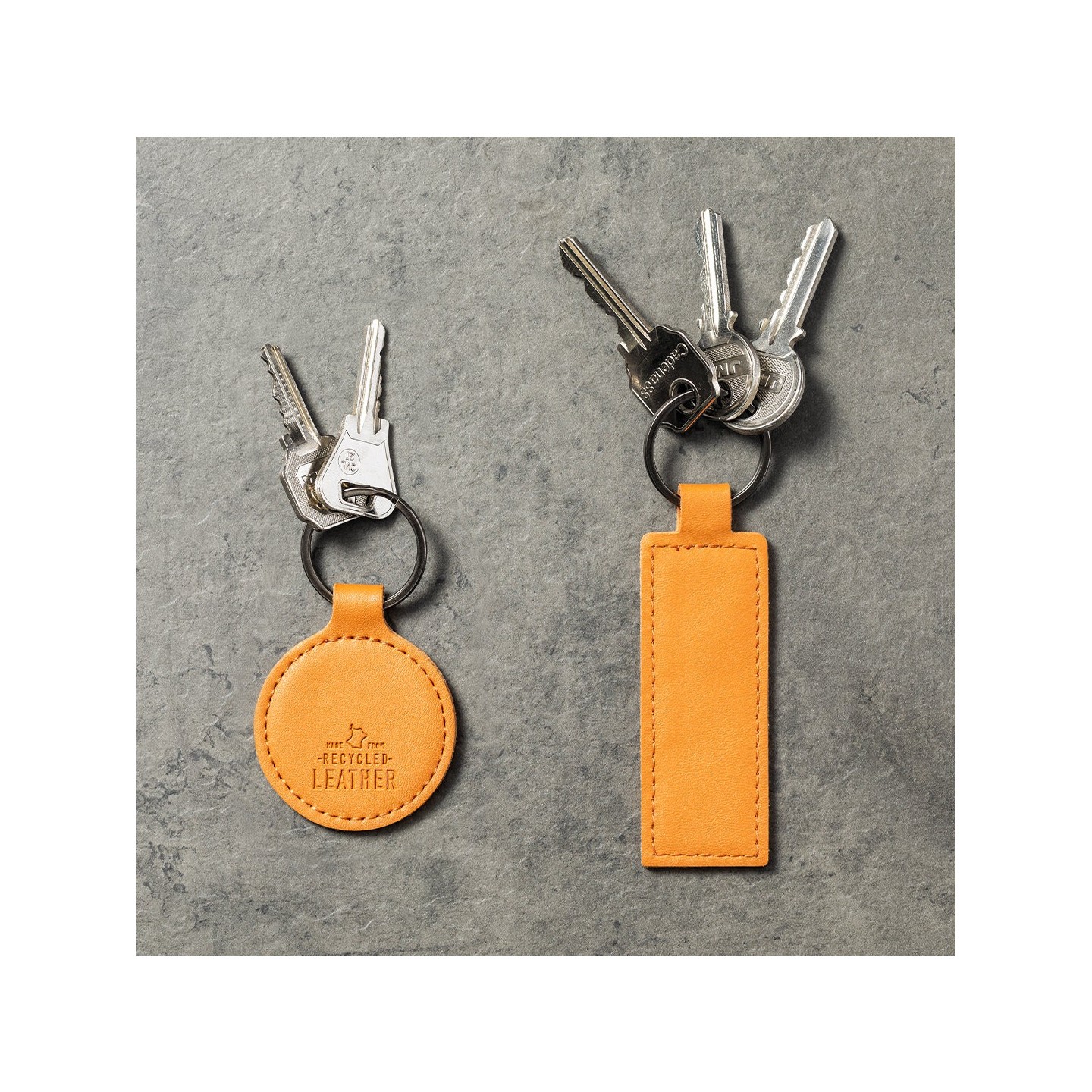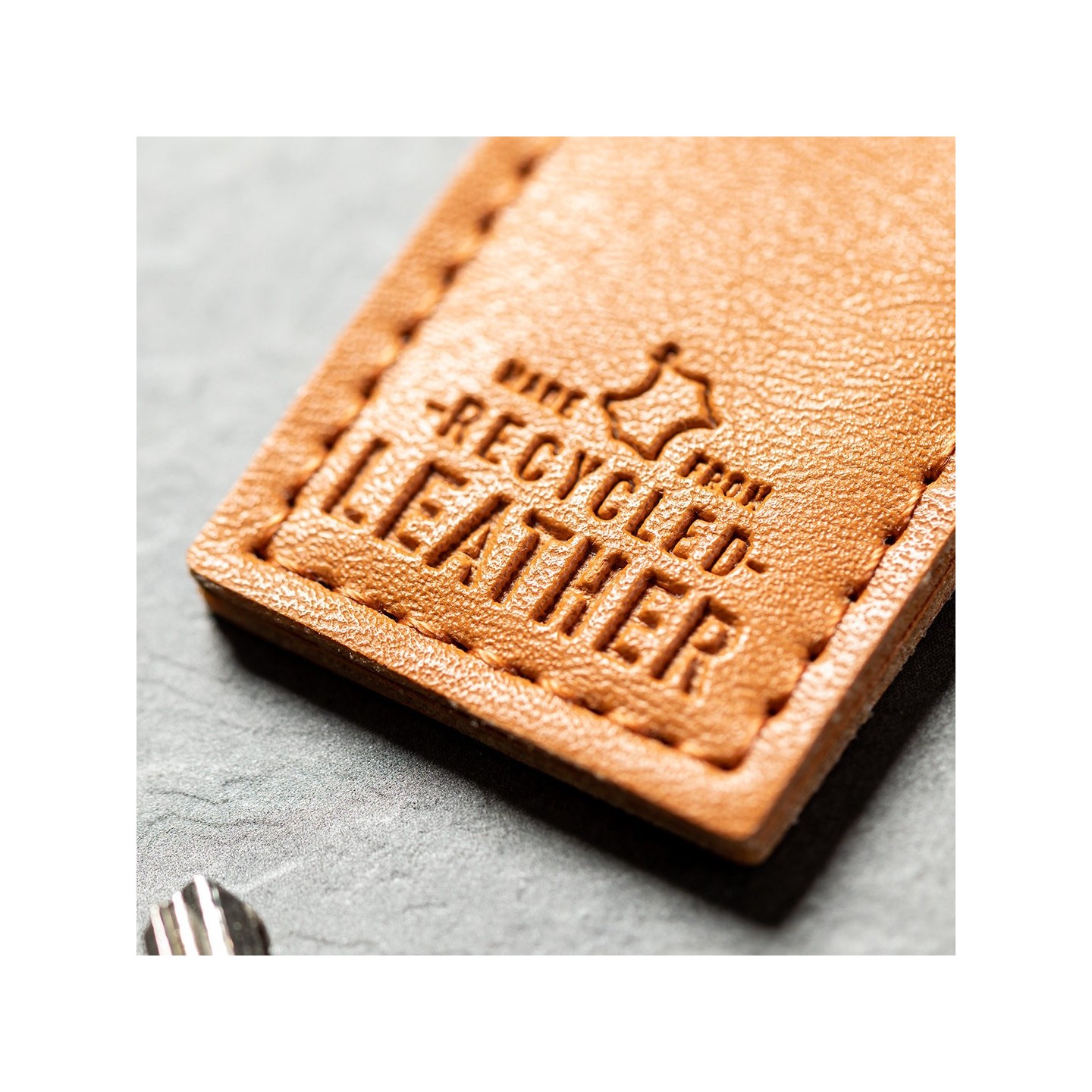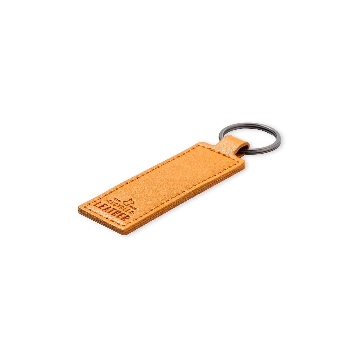 Este llavero presenta una cara grabada con el distintivo cuero reciclado, mientras que el lado opuesto ofrece una superficie lisa ideal para impresiones personalizadas. La anilla metálica cromada asegura la sujeción de tus llaves de manera segura y práctica.