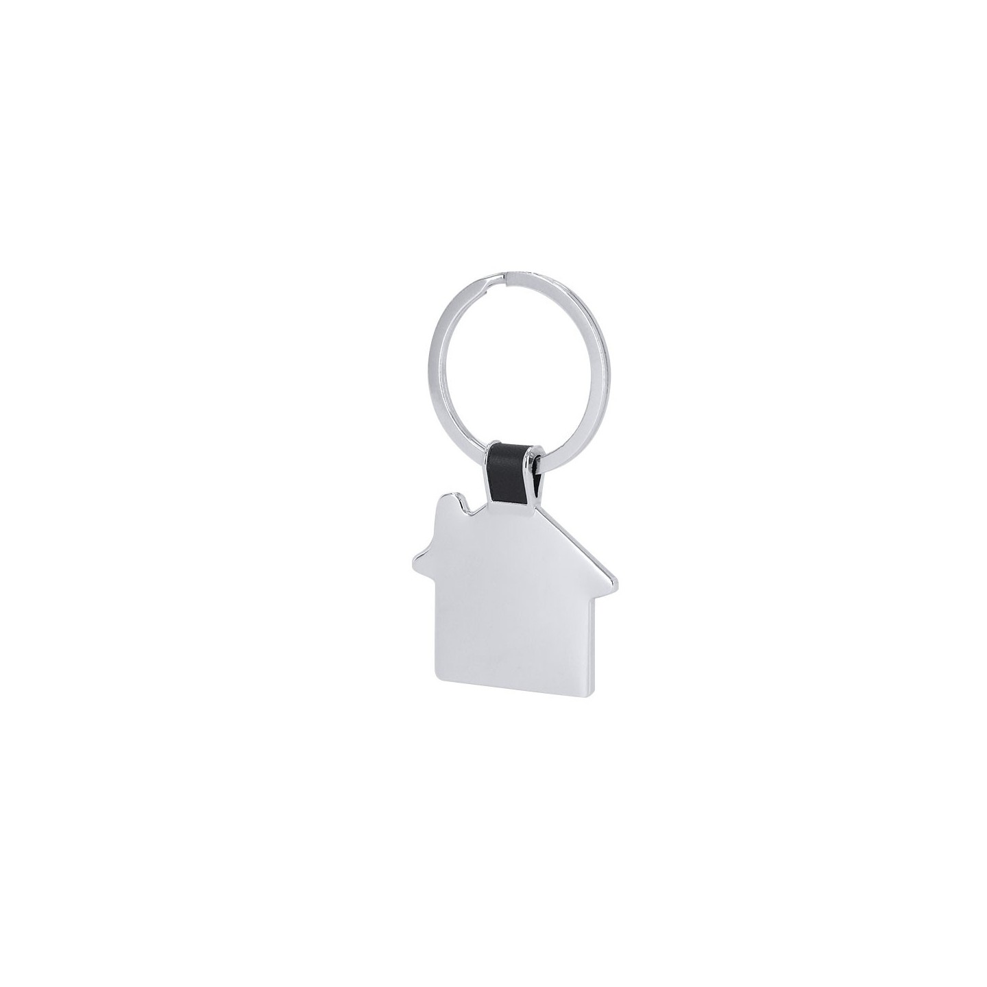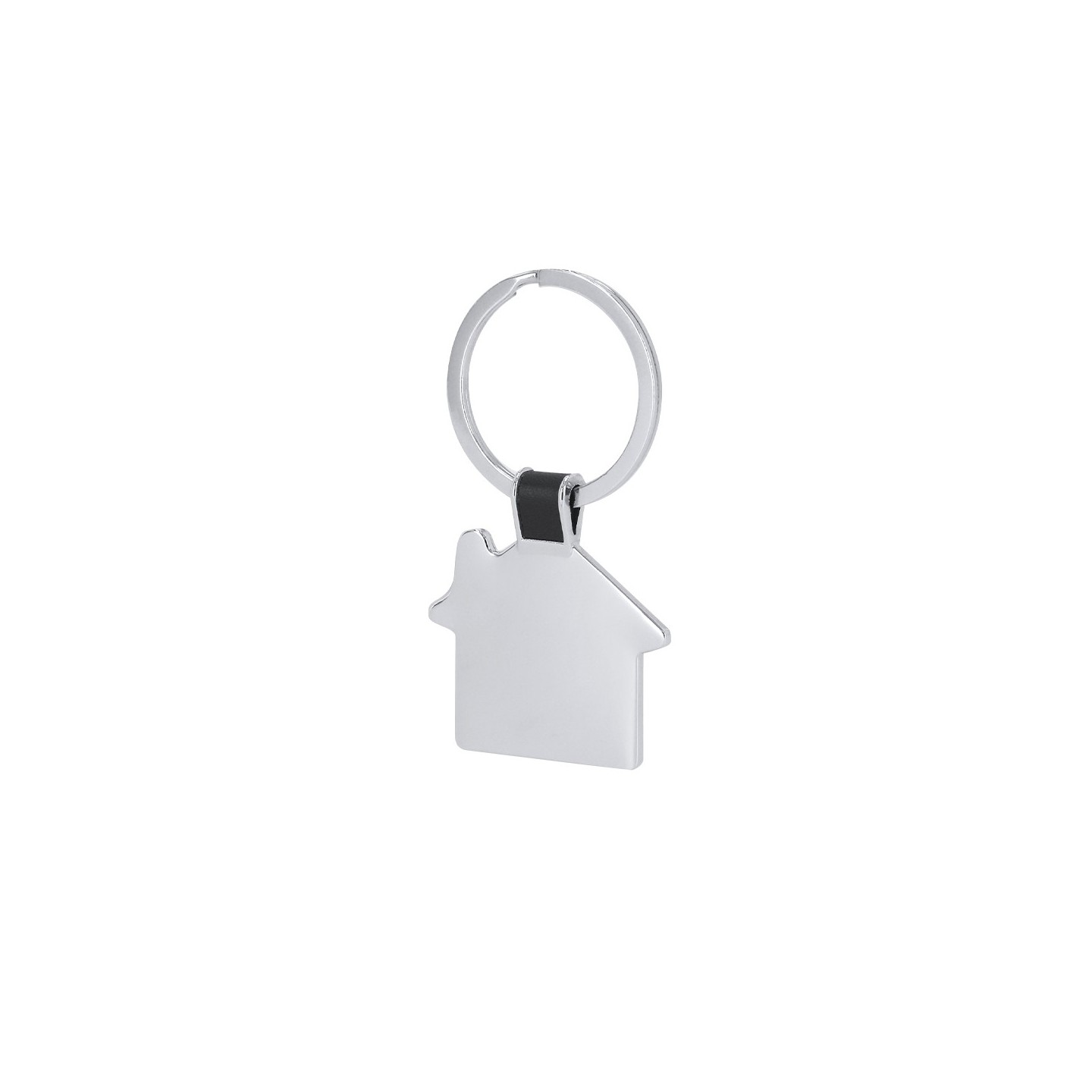 Llavero NYRELLA metálico con diseño de casa y detalle negro. Ideal para agencias inmobiliarias y empresas de construcción, personalizable con tu logotipo.