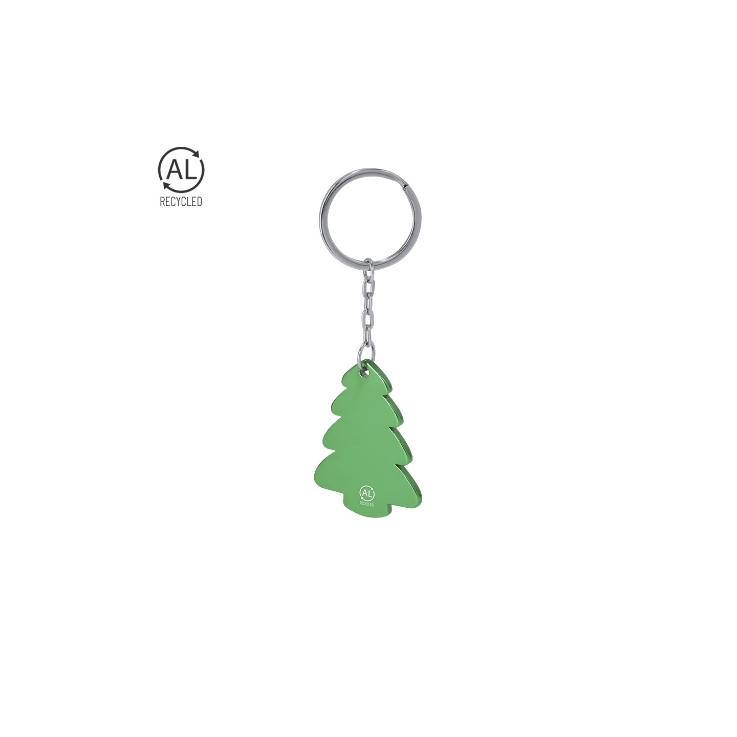 Llavero en forma de Árbol de Navidad, fabricado en aluminio reciclado. Incluye distintivo GRS y es personalizable. Ideal para regalos corporativos sostenibles.