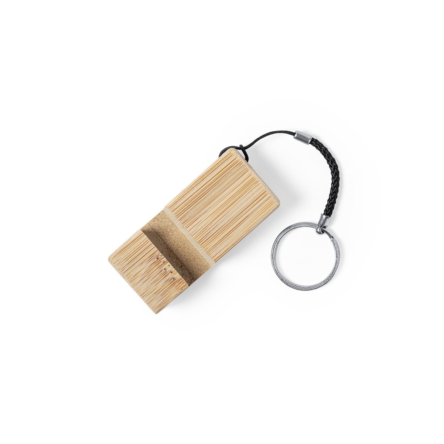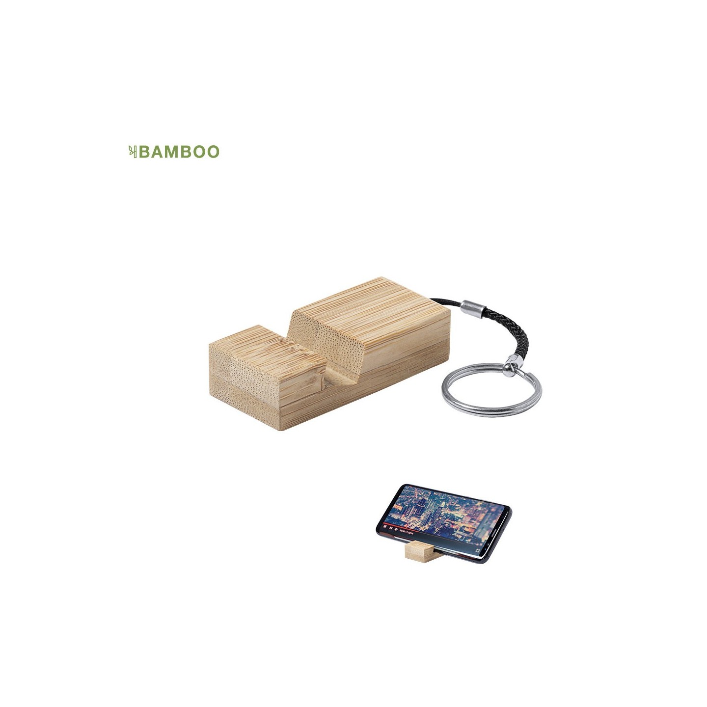 El Llavero Soporte Maros es un práctico accesorio de bambú para smartphone con cordón resistente y anilla metálica. Funcionalidad y estilo en uno solo.