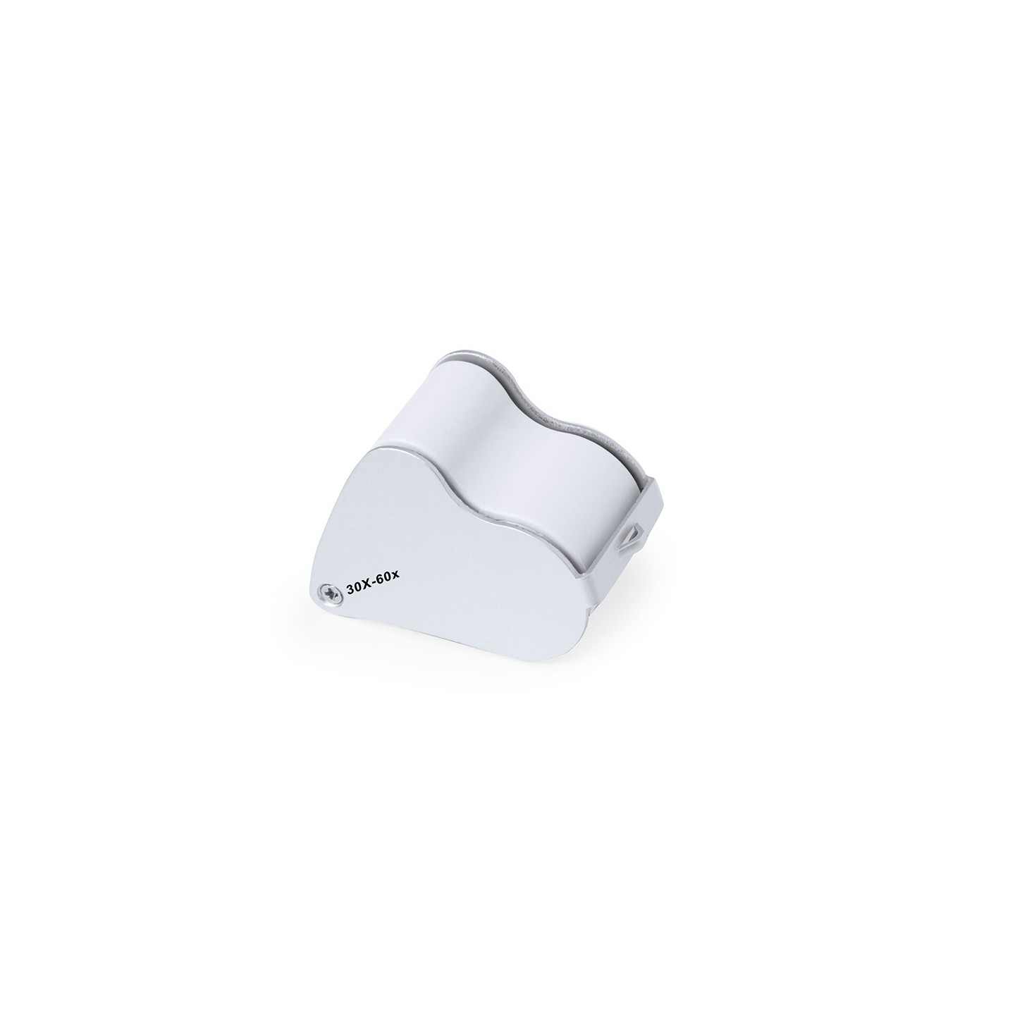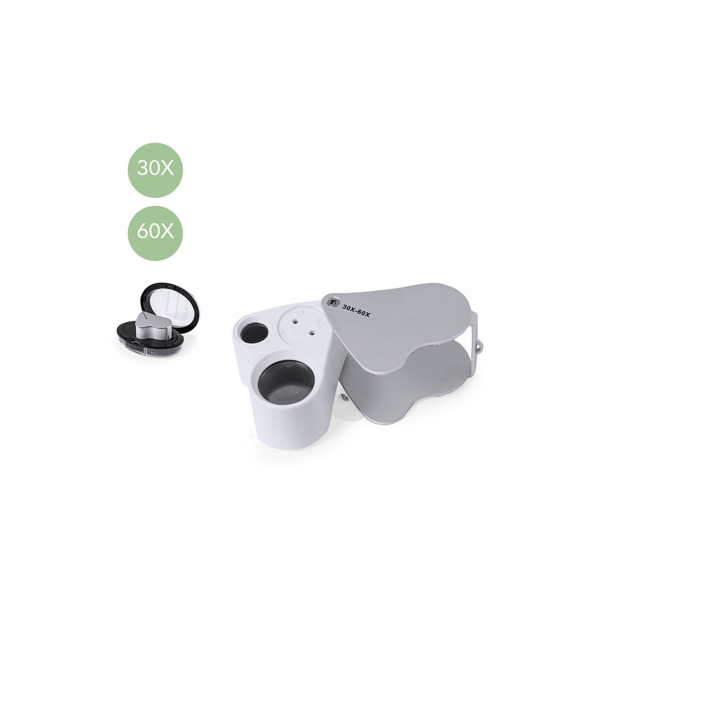 Lupa plegable con aumento 30x y 60x, luces LED, ideal para inspeccionar objetos pequeños. Personalizable.