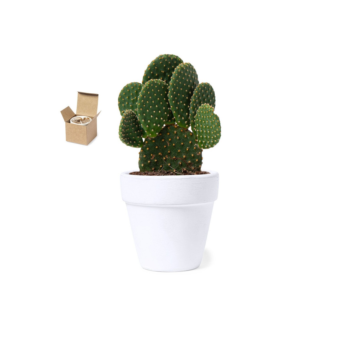 La maceta Konte es un buen regalo personalizado y ecológico. Macetero en terracota blanca con semillas de cactus y sustrato de crecimiento. Presentada en caja kraft.