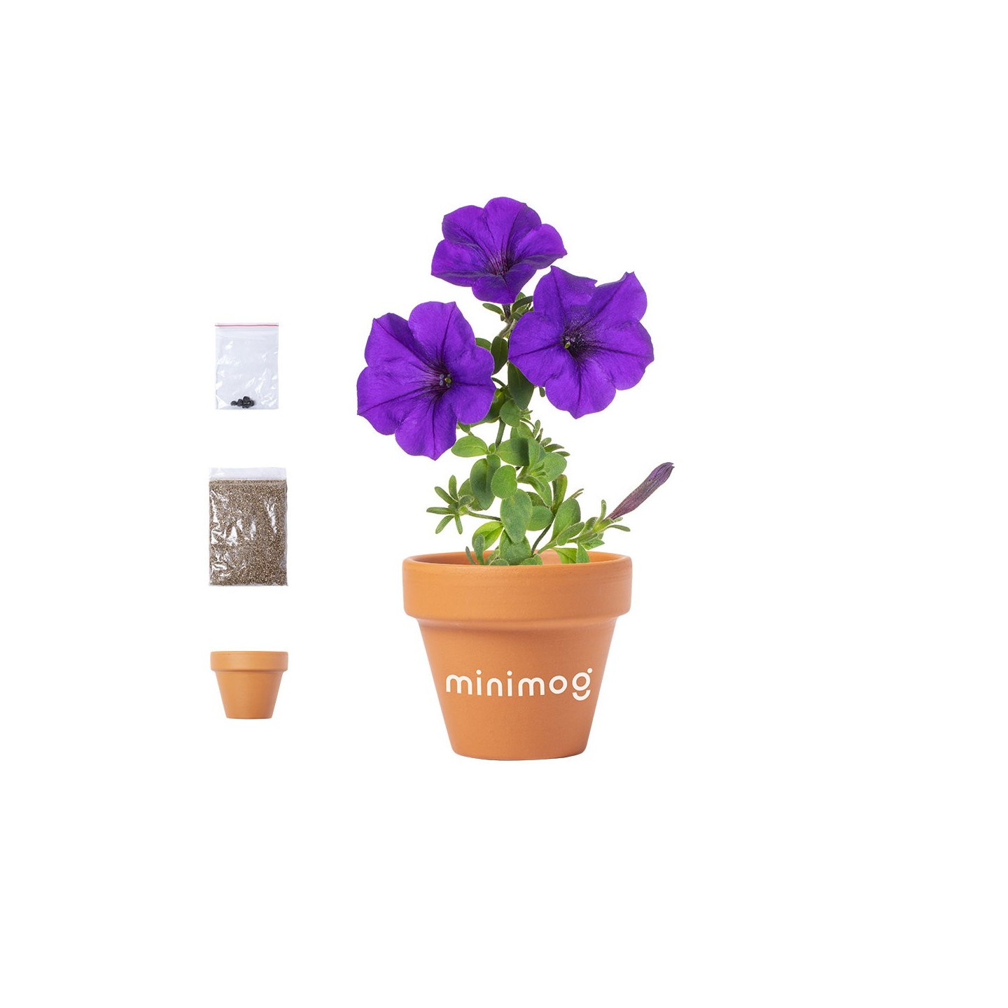 Macetero de terracota con flores de petunia, semillas y sustrato. Regalo perfecto para añadir color a tu hogar o espacio de trabajo.