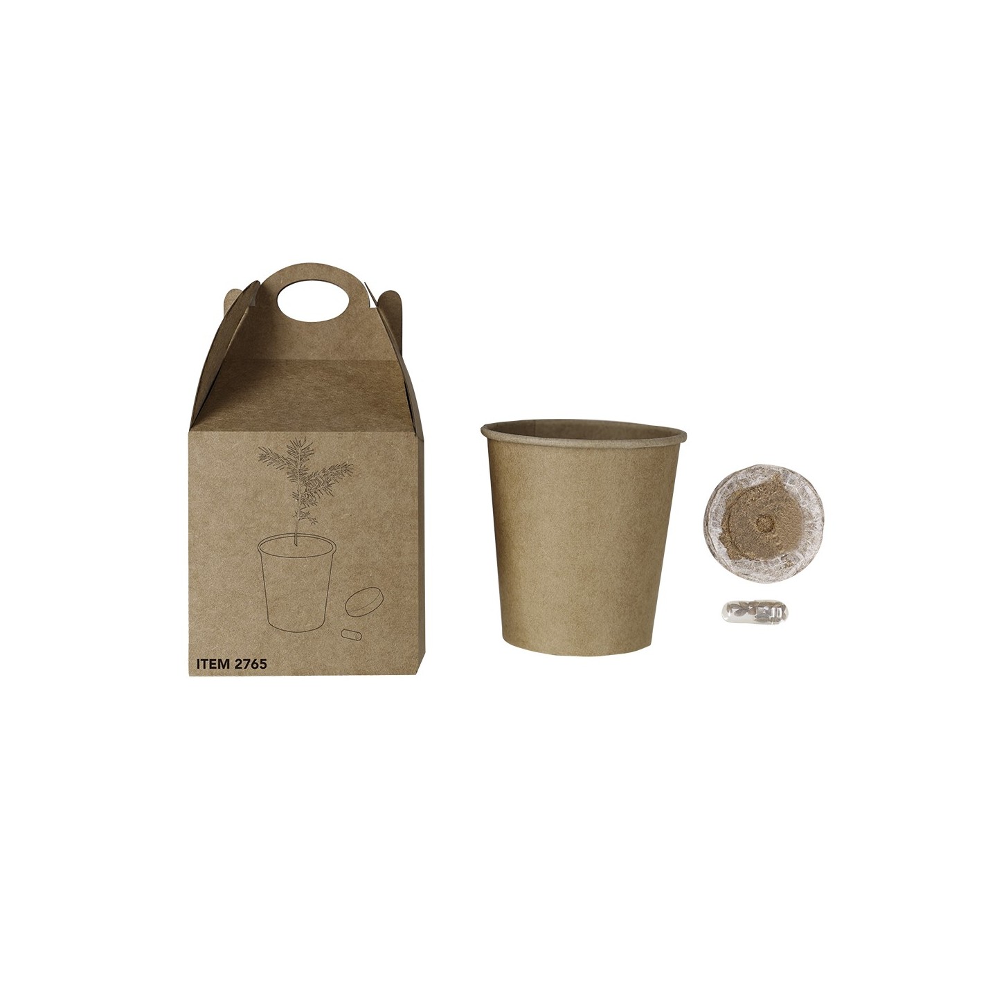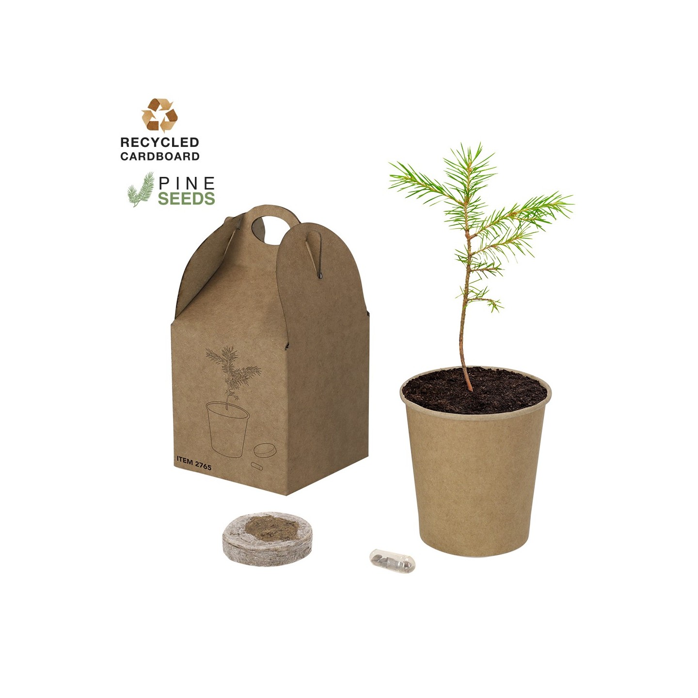 Maceta VENCOR con semillas de pino, tiesto de cartón reciclado y sustrato. Personalizable con tu logo. Incluye instrucciones y presentación en caja kraft.