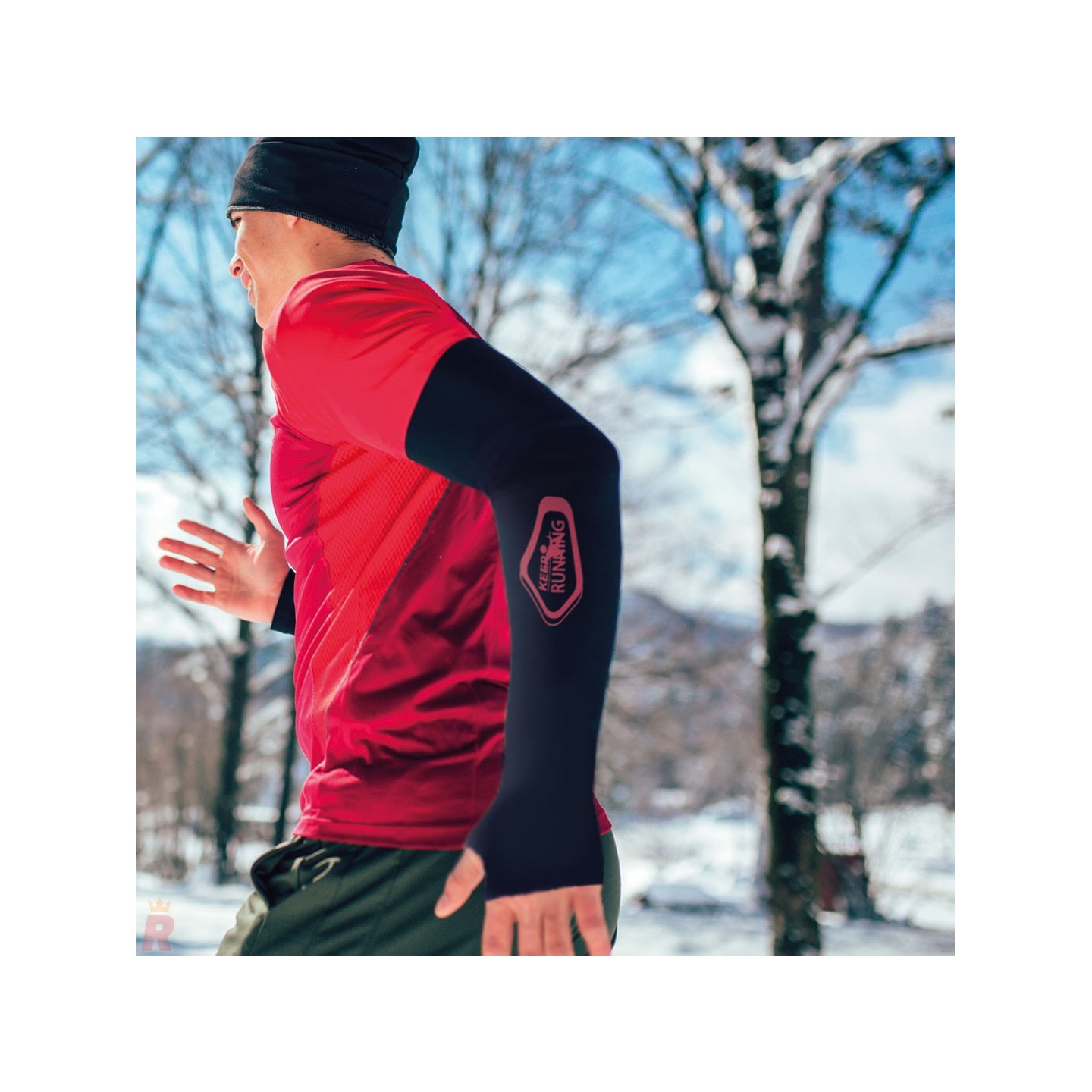 Manguitos térmicos en poliéster con agujero para el pulgar, ideales para actividades al aire libre. Disponibles en blanco y negro, perfectos para personalizar con logotipo.