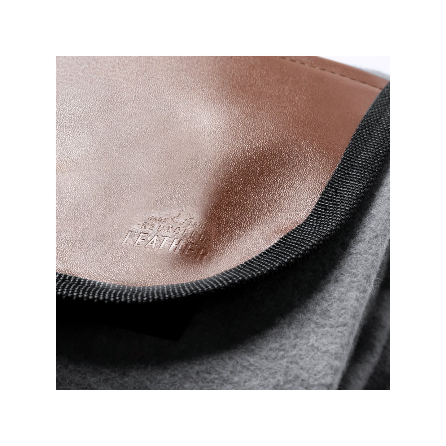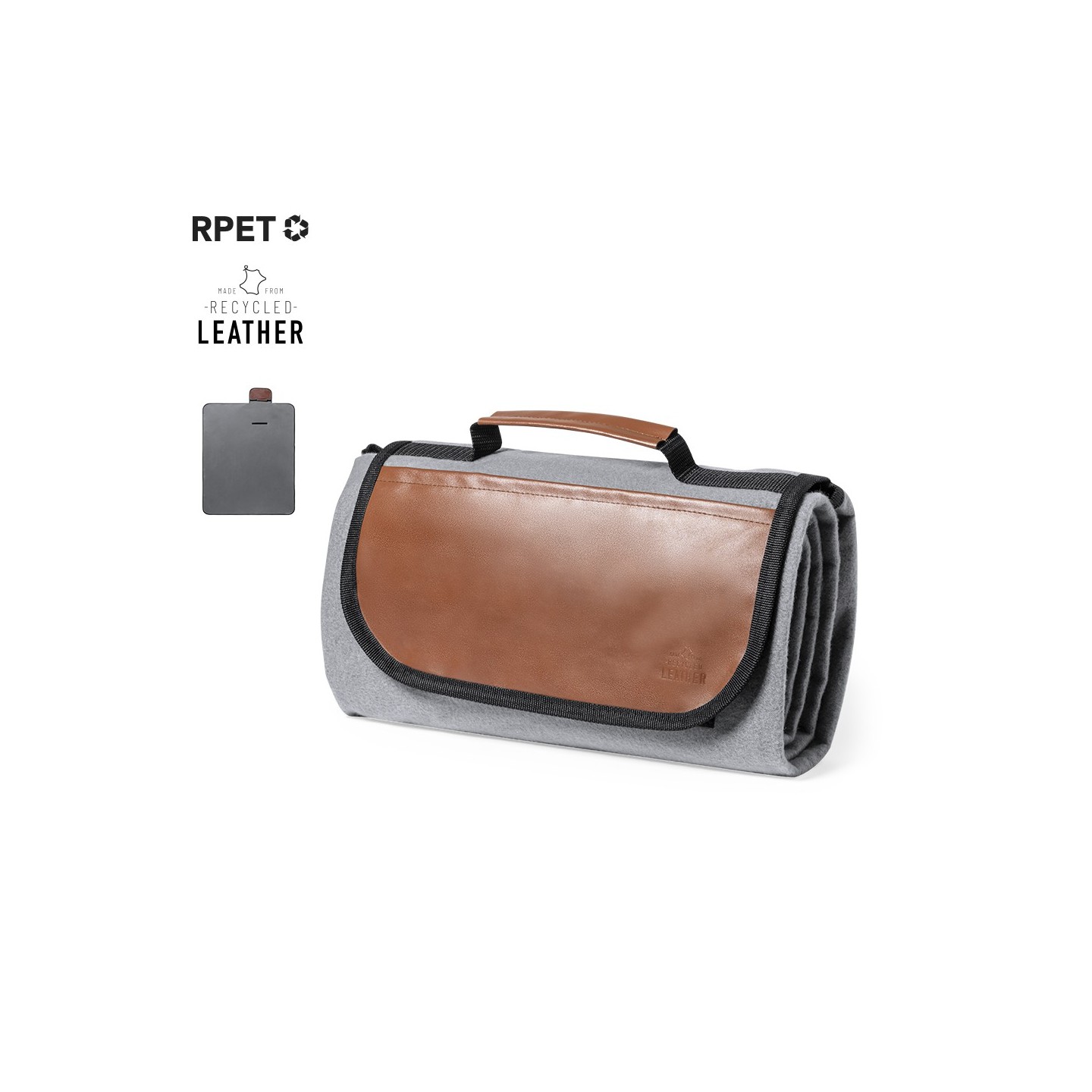 La manta se pliega fácilmente y se asegura con un práctico cierre de velcro solapa, que a su vez cuenta con un elegante asa en cuero reciclado con ribetes reforzados. Esta combinación de materiales confiere un aspecto sofisticado y a la vez sostenible, ya que tanto el poliéster RPET como el cuero reciclado contribuyen a la protección del medio ambiente.