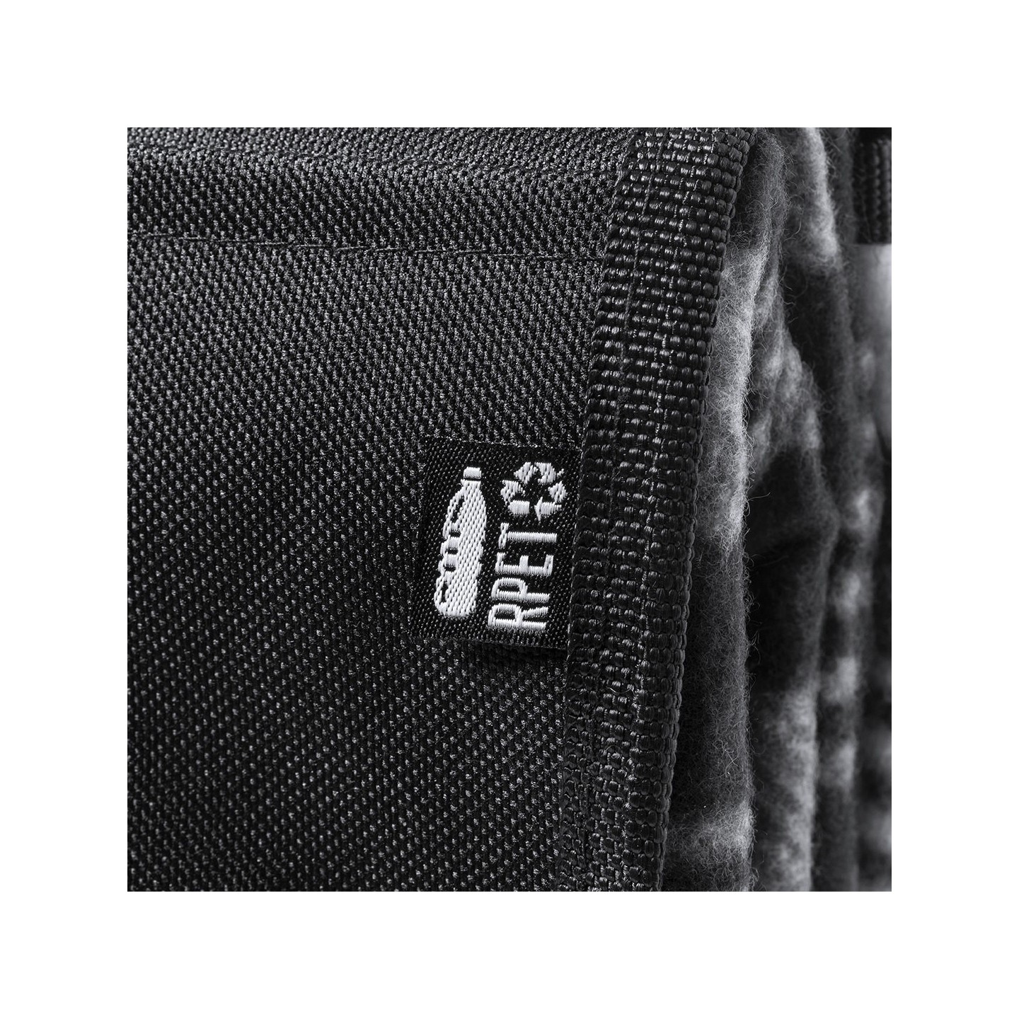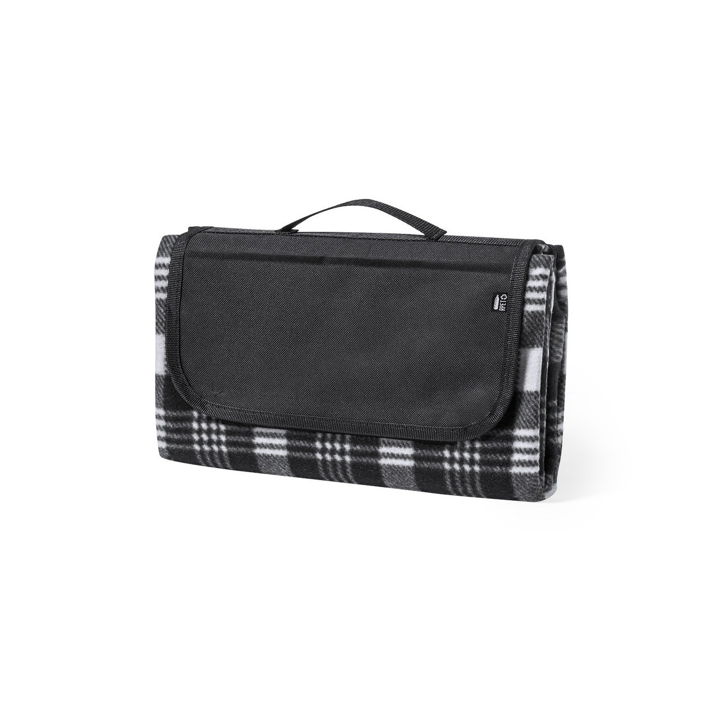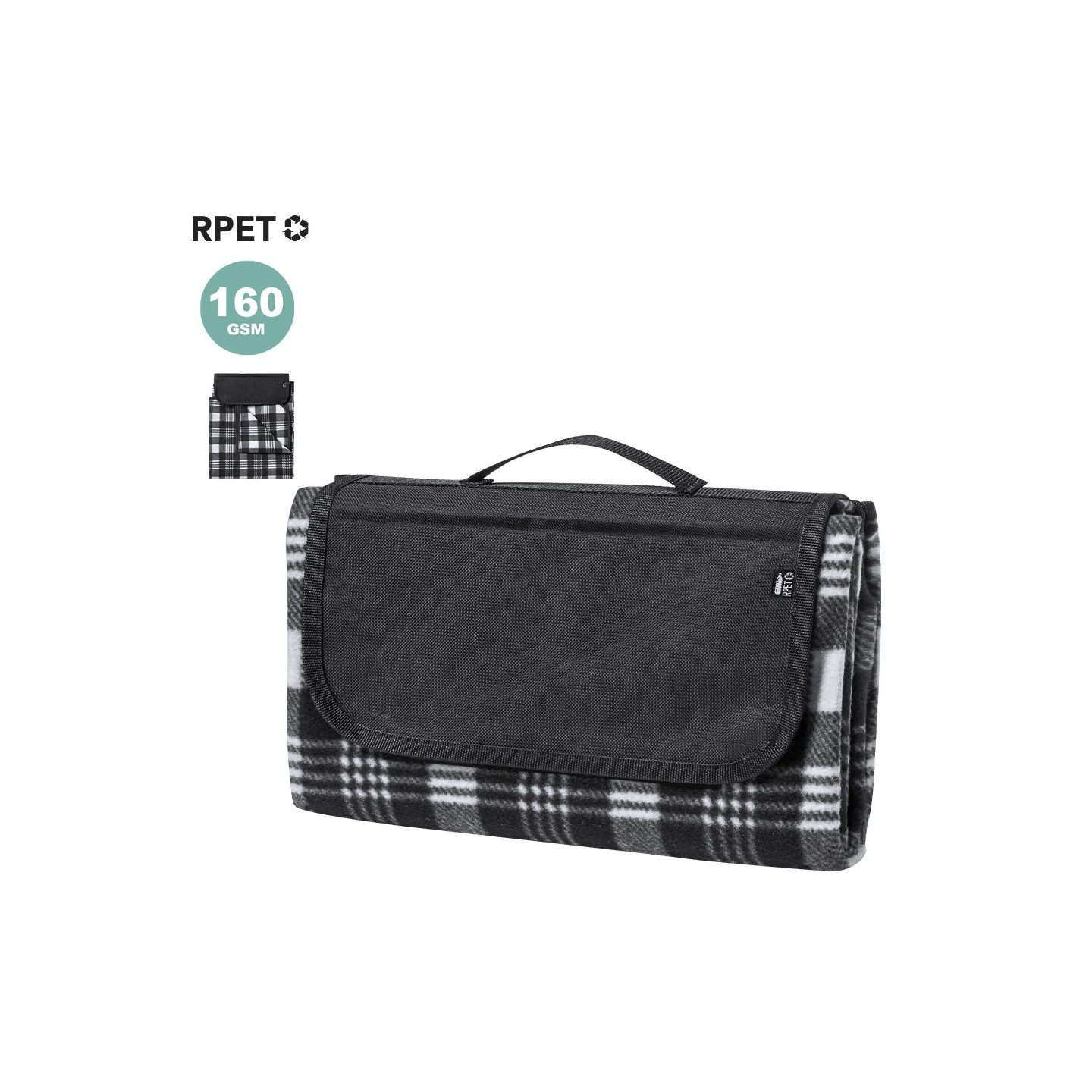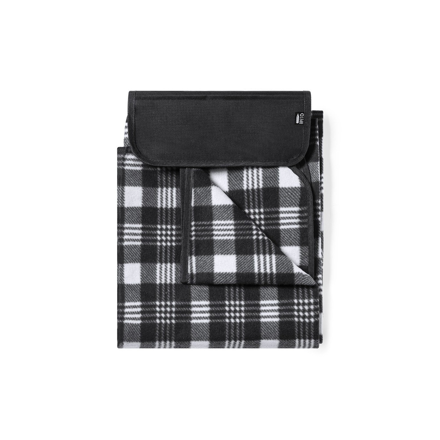 La manta se pliega fácilmente y presenta un tamaño compacto, lo que la hace altamente portátil y conveniente para llevar a cualquier lugar. Además, cuenta con un práctico asa de transporte y una solapa con cierre de velcro, que garantiza un almacenamiento seguro y ordenado. La etiqueta distintiva RPET en la solapa refuerza el mensaje de sostenibilidad y calidad presente en cada detalle de esta manta.