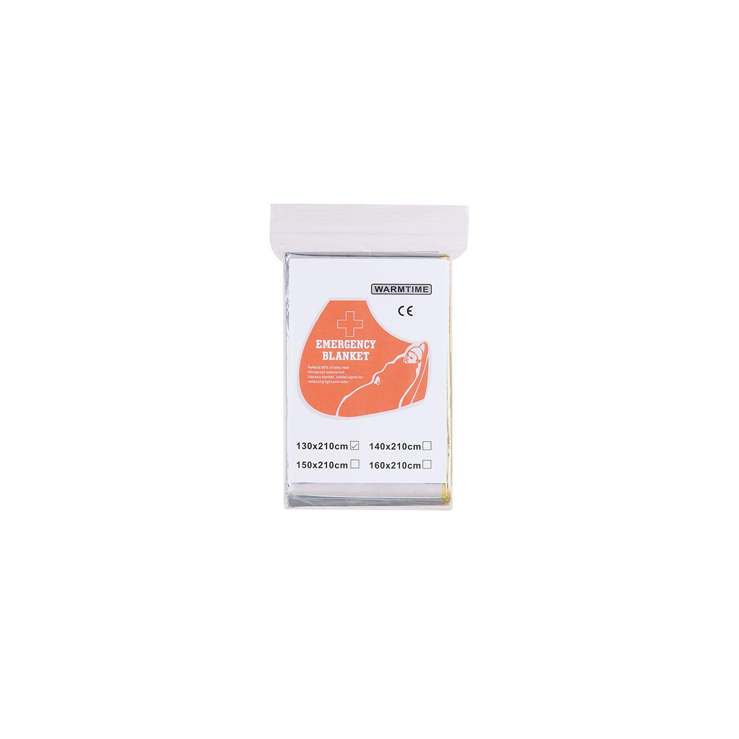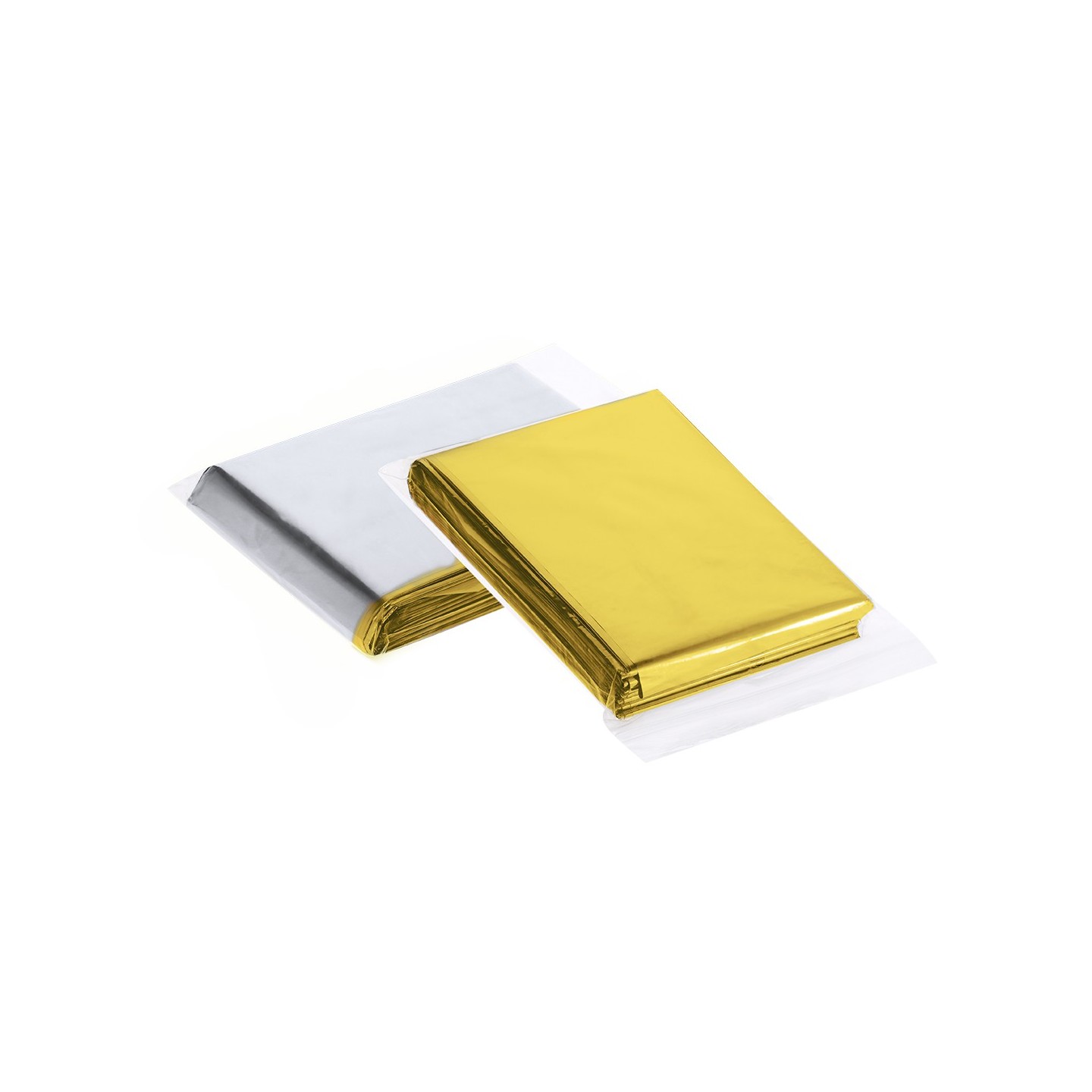 Manta térmica MITHAK de PET aluminizado, ligera y versátil. Regula la temperatura según la orientación y es personalizable con logotipo. Ideal para emergencias.