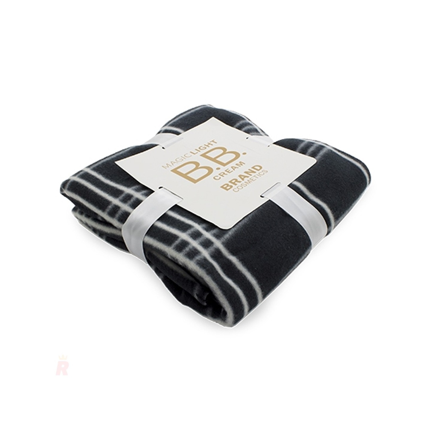 Manta de viaje básica en poliéster, ligera y resistente. Diseño clásico de cuadros en tonos negros y grises, ideal para viajes o uso en casa. Se presenta en bolsa para fácil transporte.