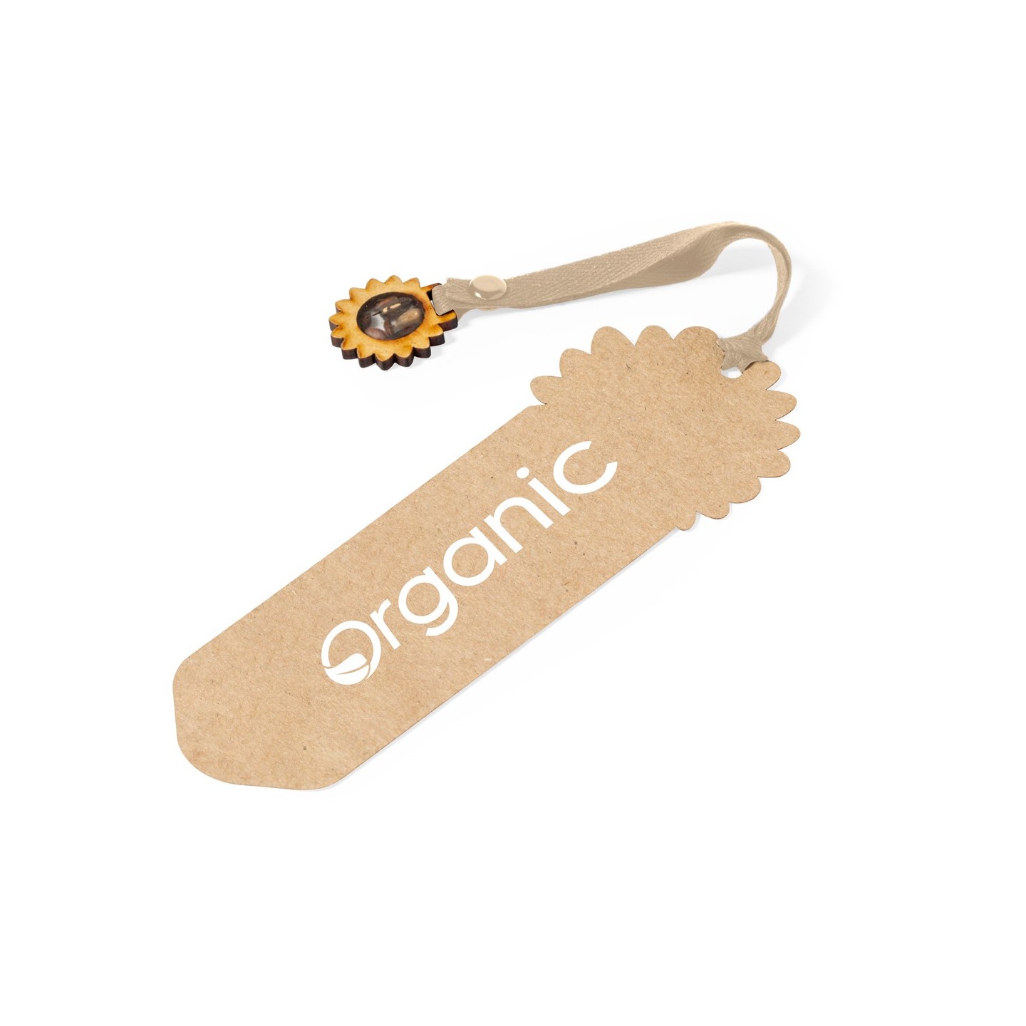 Marcapáginas Semillas Bernaye en cartón reciclado con diseño de flecha y cápsula de semillas de girasol. Ideal para lectores eco-conscientes. Personalizable.