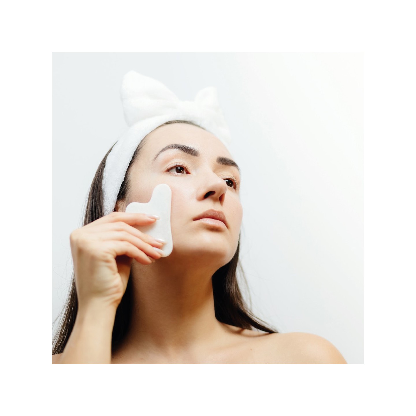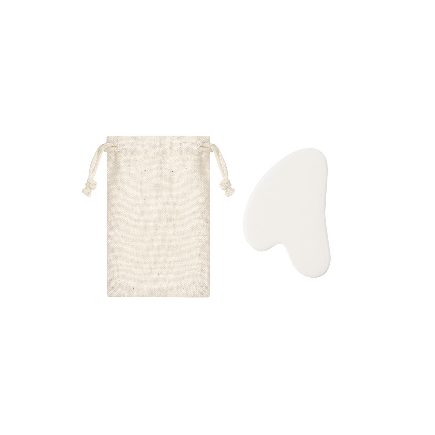 Masajeador facial de jade blanco para rutinas de cuidado de la piel. Presentado en bolsa de algodón natural y personalizable con tu logotipo.