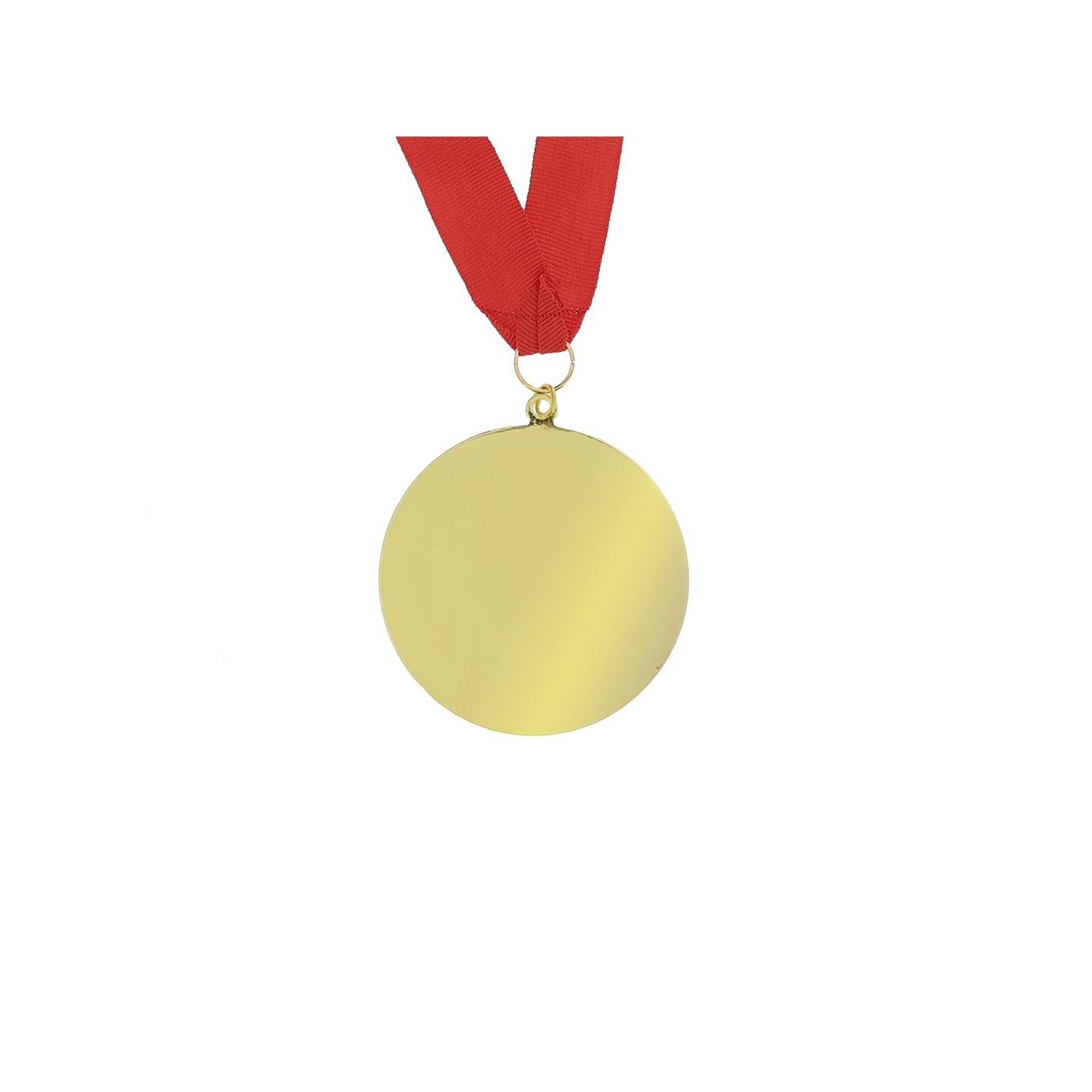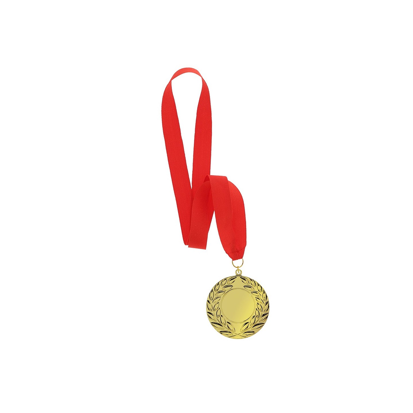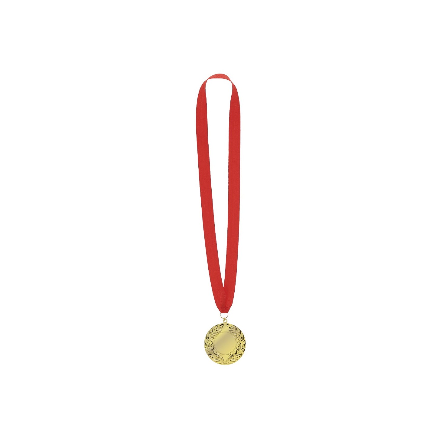 Medalla metálica dorada en relieve de 7 cm, con cinta roja y anilla metálica. Personalizable con marcaje láser. Ideal para premios, reconocimientos y eventos.