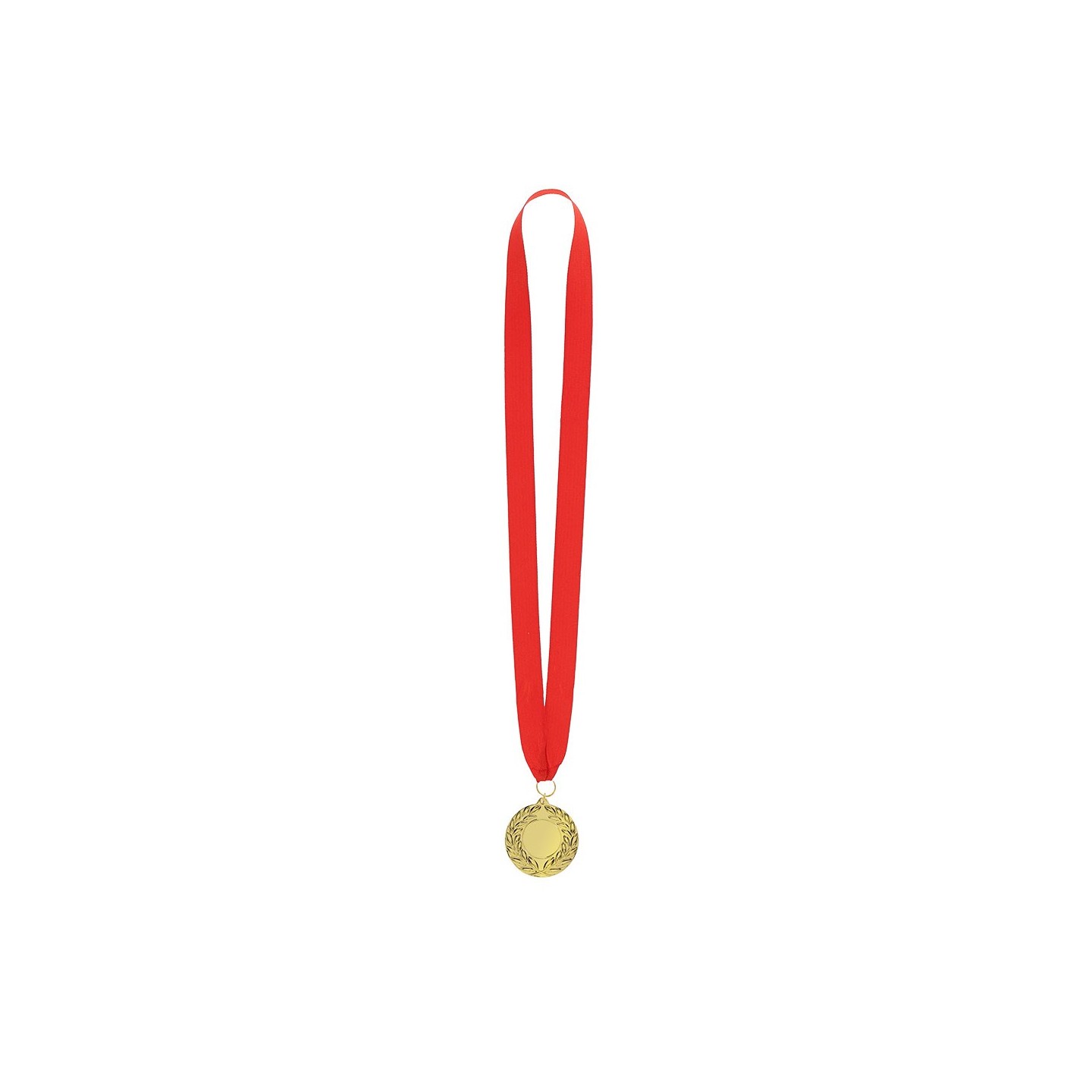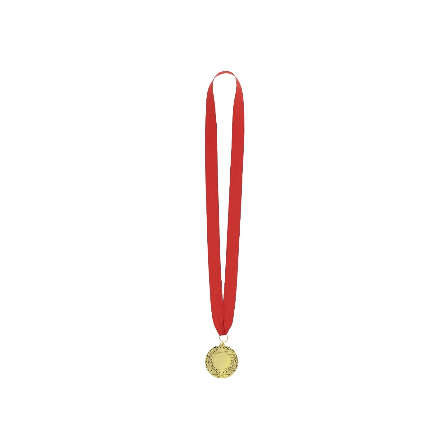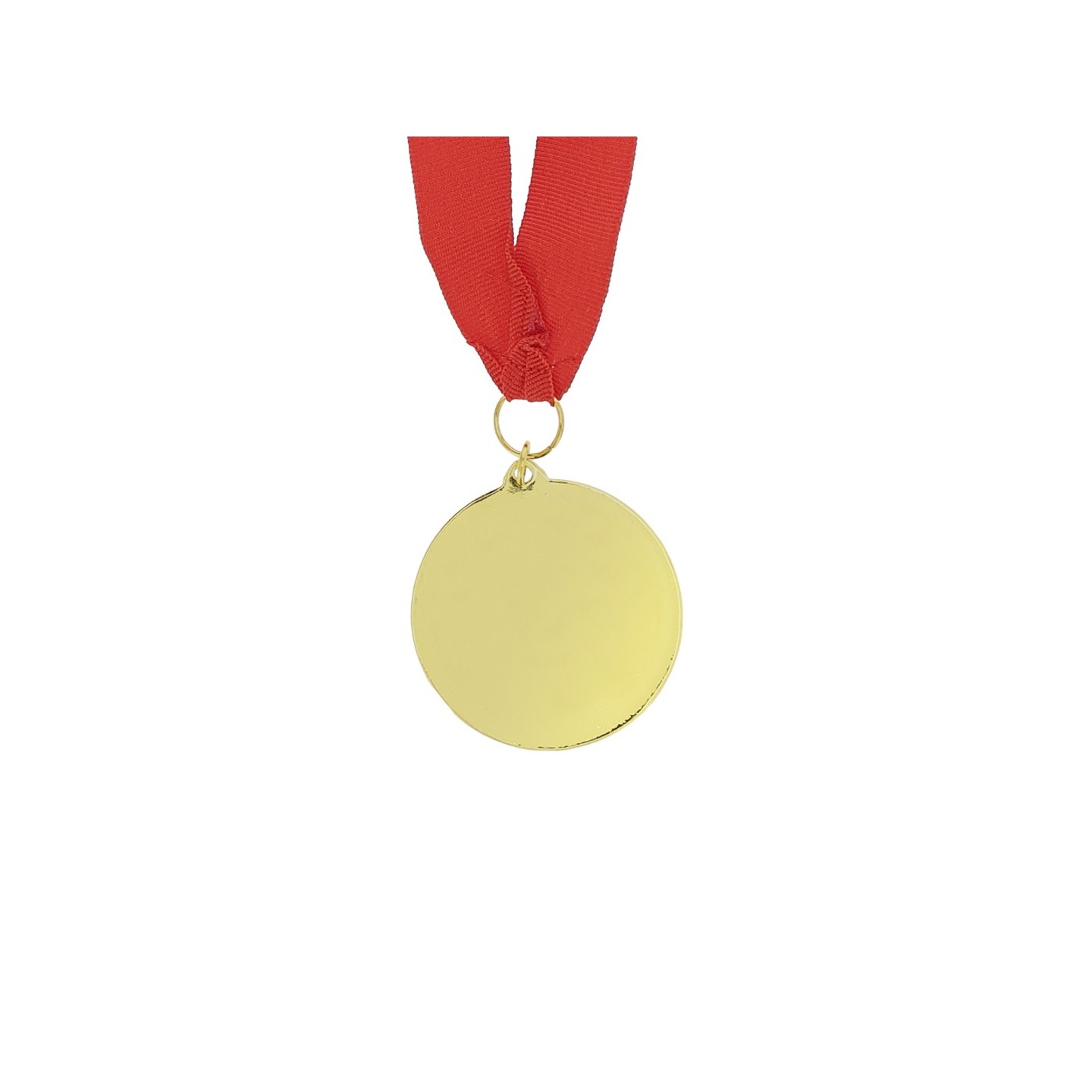 Medalla metálica dorada con acabado en relieve y cinta roja de poliéster. Ideal para premiaciones, reconocimientos o eventos. Personalizable con tu logotipo.