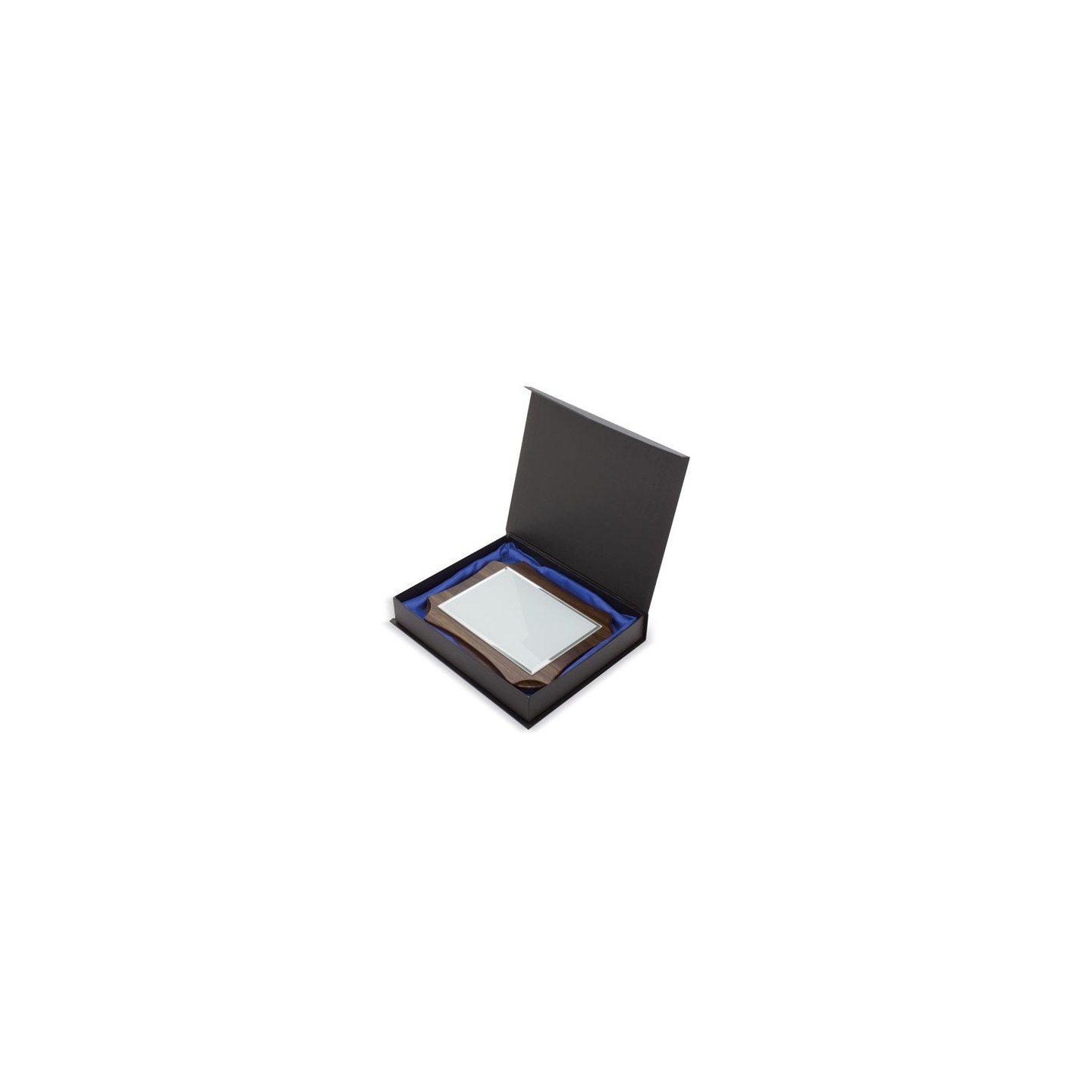 Metopa moderna de cristal y madera especial para sublimación, personalizable a todo color. Incluye soportes metálicos y estuche acolchado