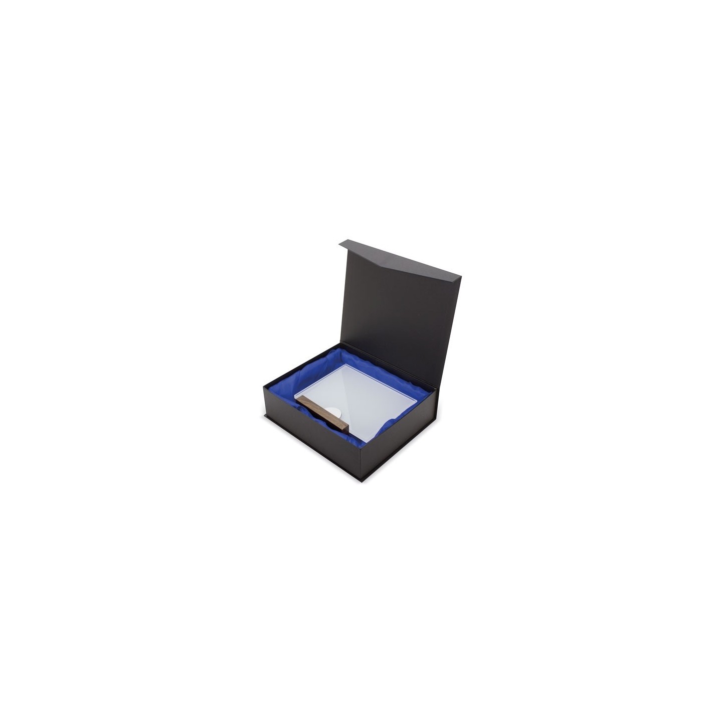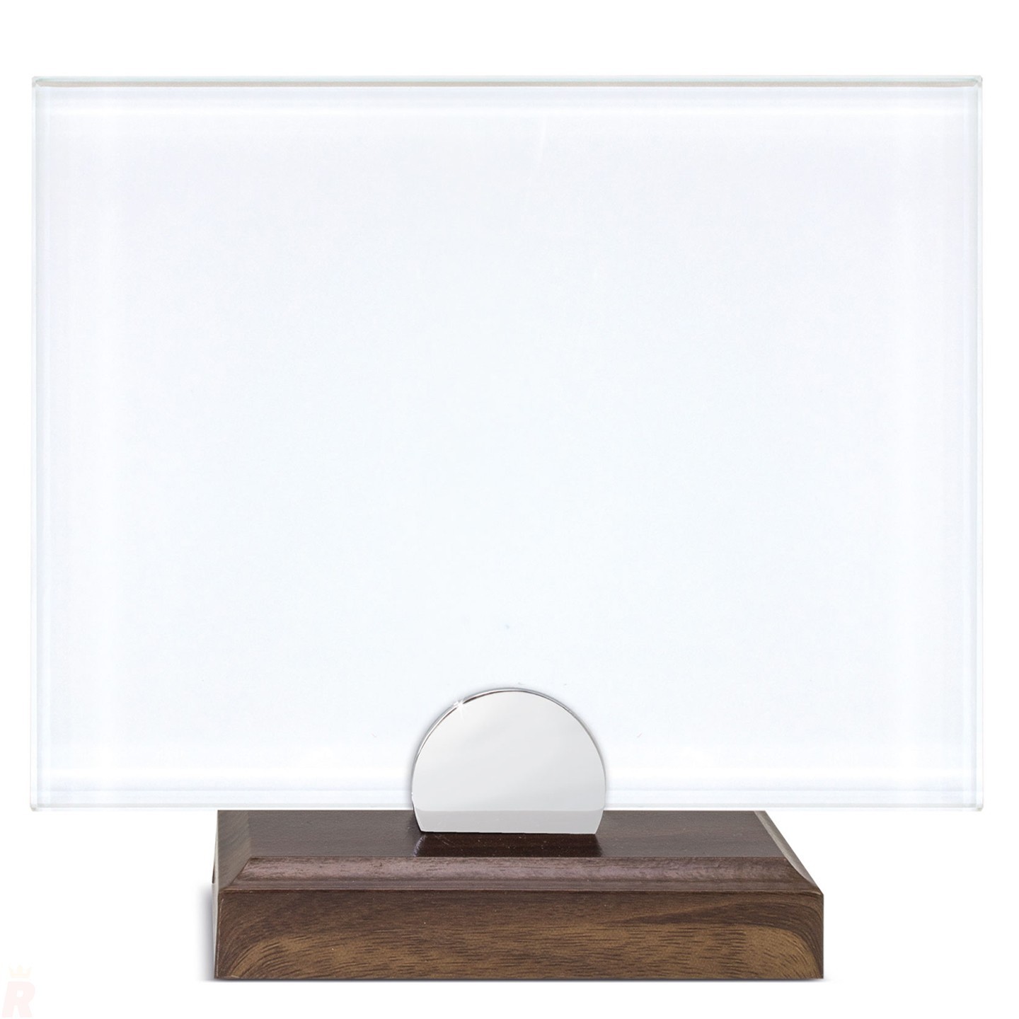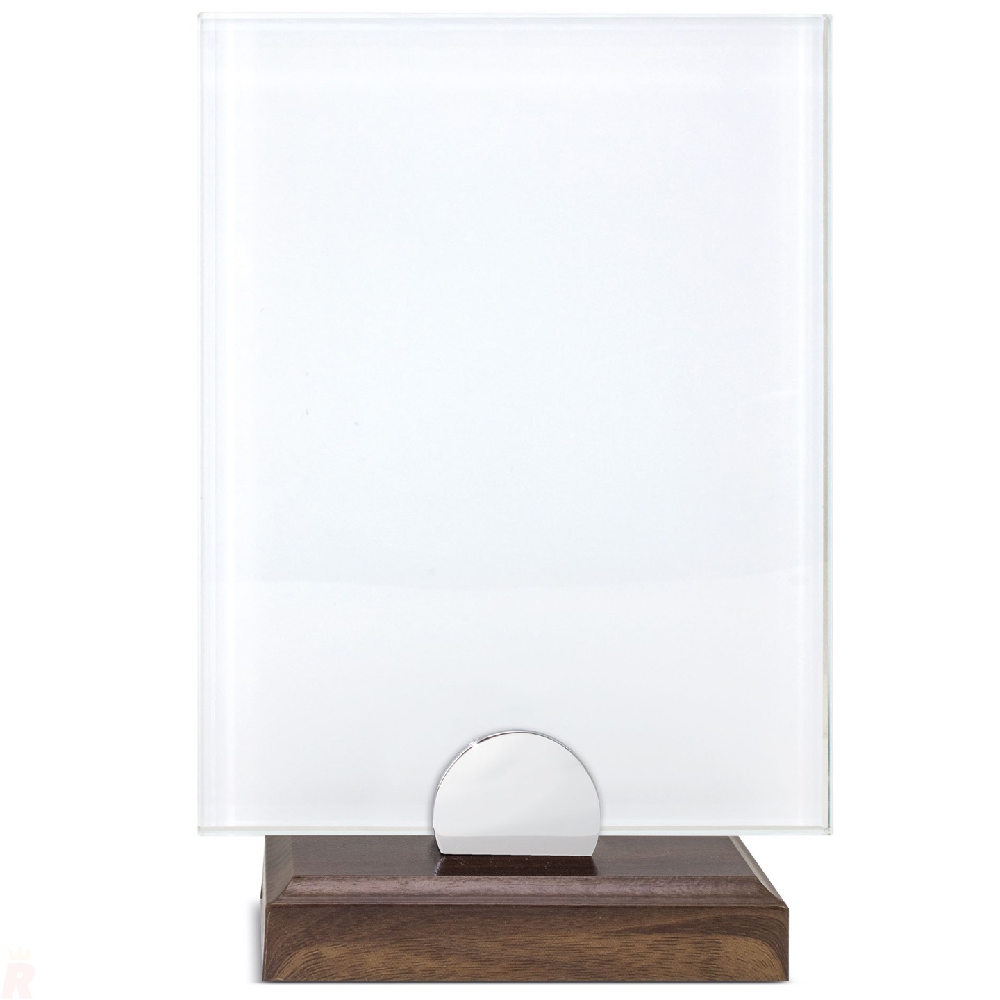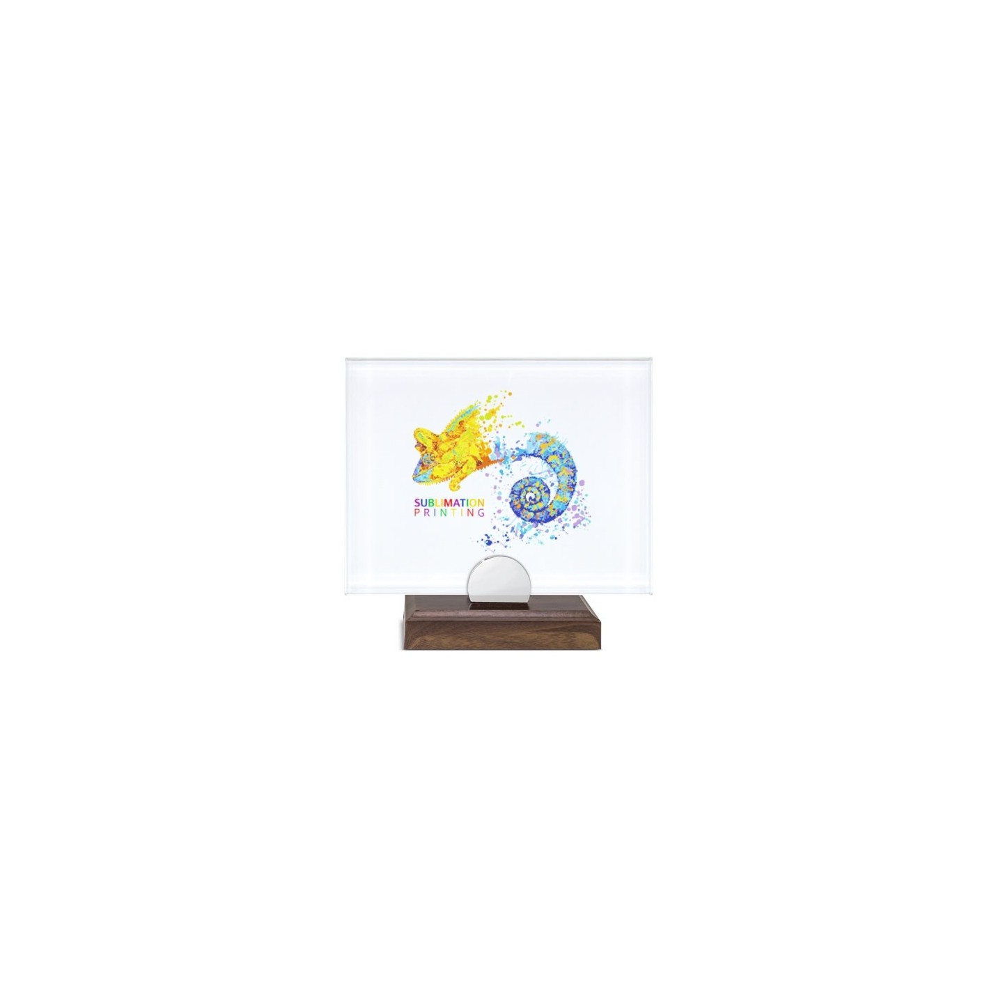Metopa sobremesa de cristal con base de madera maciza, personalizable mediante sublimación. Elegante diseño, ideal para premiar o conmemorar eventos especiales. Presentada en caja con cierre imantado