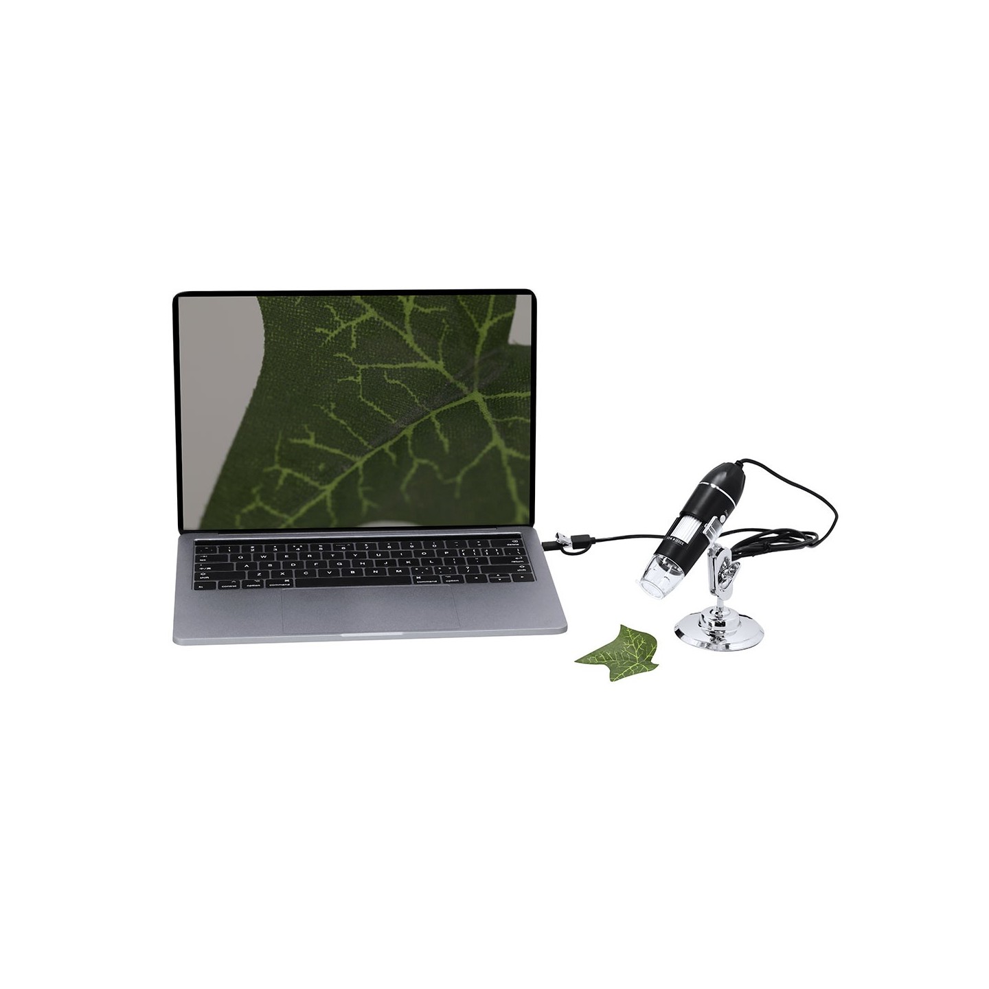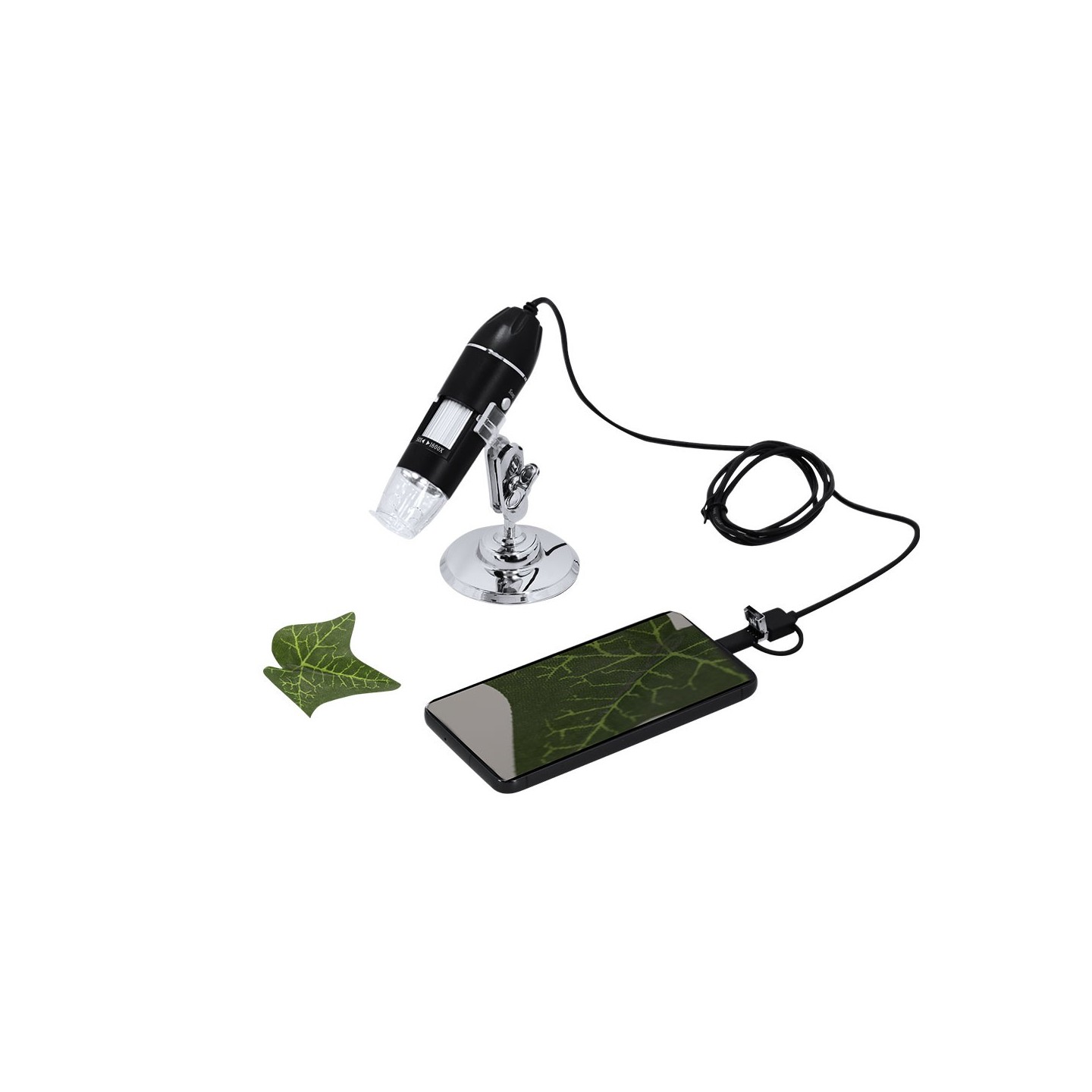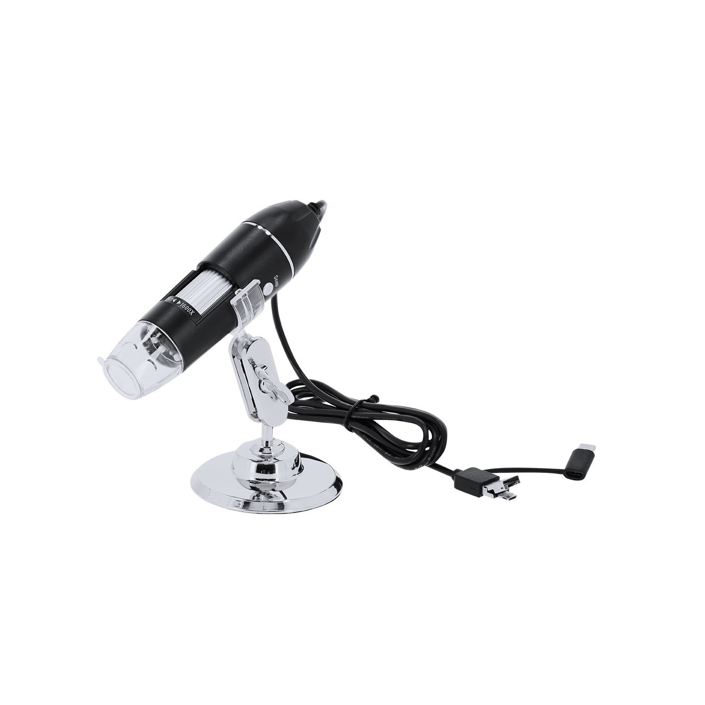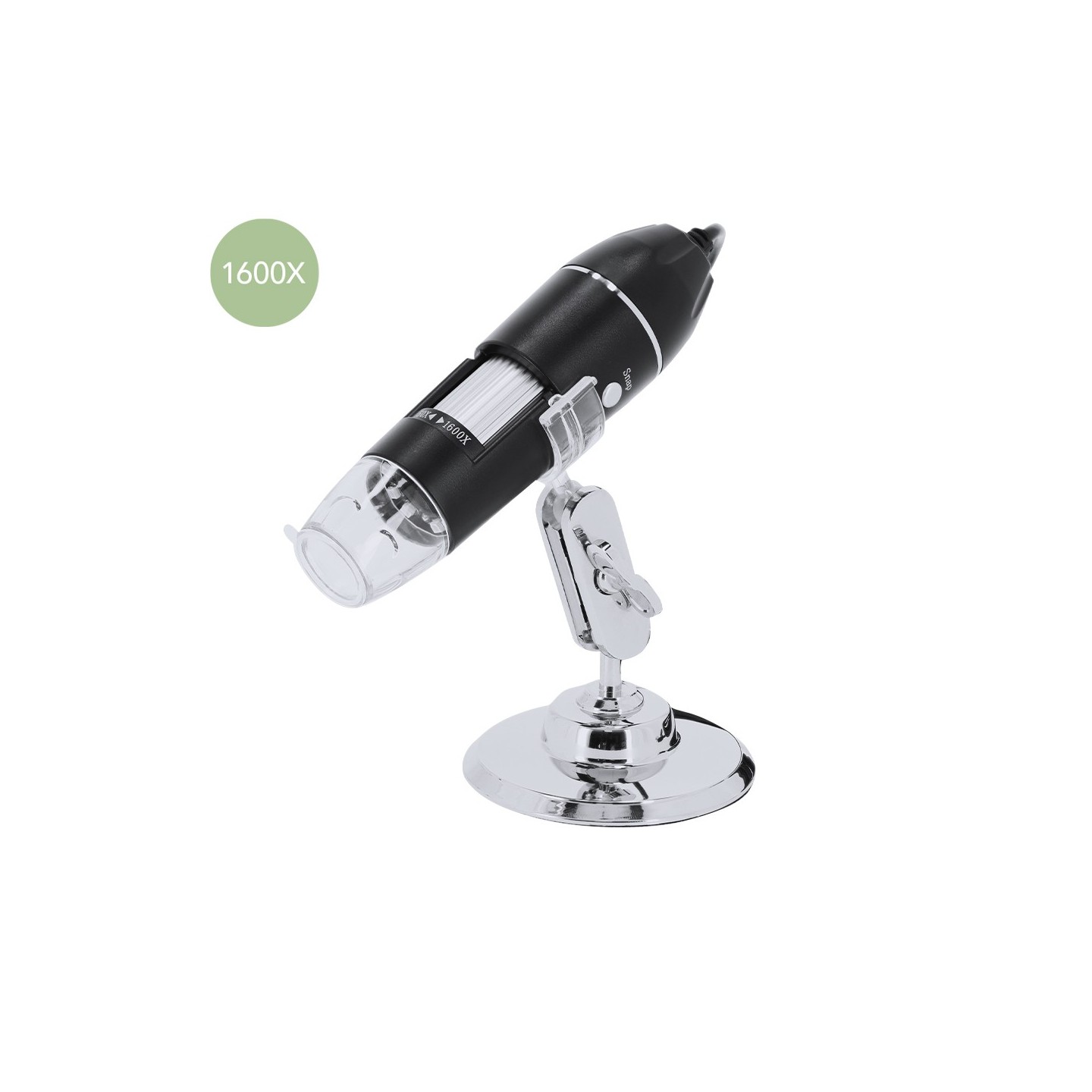 Microscopio digital PATSMI 1600X con aumento de 0-1600X, luz LED ajustable y soporte. Compatible con USB y Tipo C. Personalizable con tu logotipo.