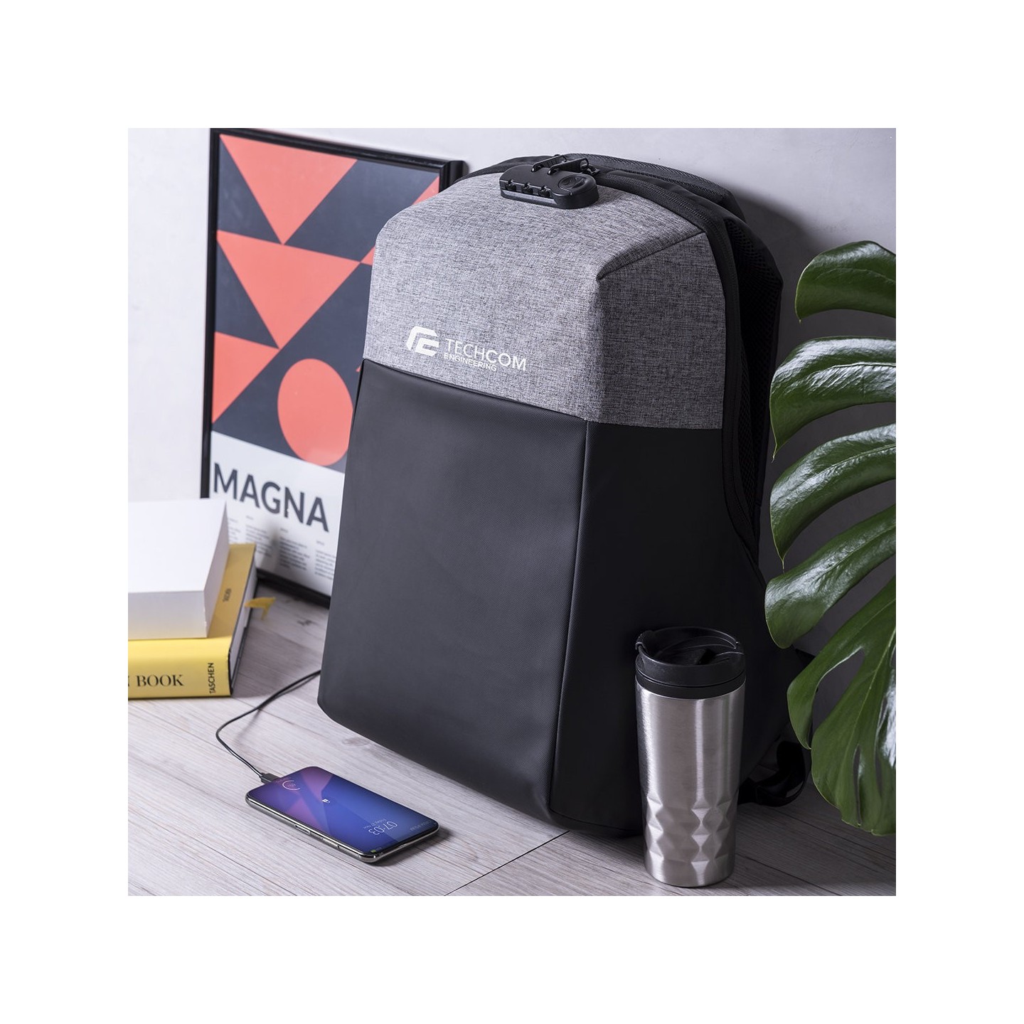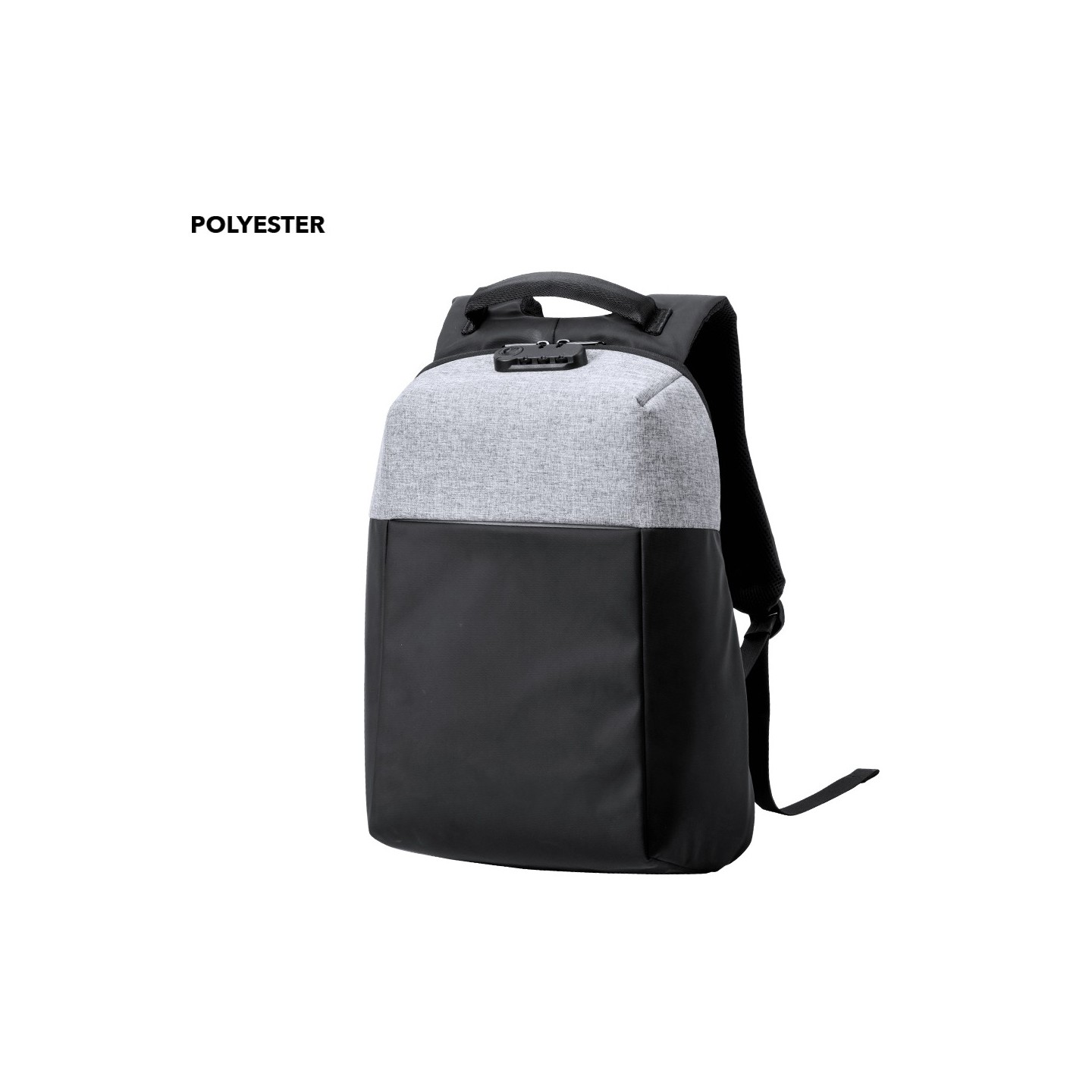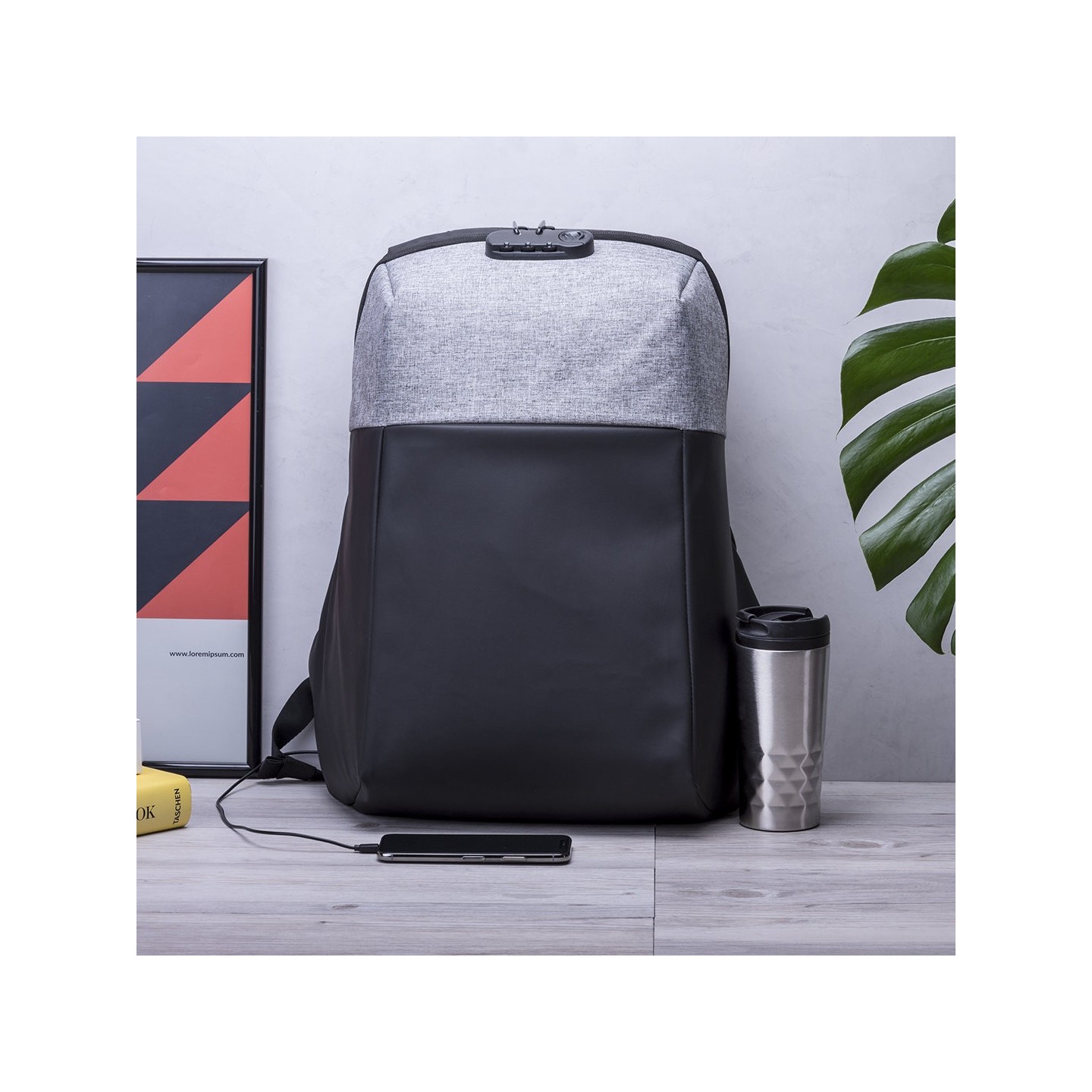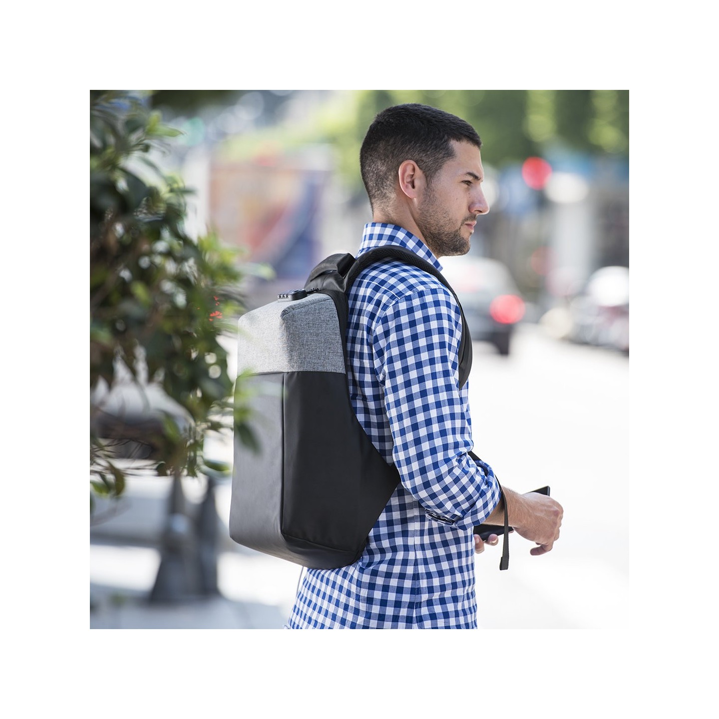 Mochila de negocios antirrobo y repelente al agua en poliéster de alta calidad. Con candado de seguridad, bolsillo antirrobo en la espalda y compartimento con salida USB. Diseño ergonómico con acolchado en cintas de hombros y espalda.