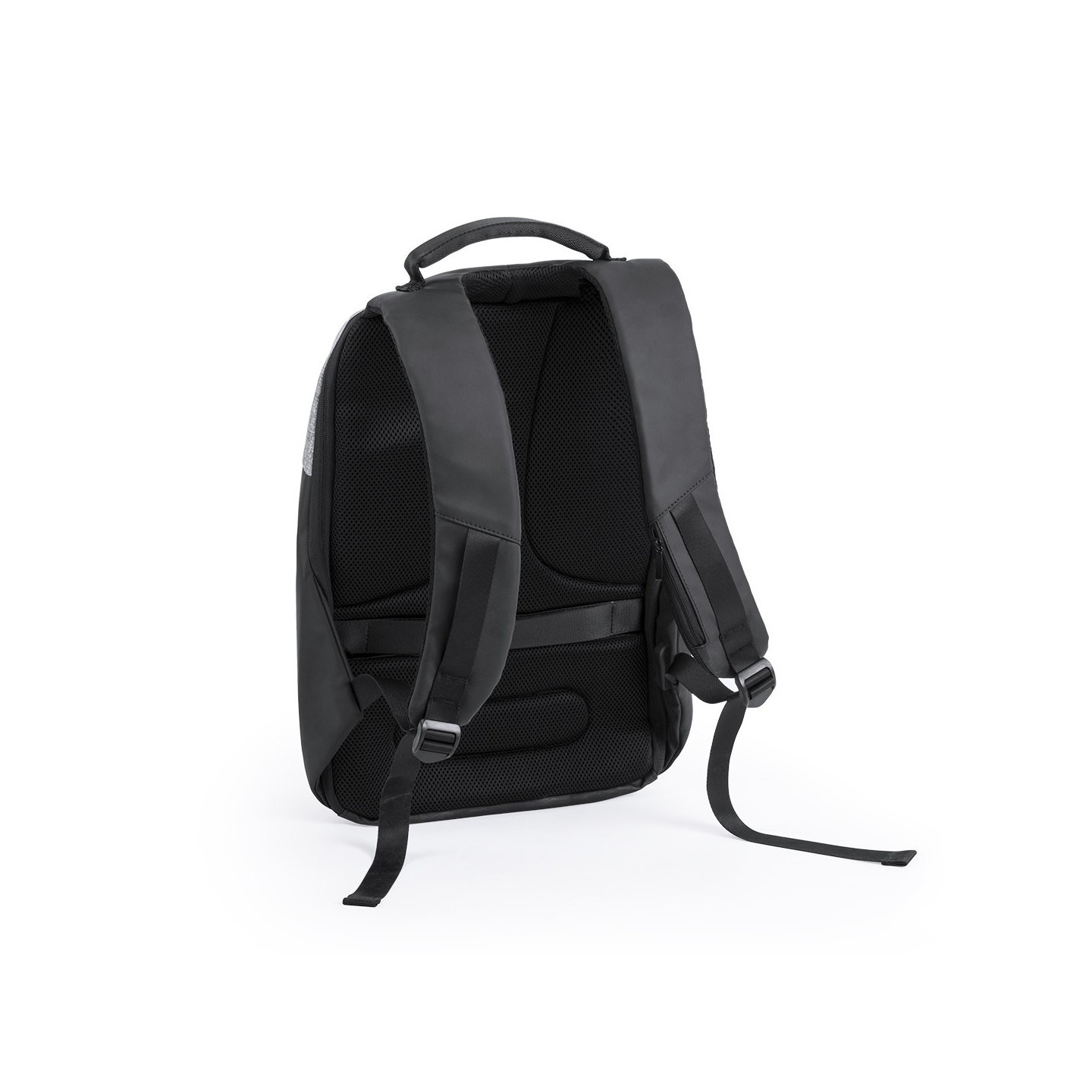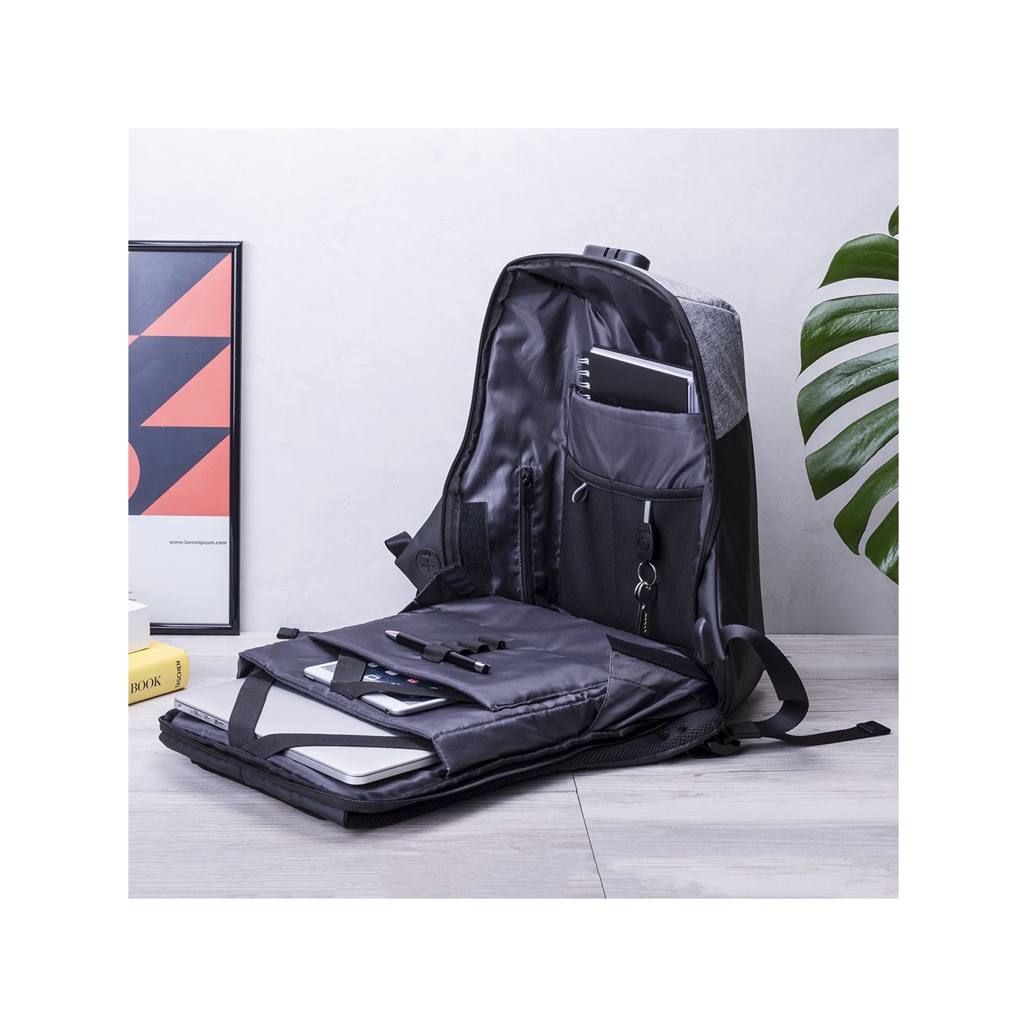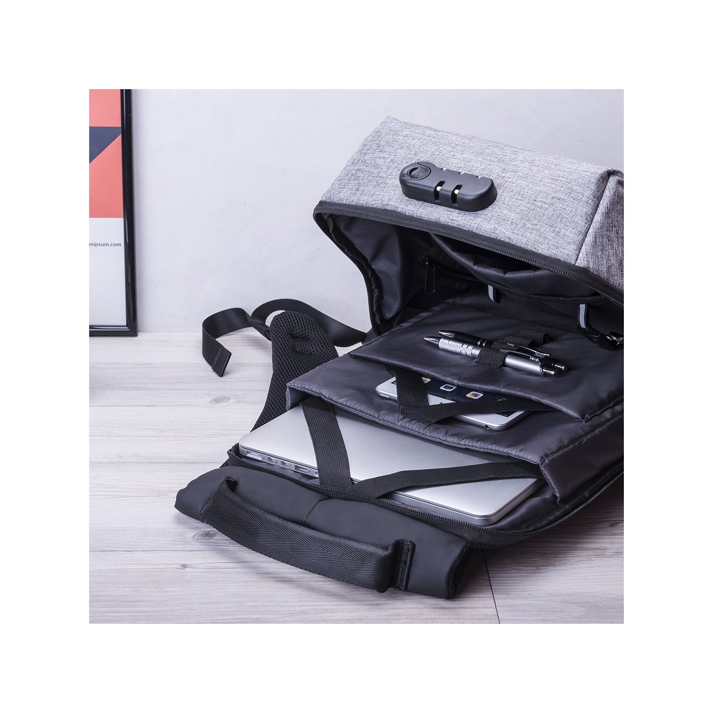 Mochila de negocios antirrobo y repelente al agua en poliéster de alta calidad. Con candado de seguridad, bolsillo antirrobo en la espalda y compartimento con salida USB. Diseño ergonómico con acolchado en cintas de hombros y espalda.