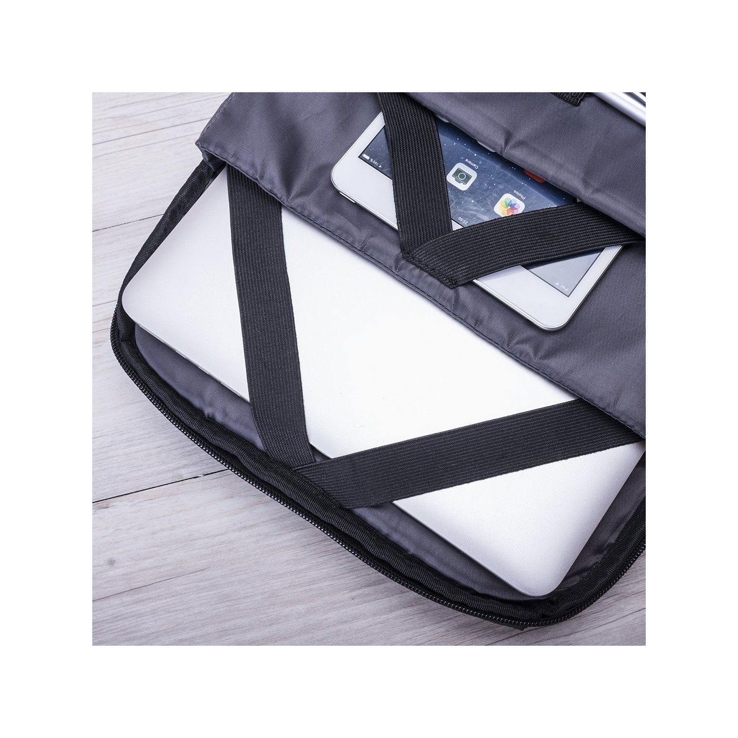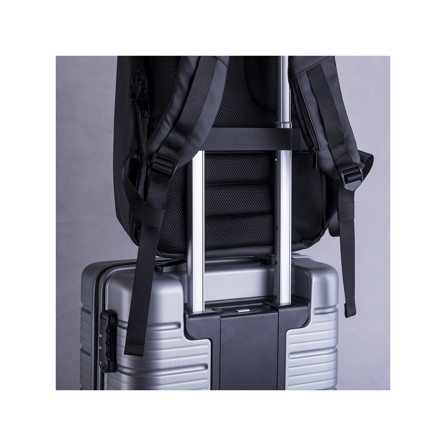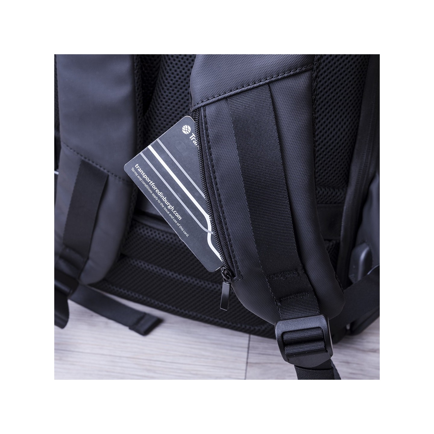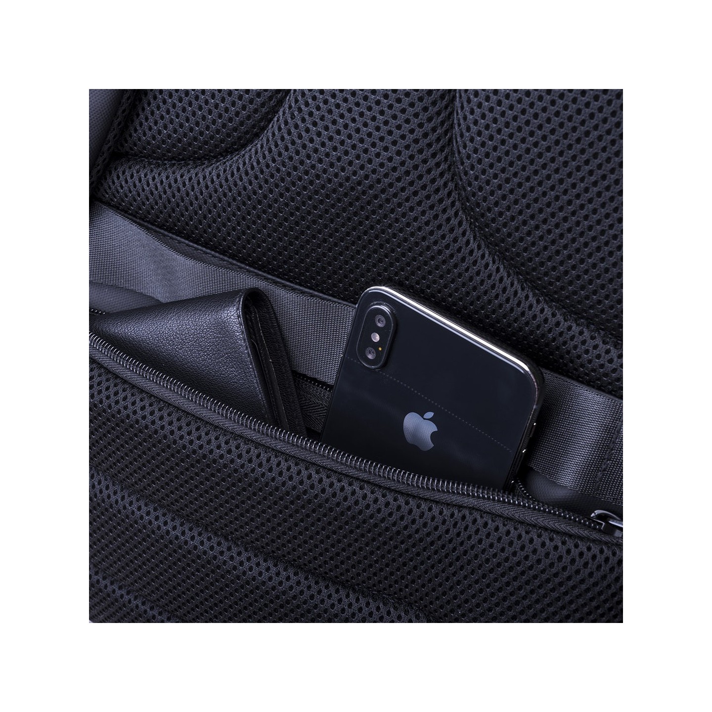 Mochila de negocios antirrobo y repelente al agua en poliéster de alta calidad. Con candado de seguridad, bolsillo antirrobo en la espalda y compartimento con salida USB. Diseño ergonómico con acolchado en cintas de hombros y espalda.