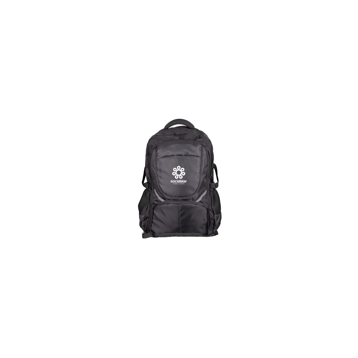 Mochila BARAK personalizable con logotipo, fabricada en nailon RPET, ideal para ordenador portátil de hasta 16", con varios compartimentos y anillas para accesorios.