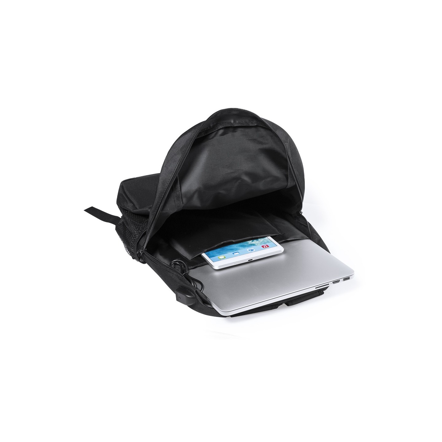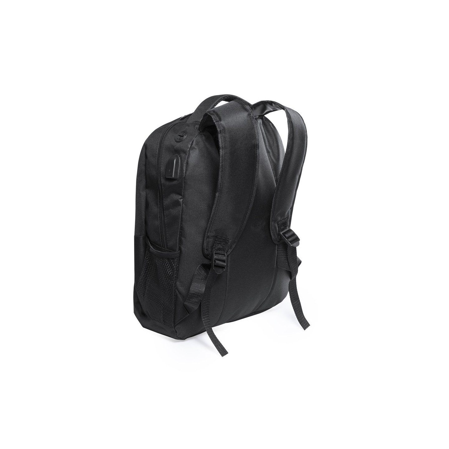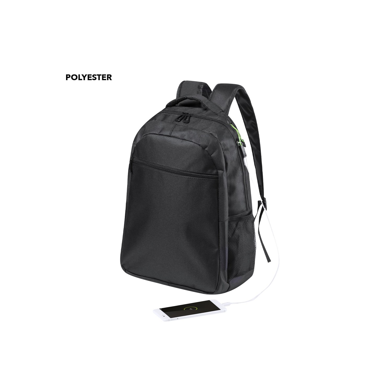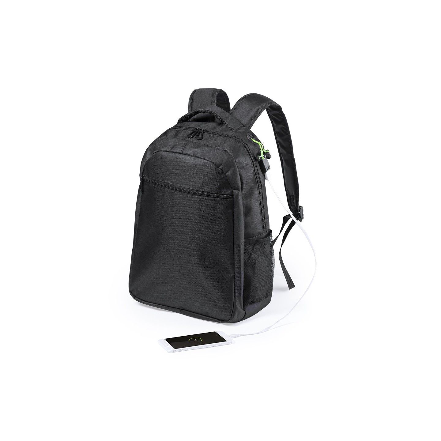 Mochila resistente de poliéster 600D impermeable, con compartimento acolchado para laptop, múltiples bolsillos y salida USB para powerbank. Ideal para uso diario y viajes.
