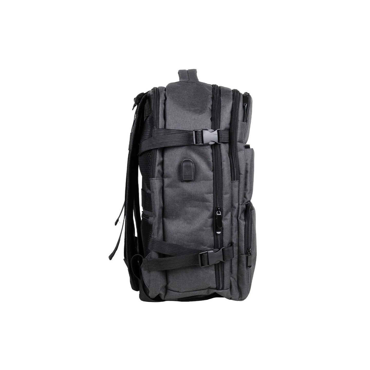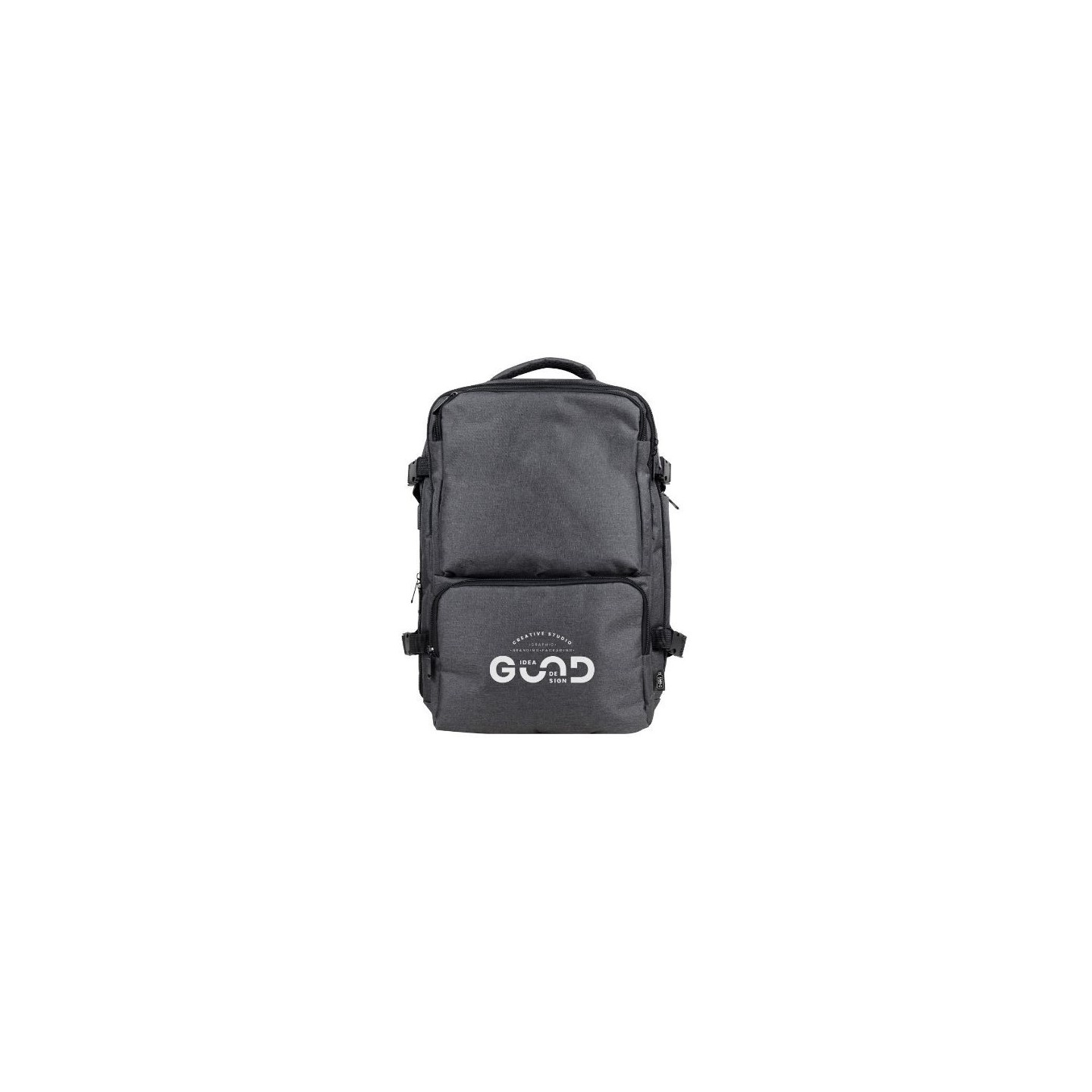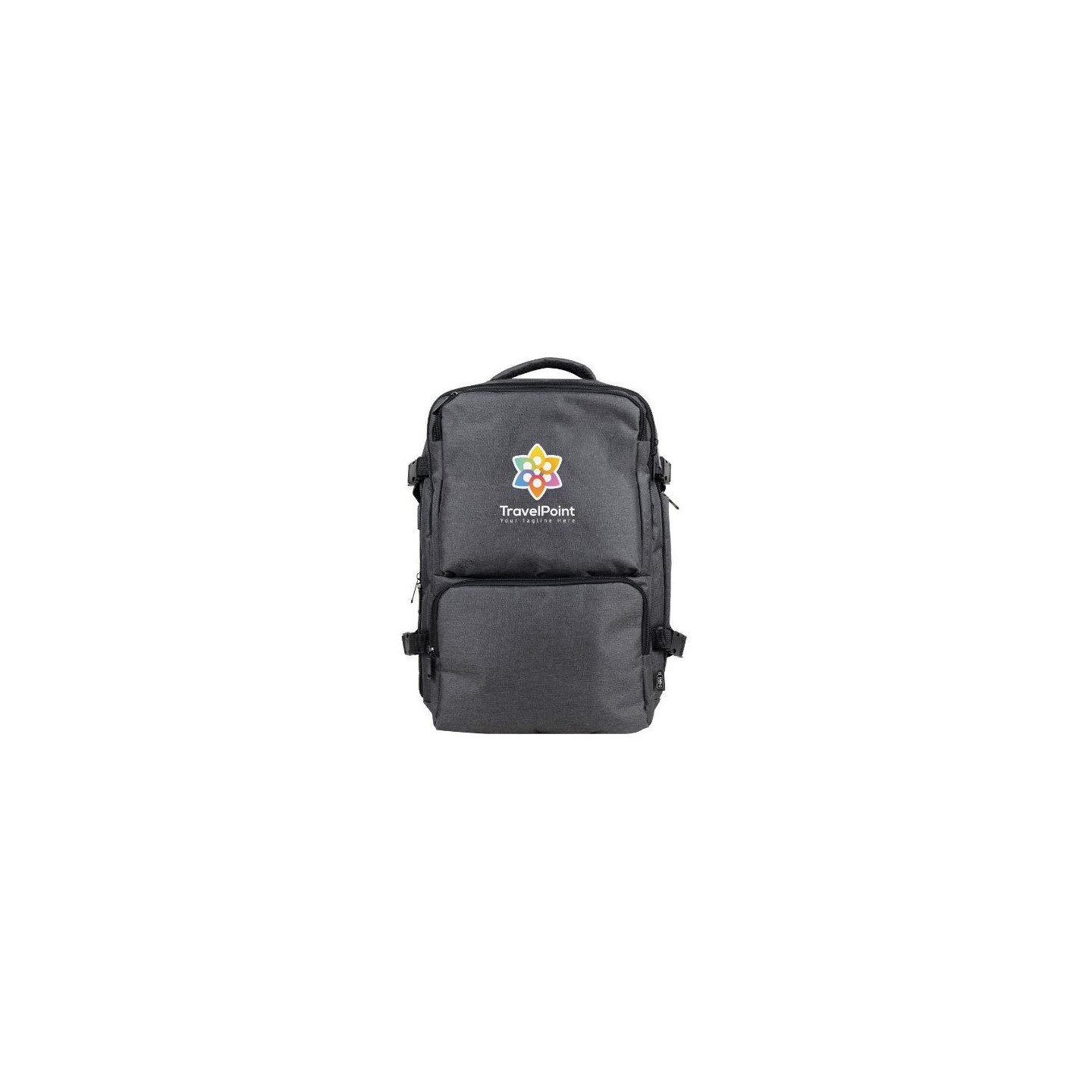 Mochila de negocios personalizable, fabricada en Poliéster Rpet 300D, con compartimento para portátil, zapatillero, carga USB y diseño urbano. Ideal para empresas.