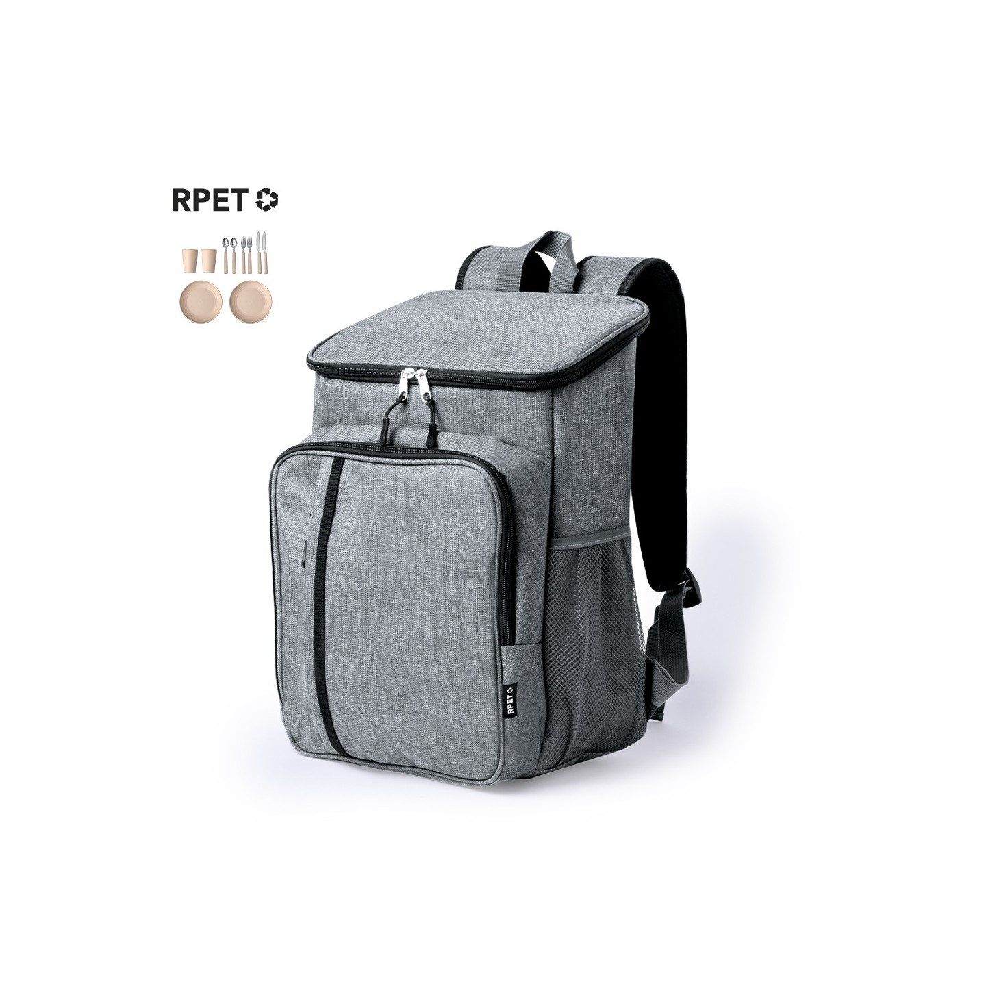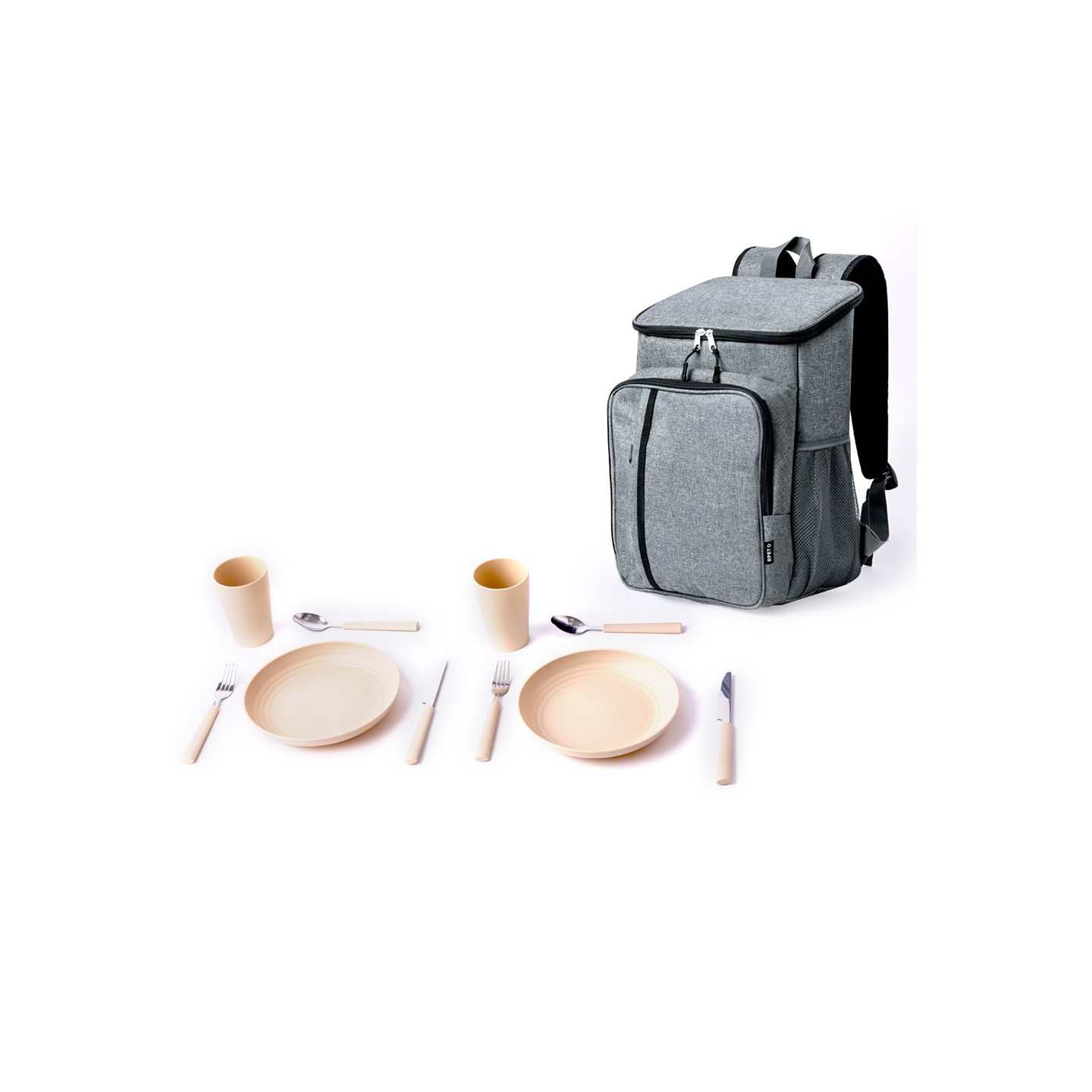 La Mochila Nevera Picnic Shira es de poliéster RPET 600D resistente. Incluye vajilla para 2 personas. Personalizable con tu logo para destacar tu marca.