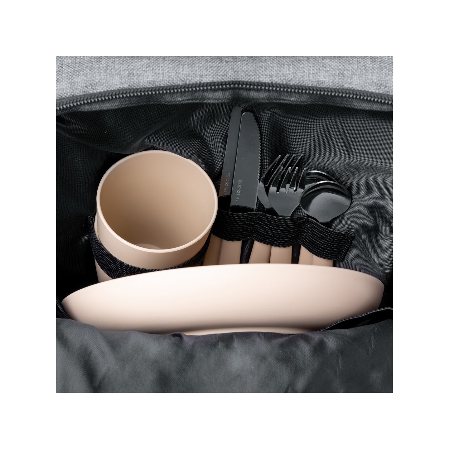 Además de su amplio compartimento nevera con interior en PEVA para mantener tus alimentos frescos, esta mochila incluye una completa vajilla para dos personas: 2 vasos, 2 cuchillos, 2 cucharas, 2 tenedores y 2 platos, todo listo para tu comodidad.