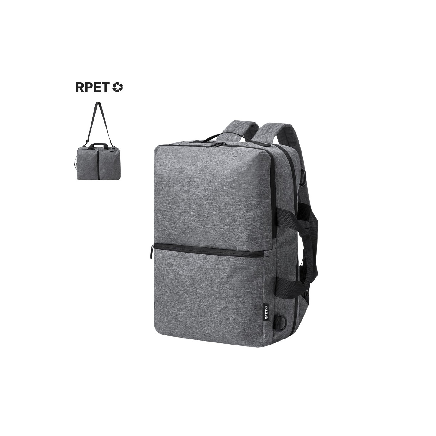 La Mochila Portadocumentos Makarzur es resistente RPET, portátil hasta 15", bolsillos múltiples. Personalizable. Presentada en bolsa reciclada