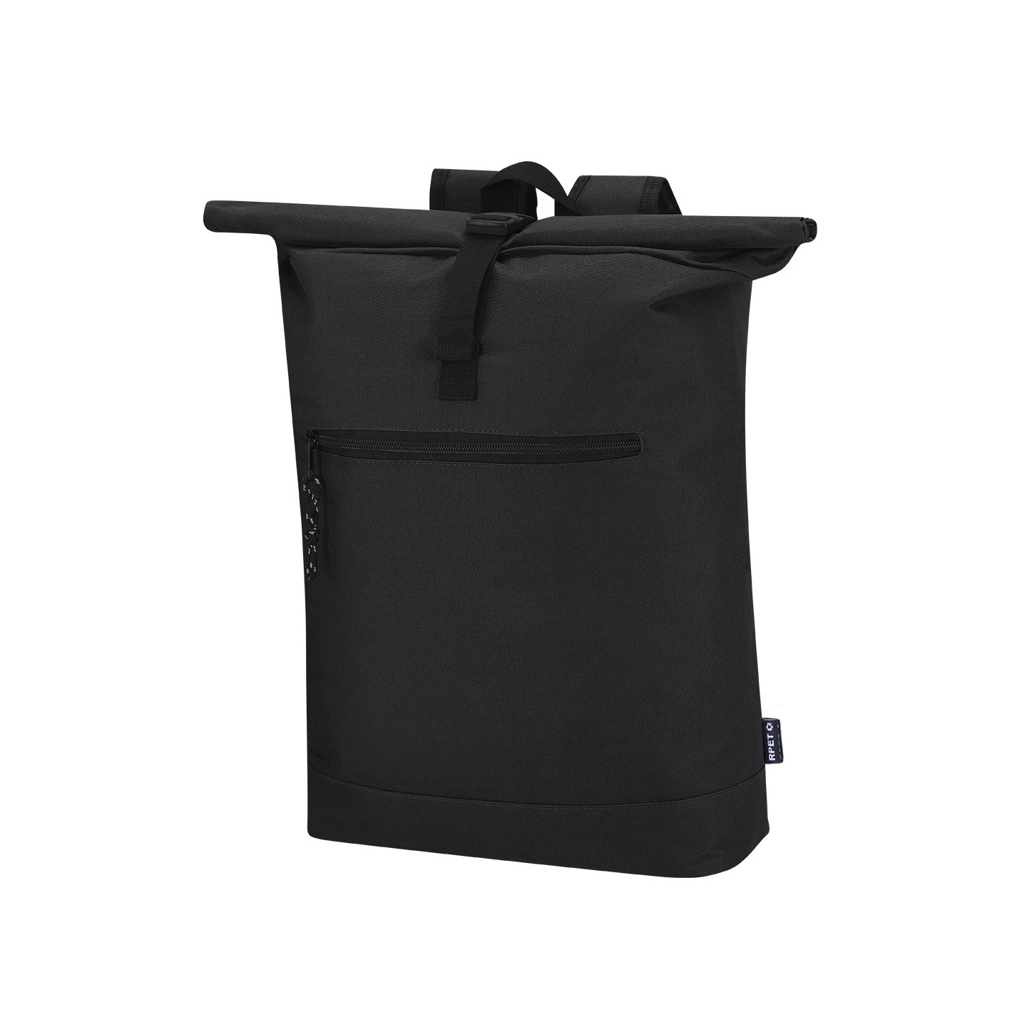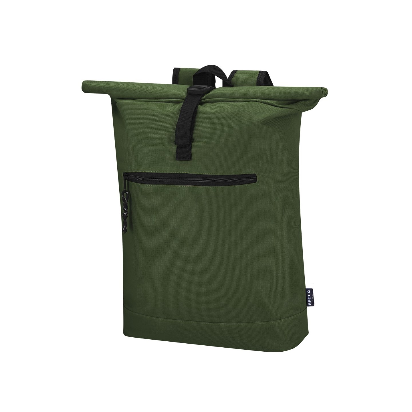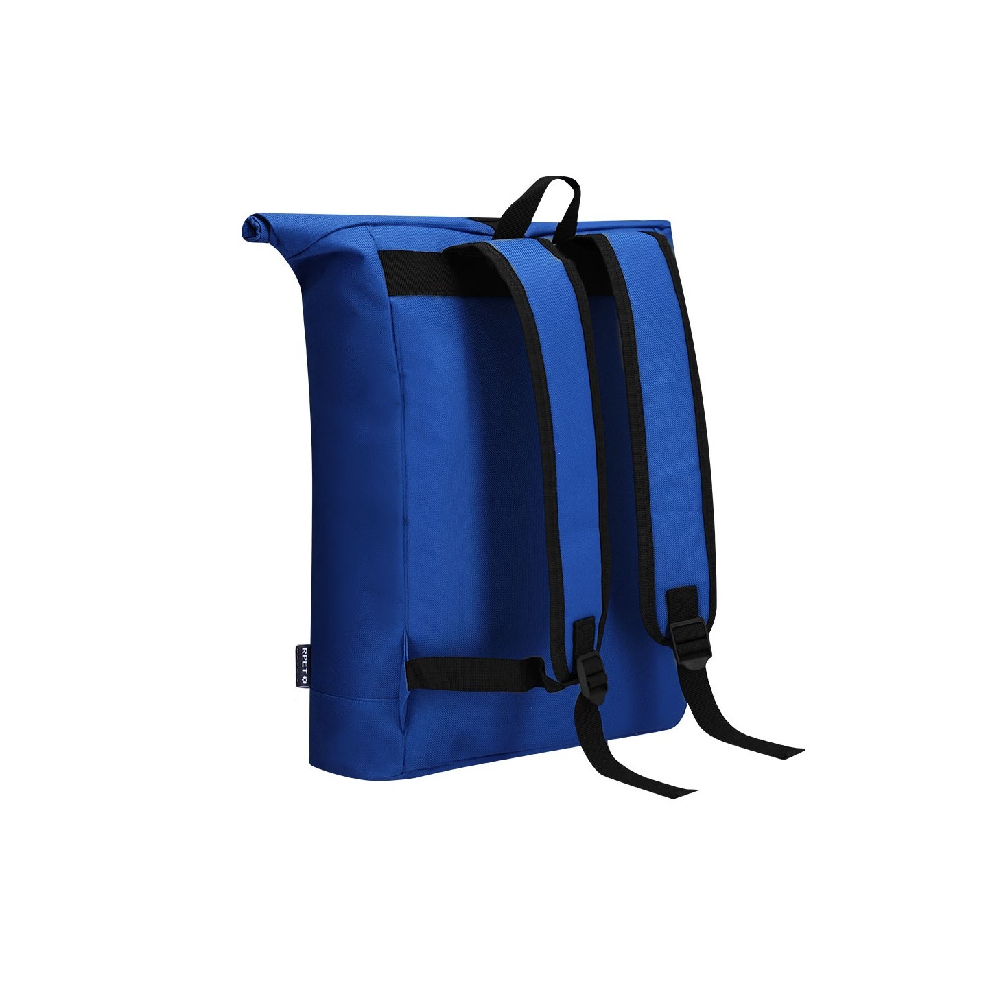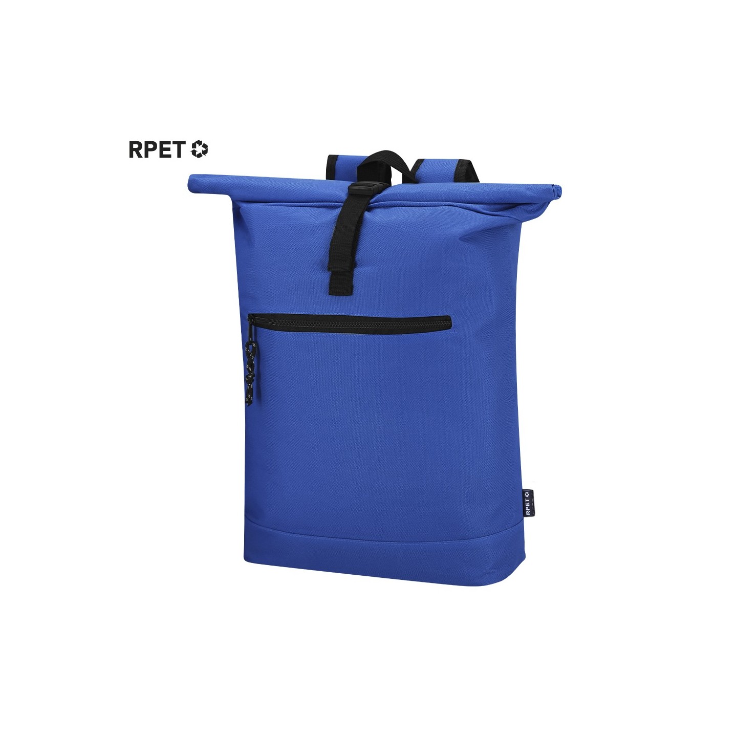 Mochila Roll-Top de poliéster RPET 600D con compartimento para portátil de 15", acolchonada y personalizable. Ideal para empresas comprometidas con la sostenibilidad.