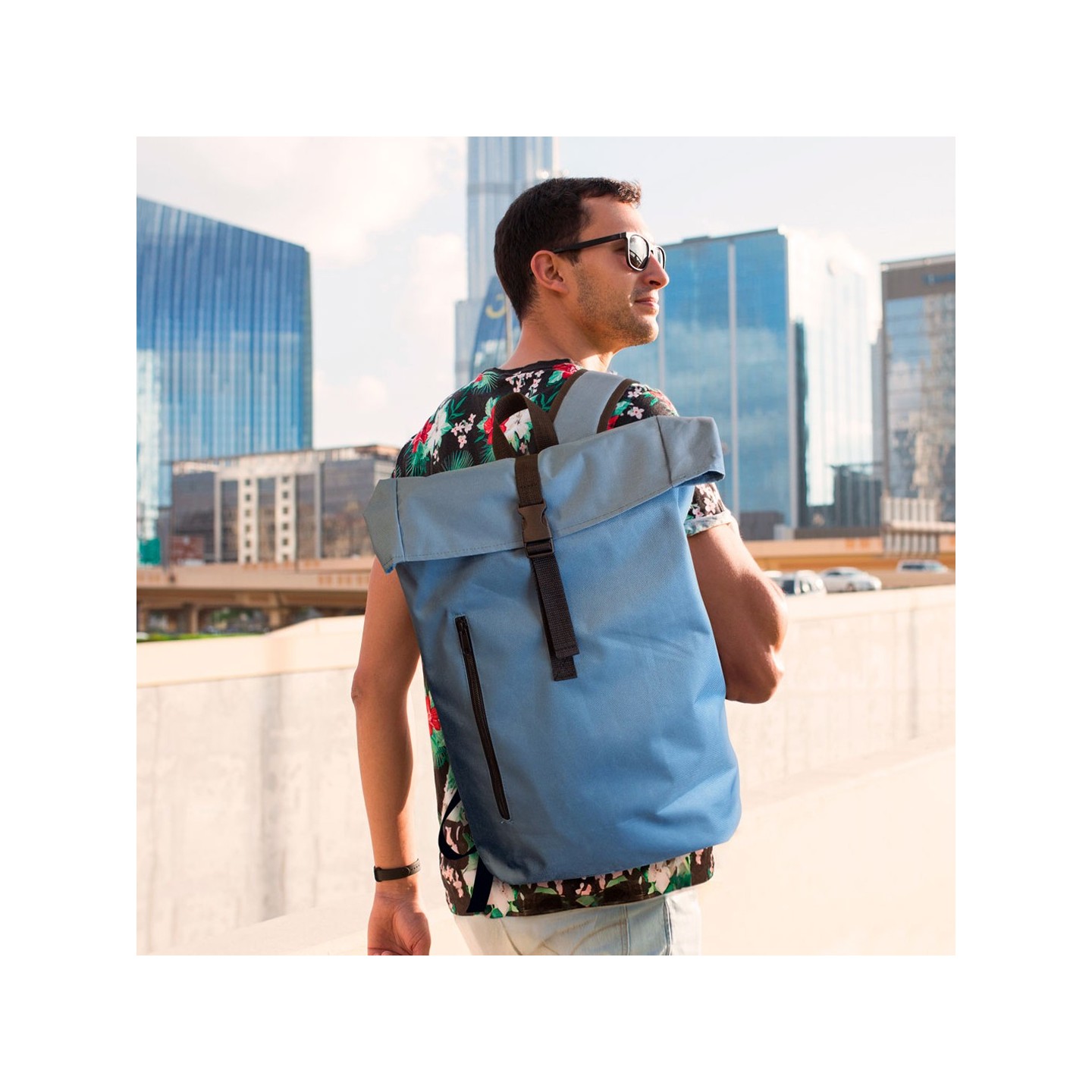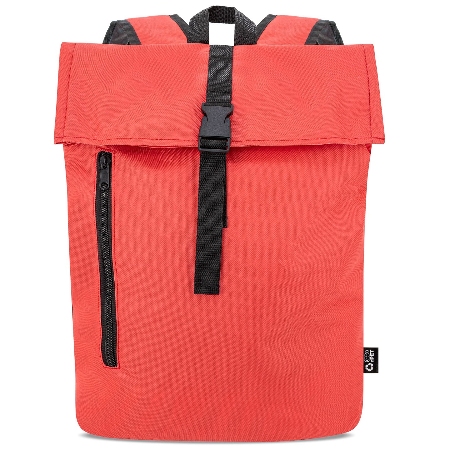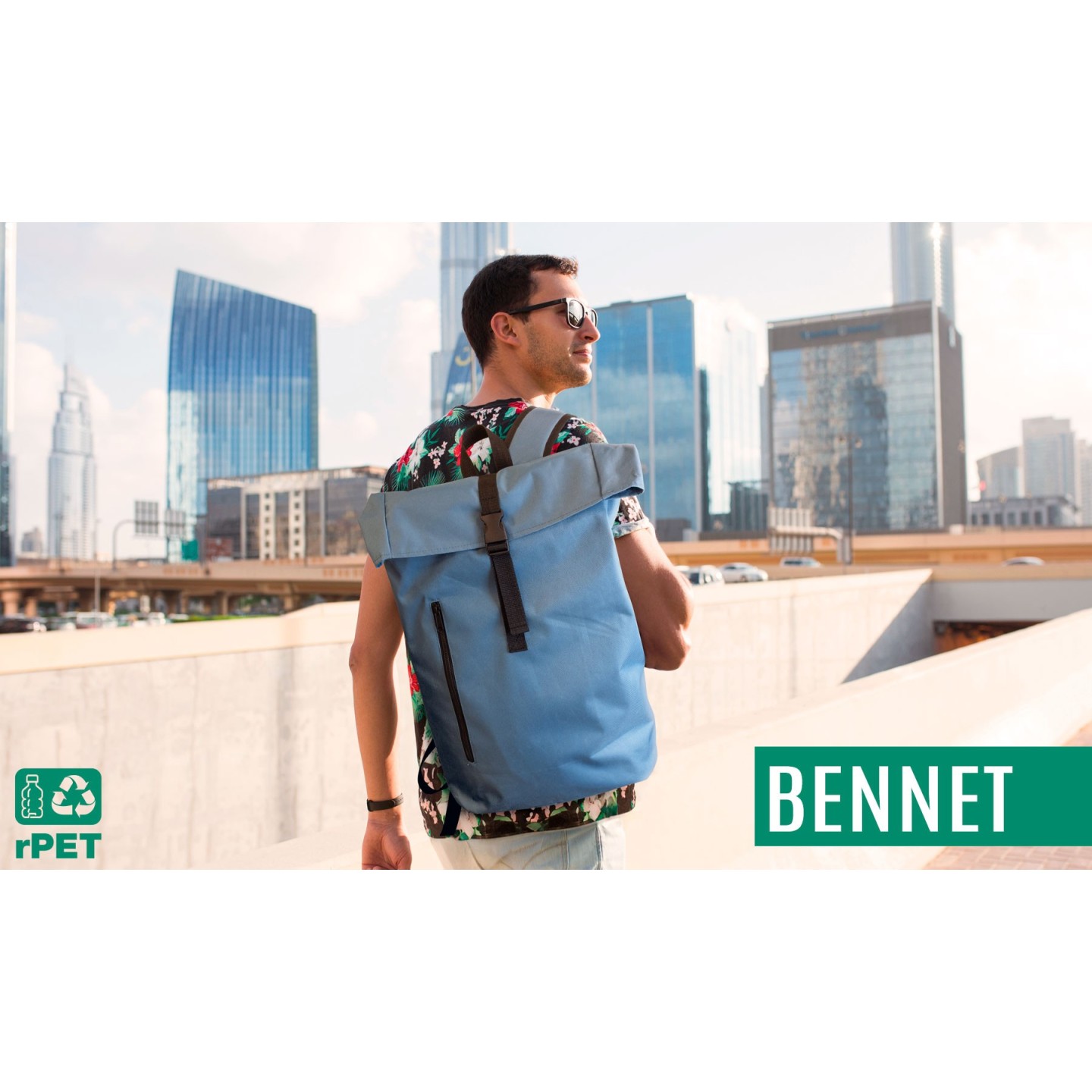 Mochila RPET BENETT de gran capacidad con diseño Roll-Top en Poliéster 600D y RPET. Cierre de hebilla, bolsillo frontal con cremallera, asa de mano y cintas ajustables.