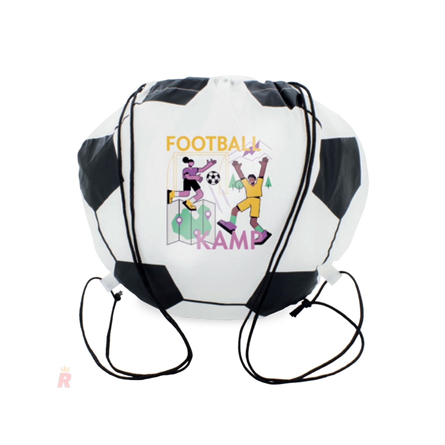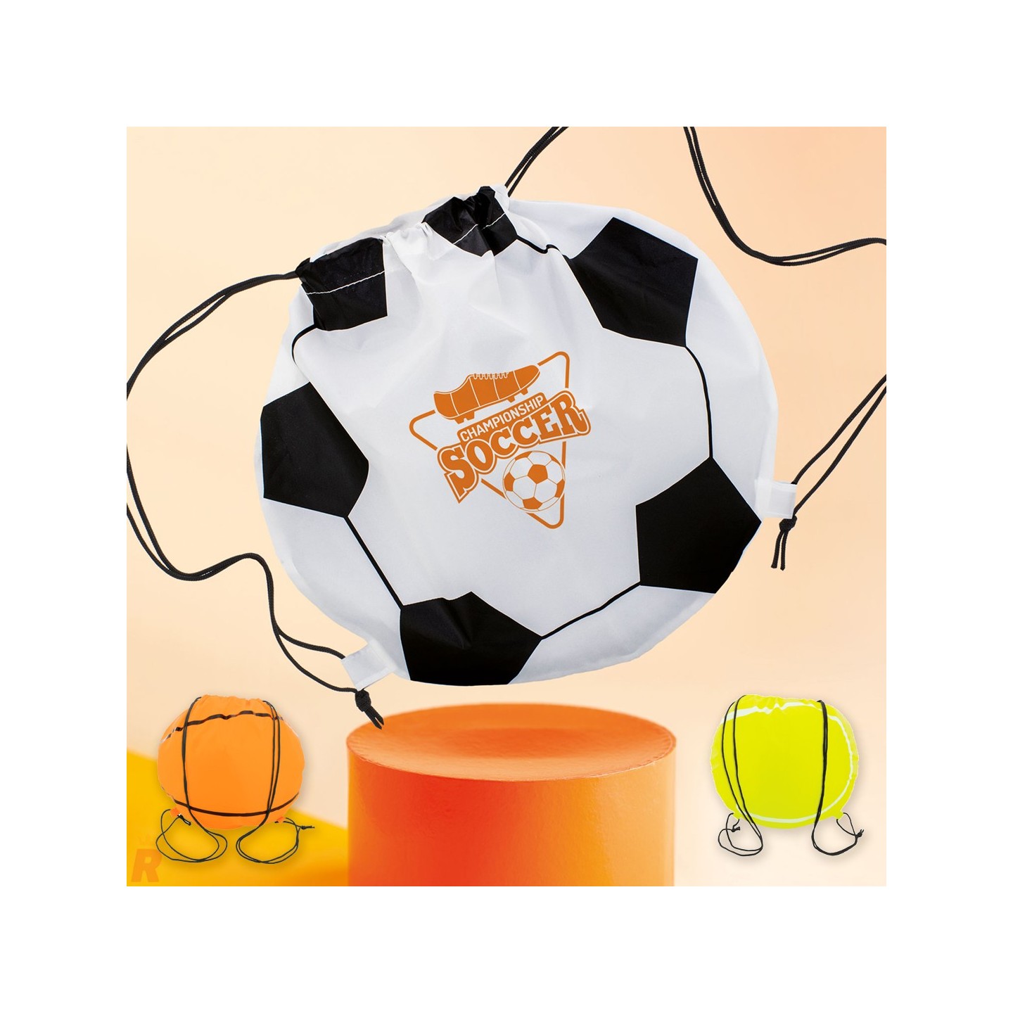 Mochila de cuerda con diseño deportivo, fabricada en poliéster 210T. Disponible en formas de balón de fútbol, baloncesto y tenis. Ideal para campus, escuelas y eventos deportivos