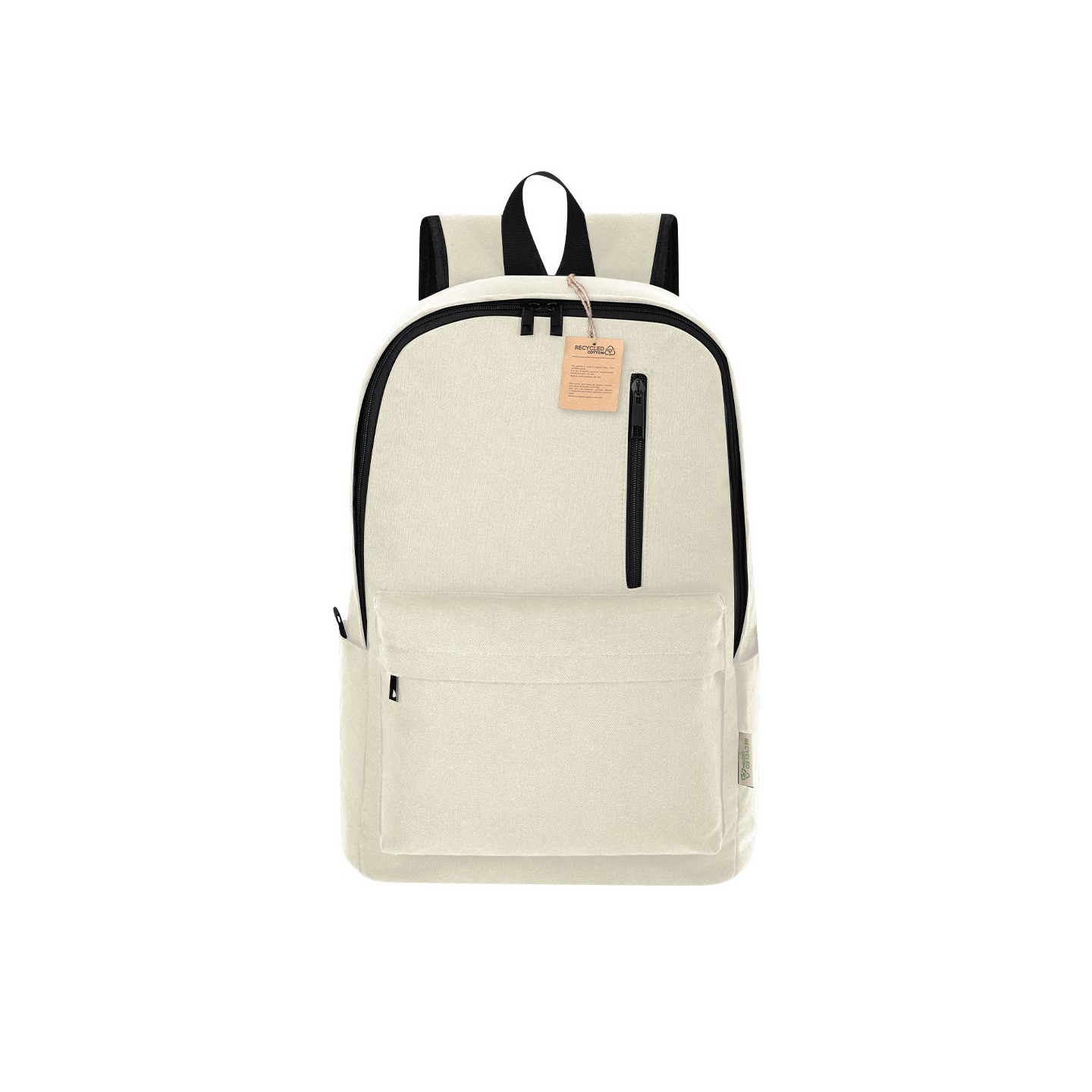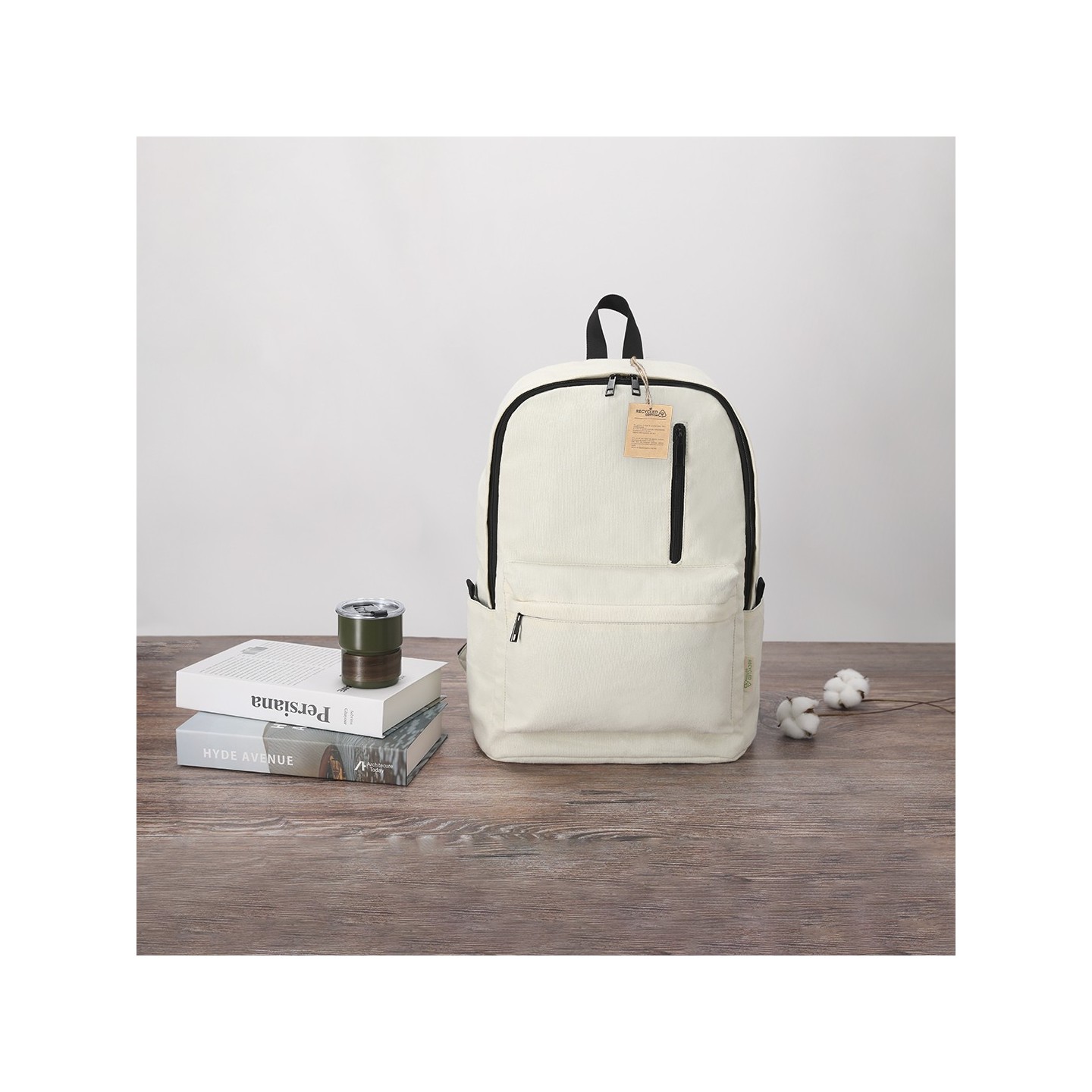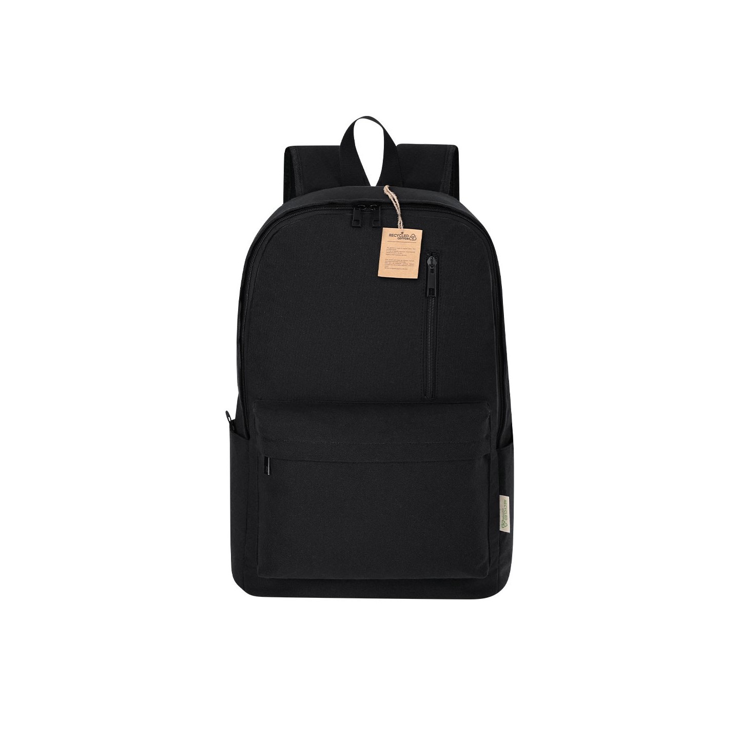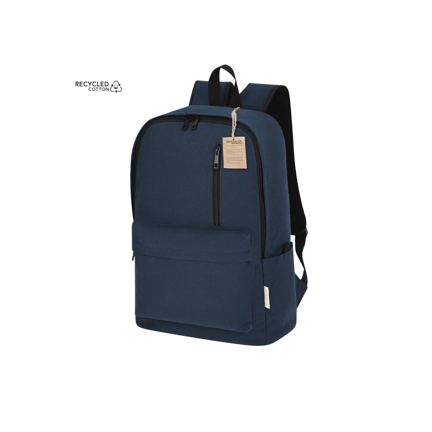 Mochila personalizable de algodón reciclado, con compartimento para portátil, bolsillos frontales y laterales, y cinta para trolley. Ideal para viajes y uso diario.