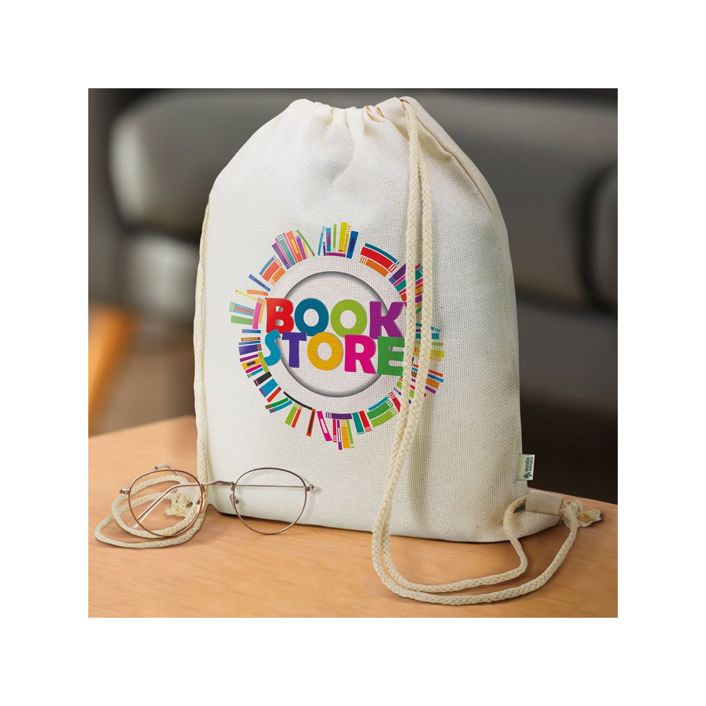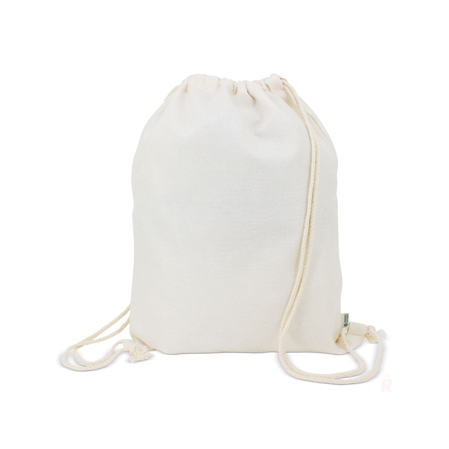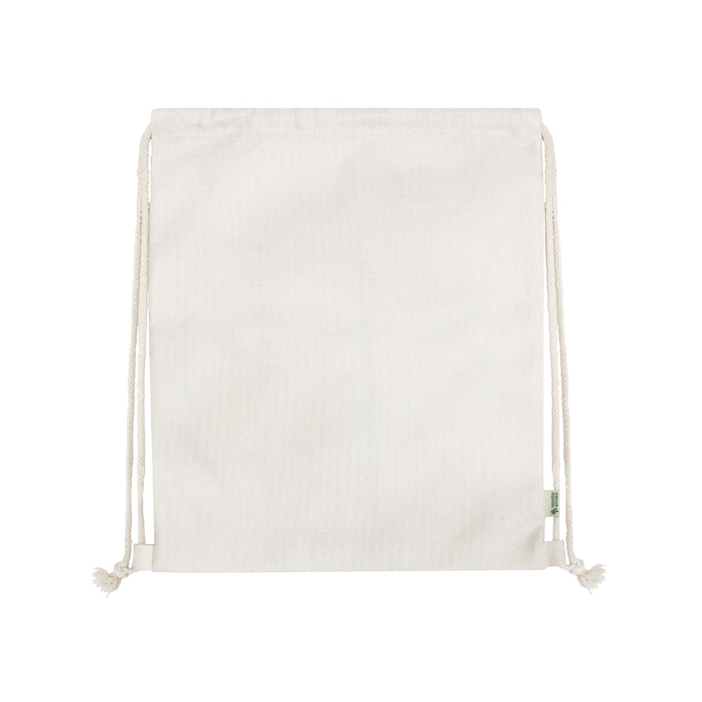 Mochila de cuerdas ecológica, fabricada en poliéster reciclable y reutilizable. Especial para sublimación, con autocierre y diseño en color natural.