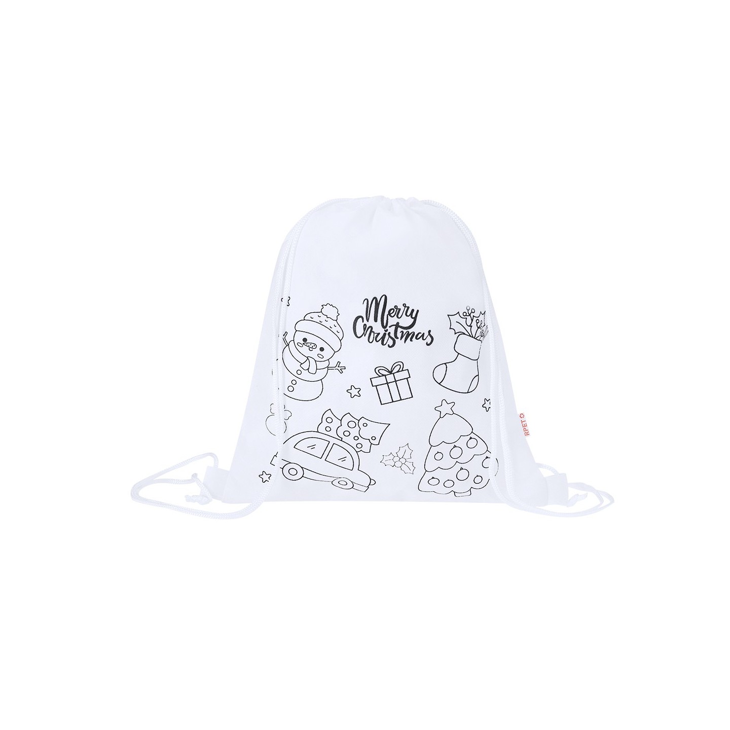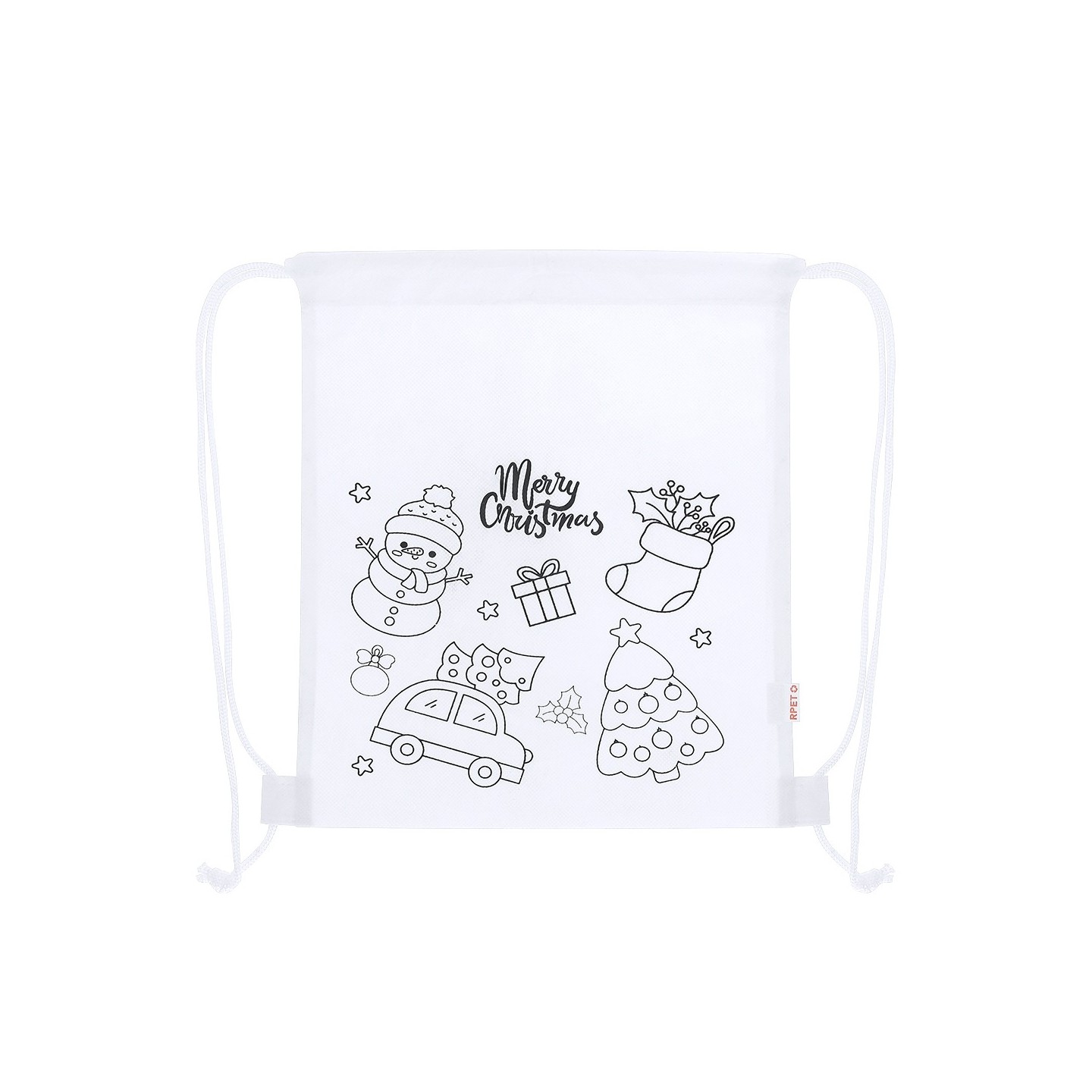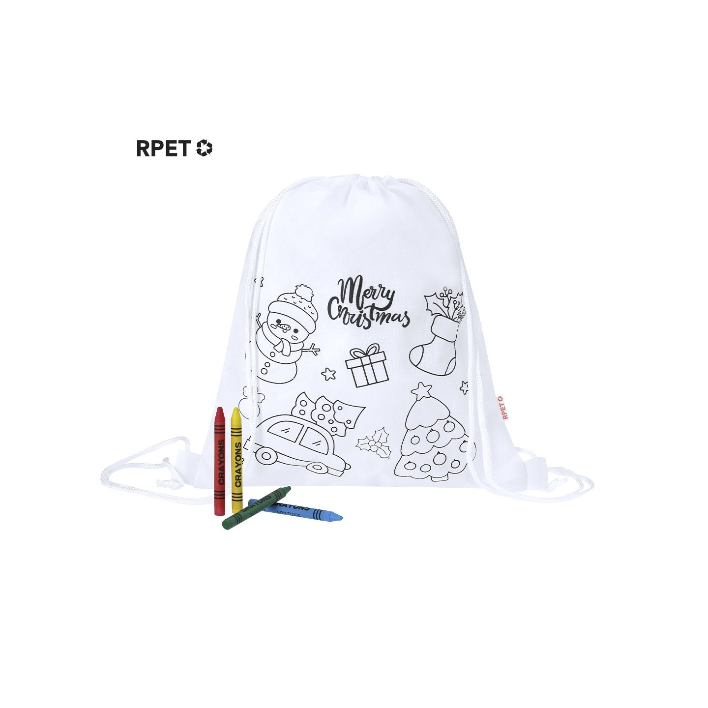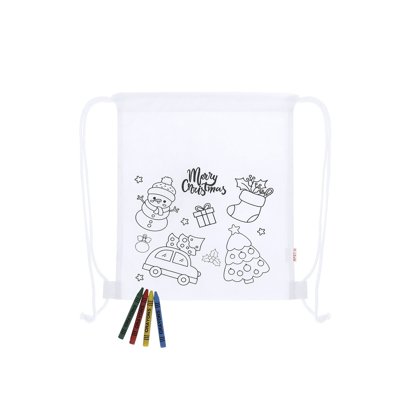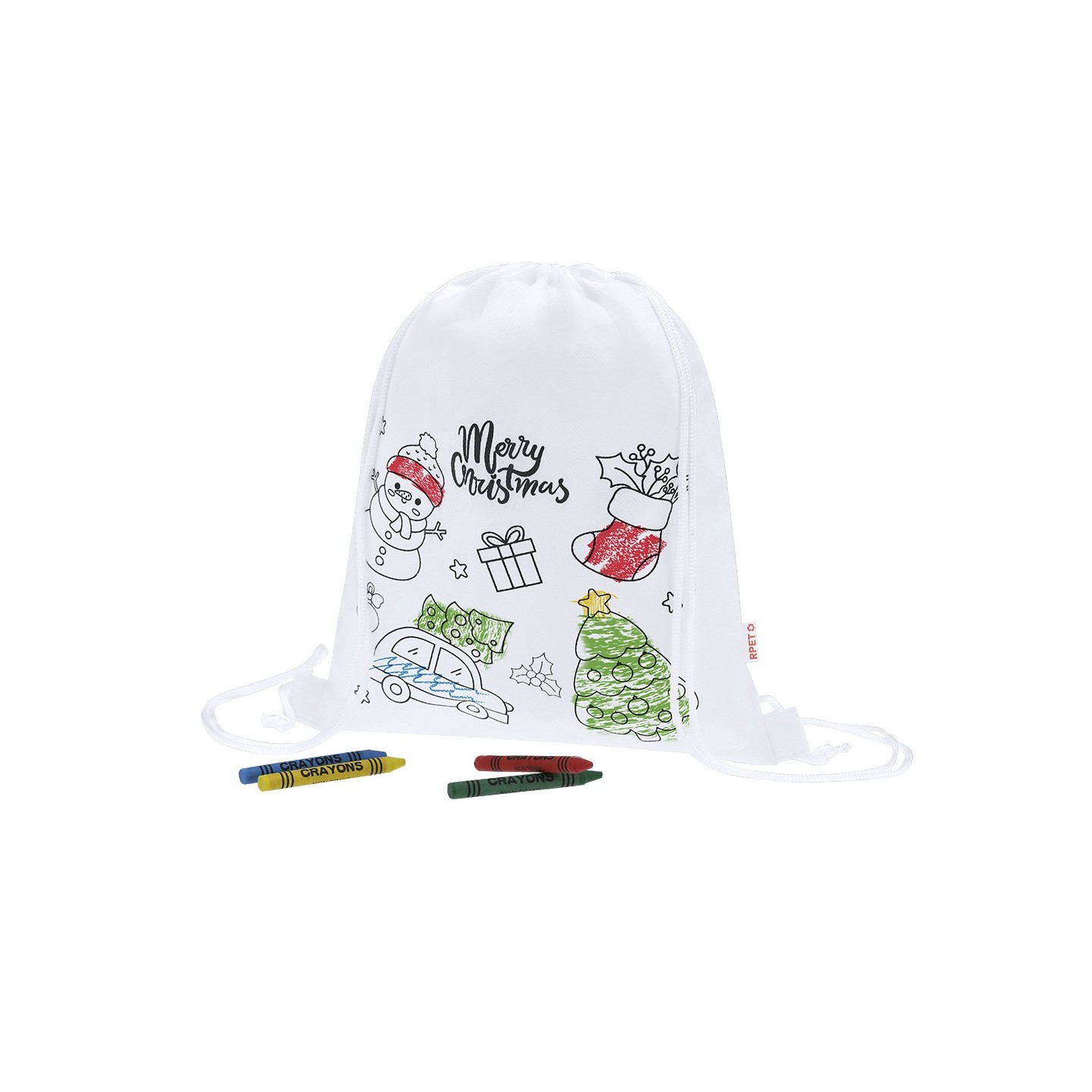 Mochila infantil navideña de non-woven RPET, diseñada para colorear con 4 ceras incluidas. Con cuerdas de autocierre y etiqueta distintiva RPET. Personalizable con logotipo. Perfecta para regalos sostenibles.